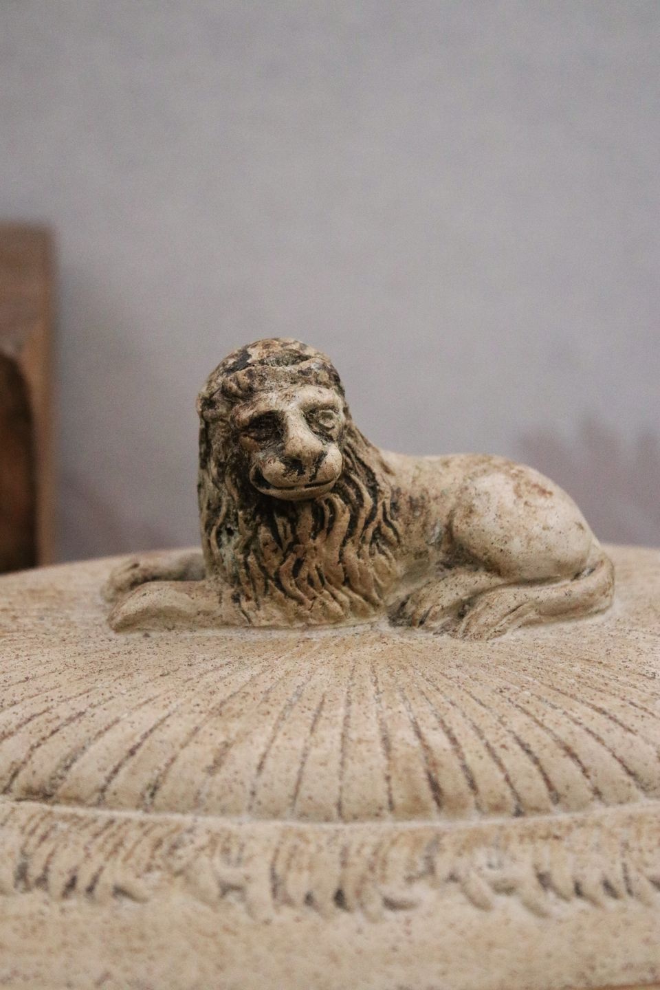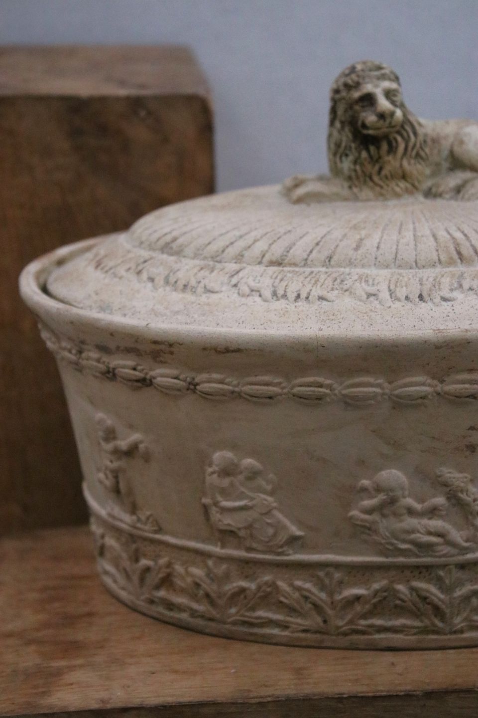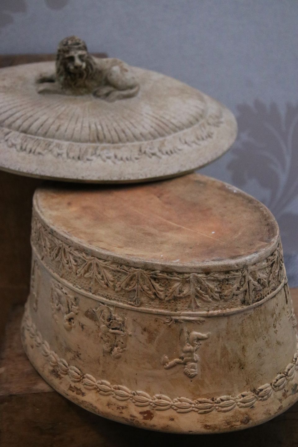 Antik svensk oval empire fajance terrin fra 1810-40 med fine dekorationer og løve liggende på låget.