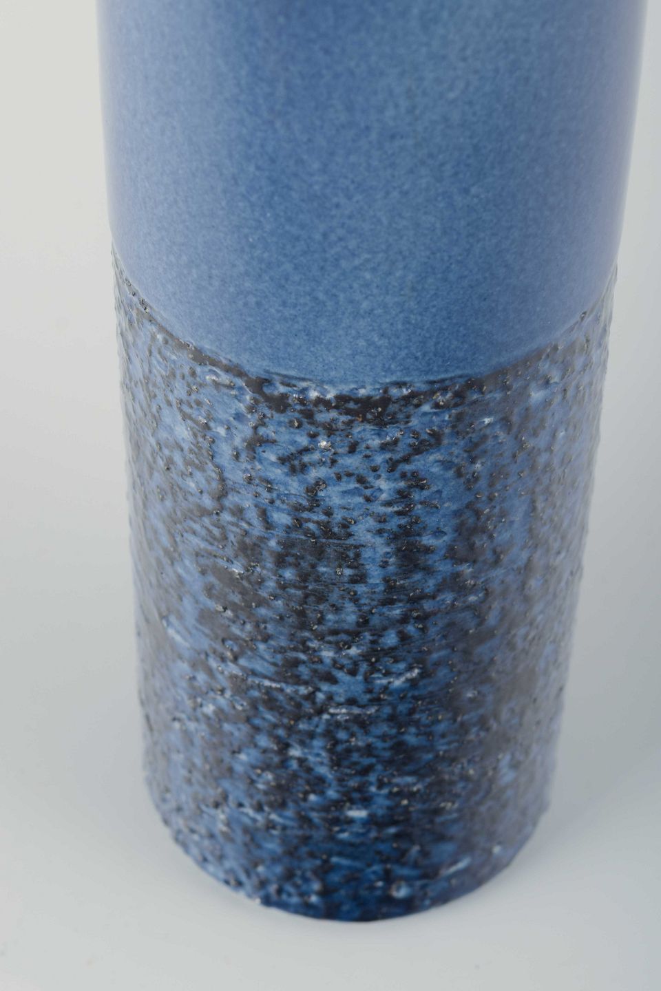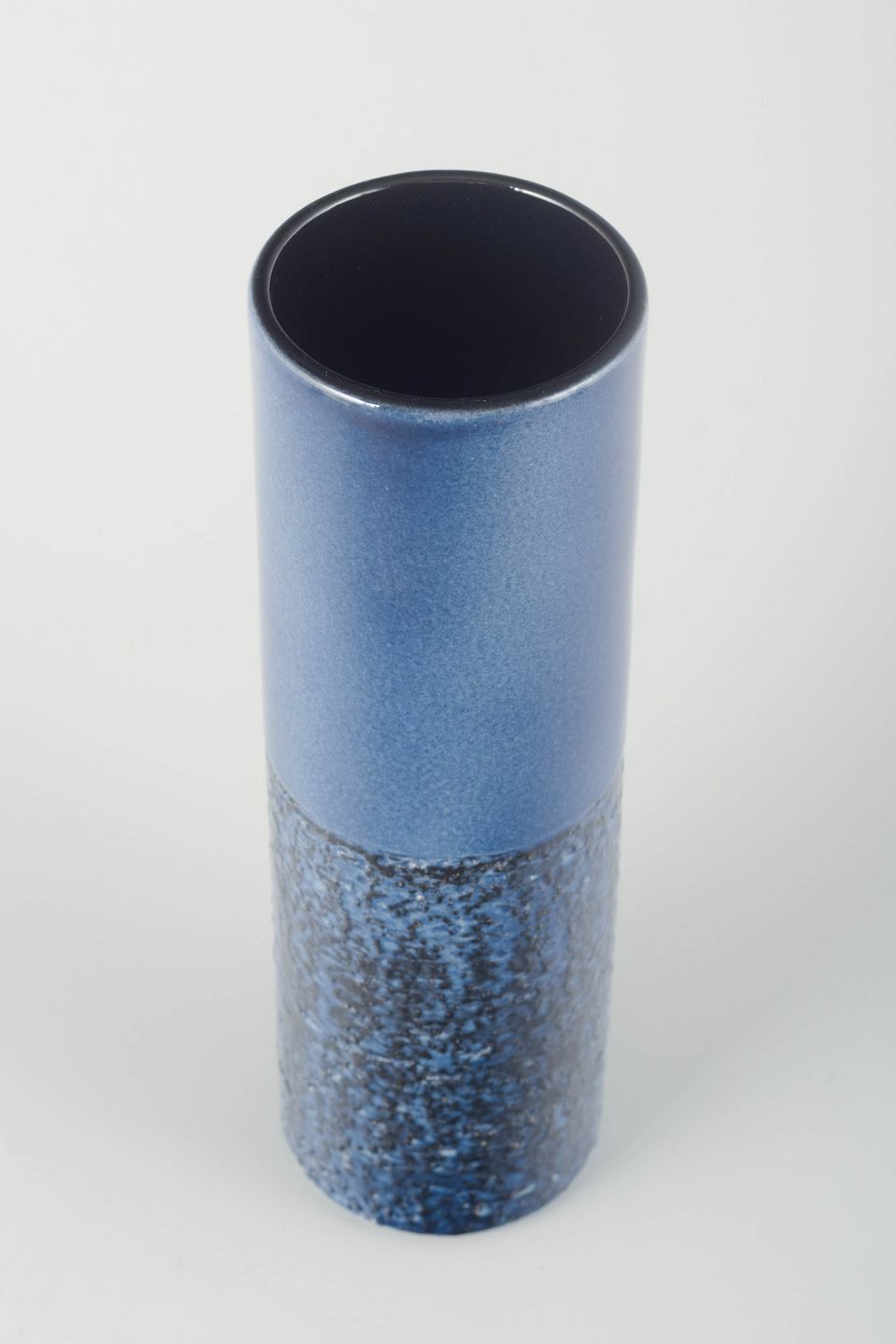 Elegant, slank vase i stentøj med todelt glasur – øverste halvdel i blank mellemblå tone og nederste del med mørkere, krystallinsk struktur i blå og sorte nuancer.