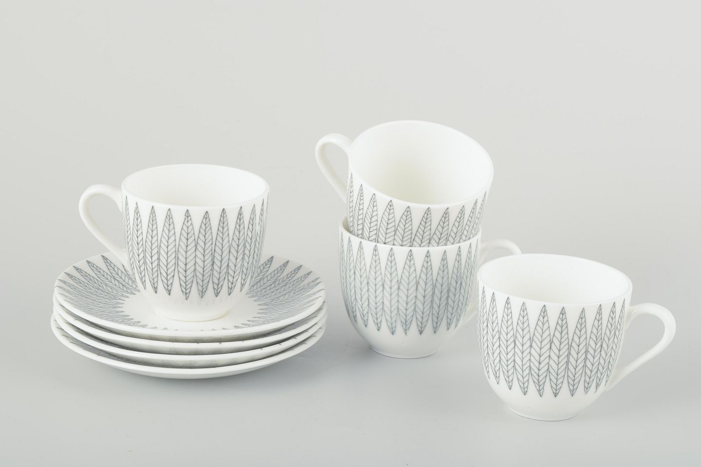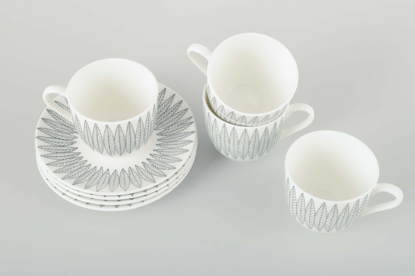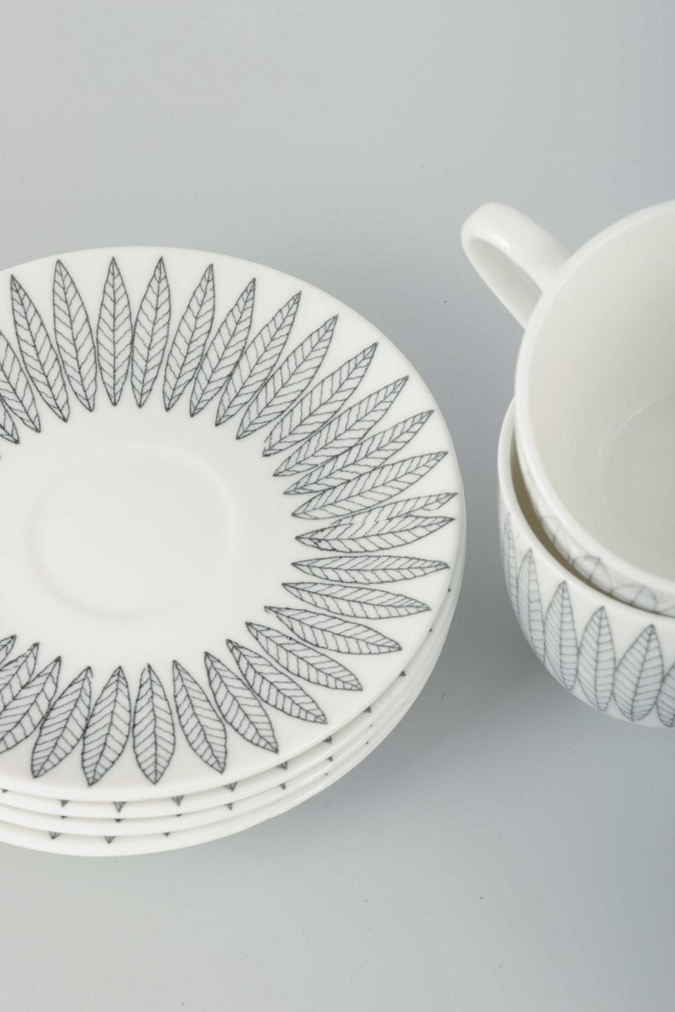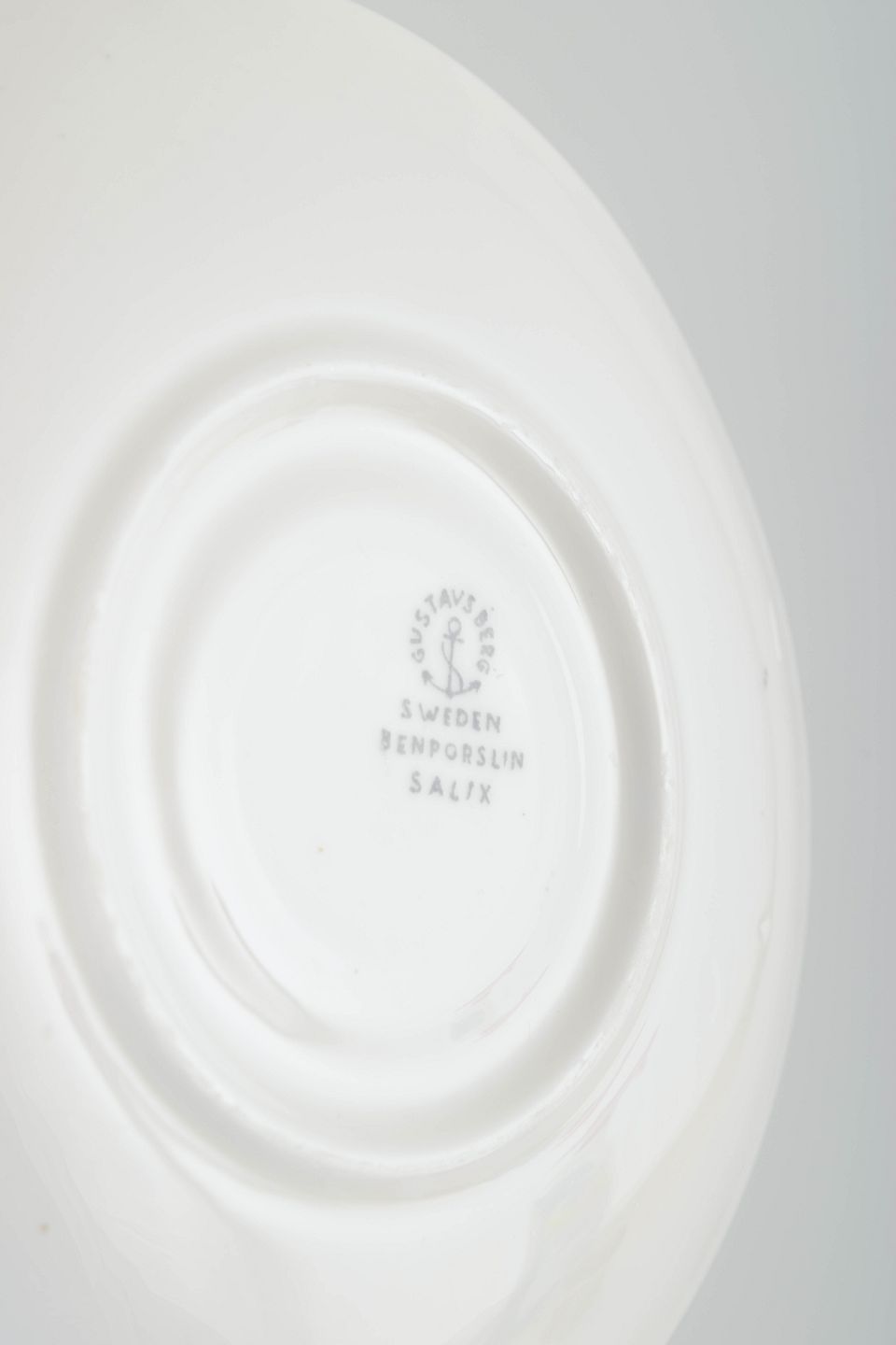 Fajance med det karakteristiske “Salix”-mønster i grå på hvid bund, designet af Stig Lindberg.