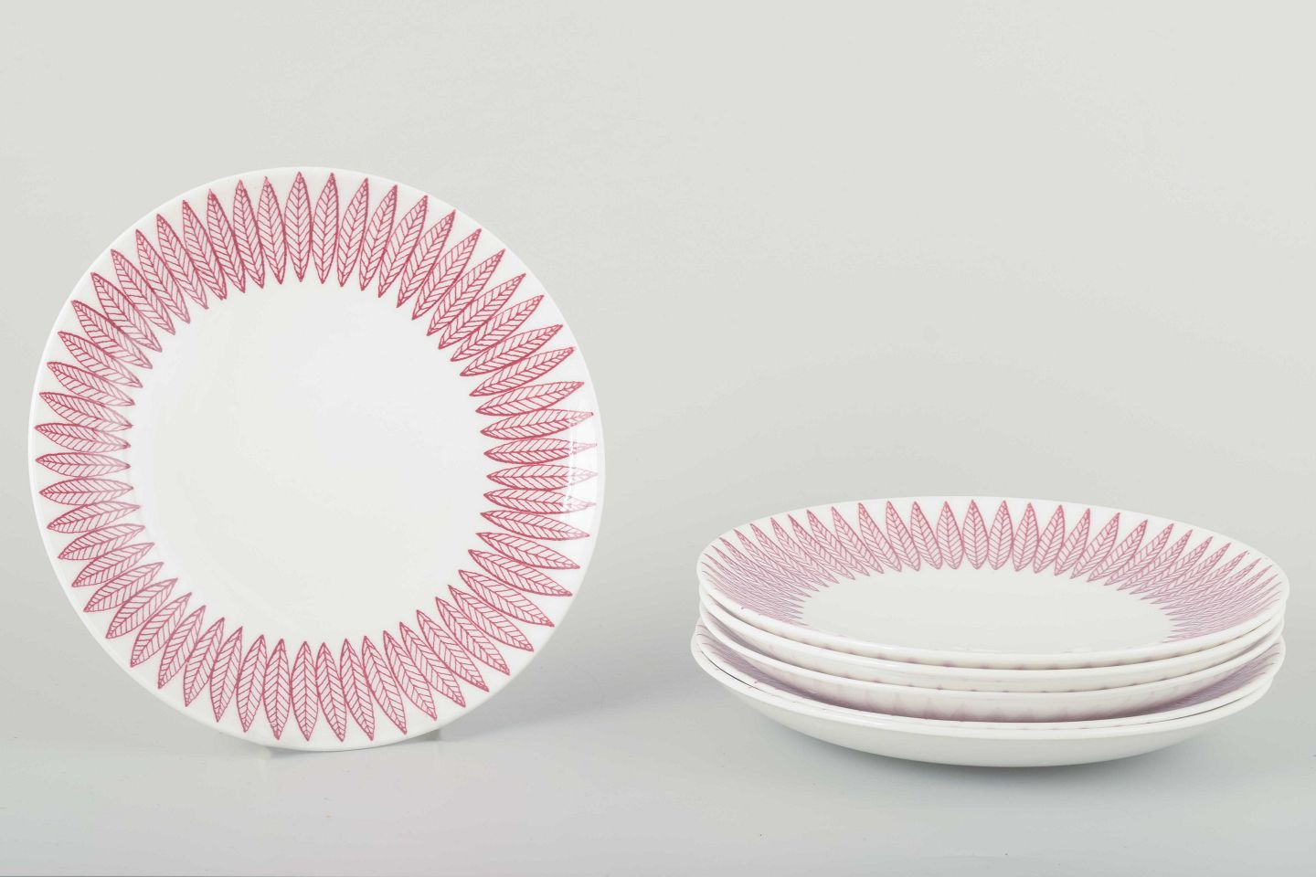 Sæt på seks kagetallerkener i fajance med det karakteristiske “Salix”-mønster i rosa på hvid bund, designet af Stig Lindberg.