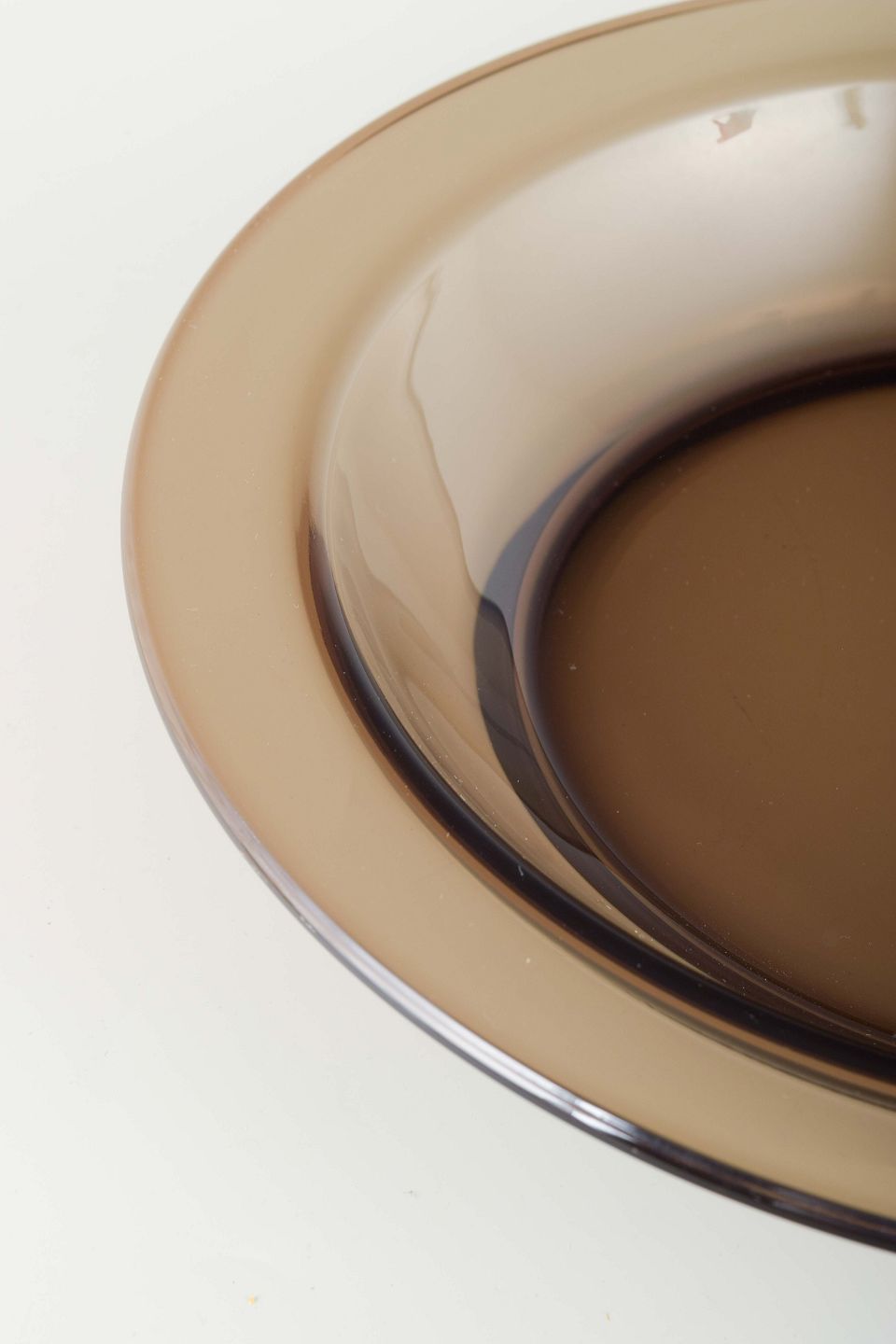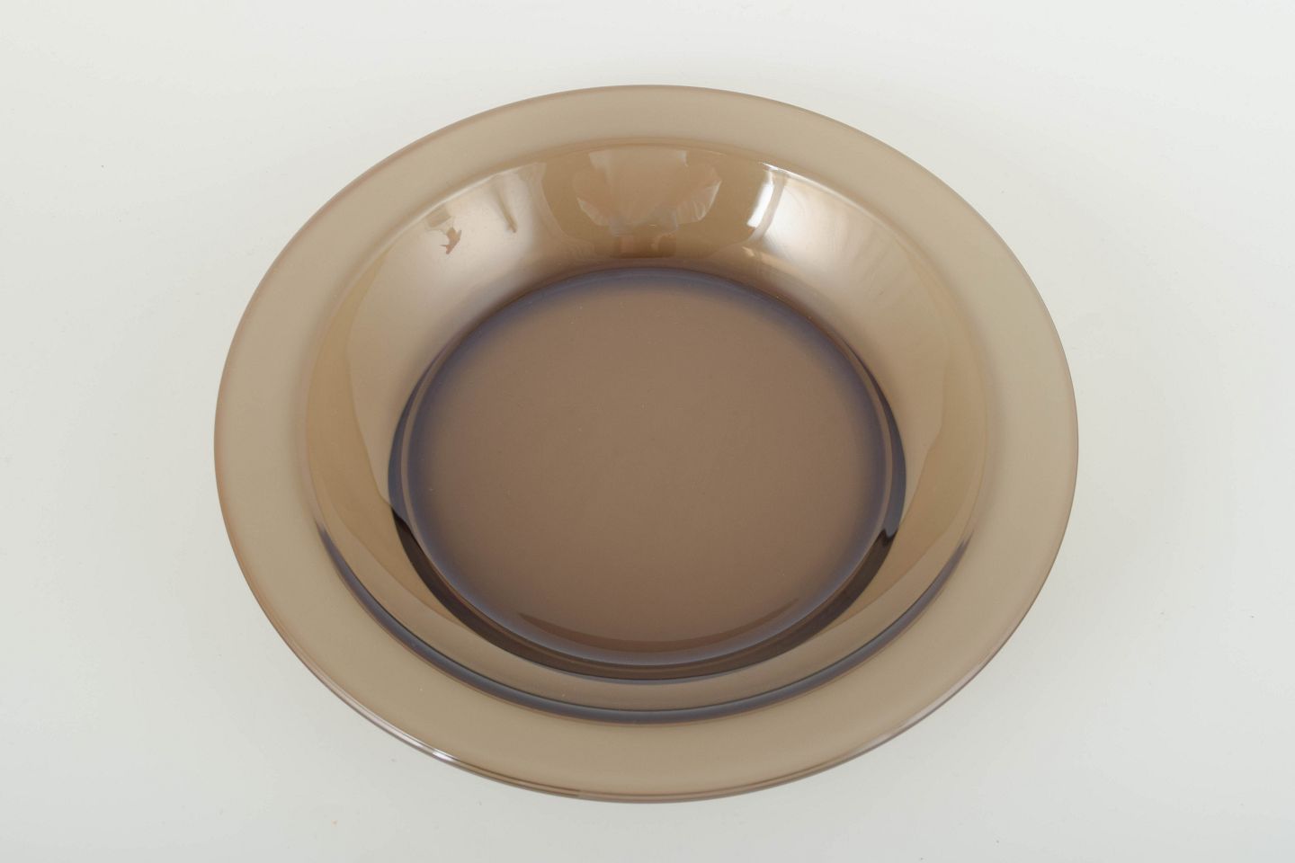 Dekorativ skål i røgfarvet glas med rund form og bred kant. Et klassisk eksempel på fransk husholdningsdesign fra Arcoroc, kendt for sin robuste og tidløse glasproduktion til både professionel og privat brug.