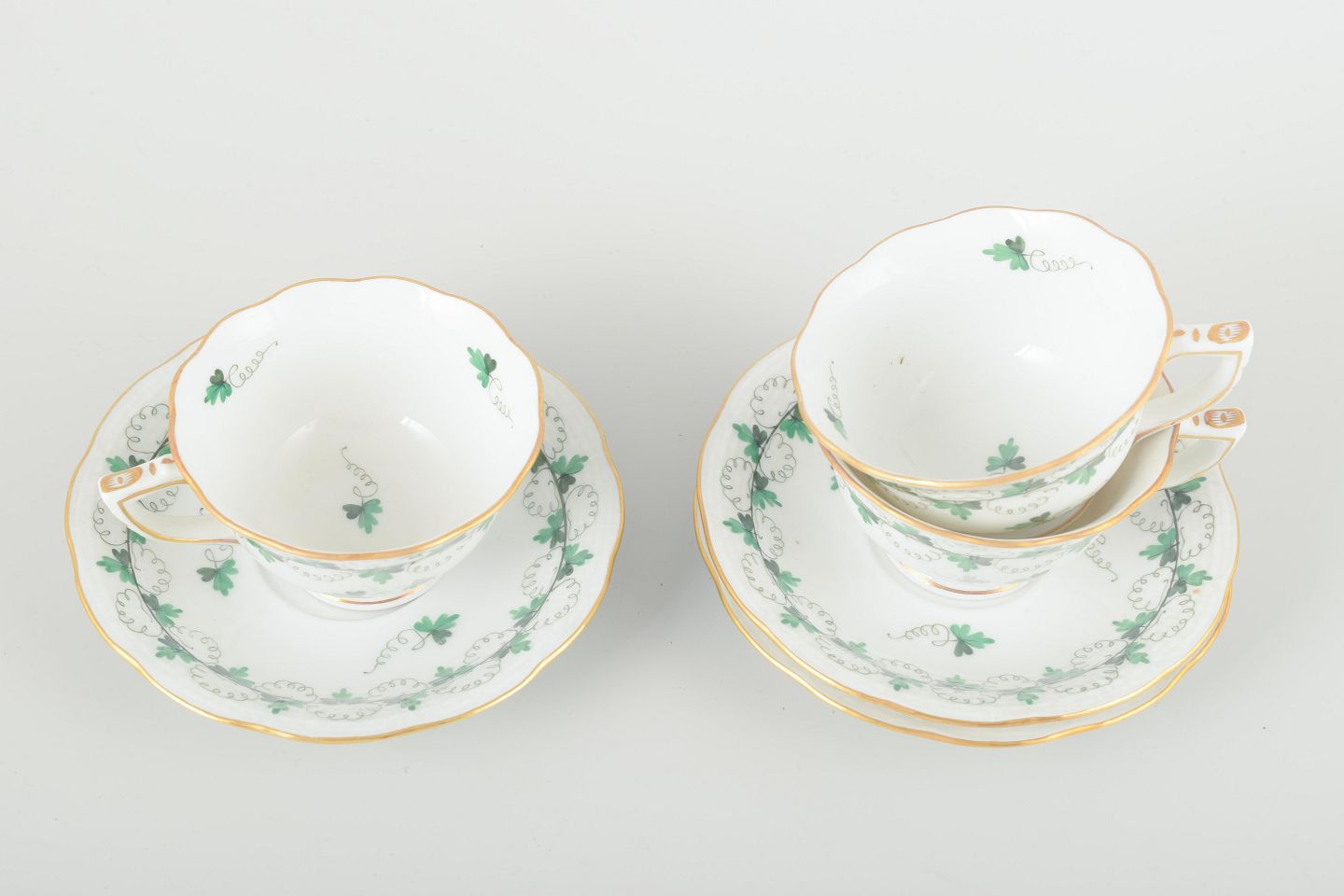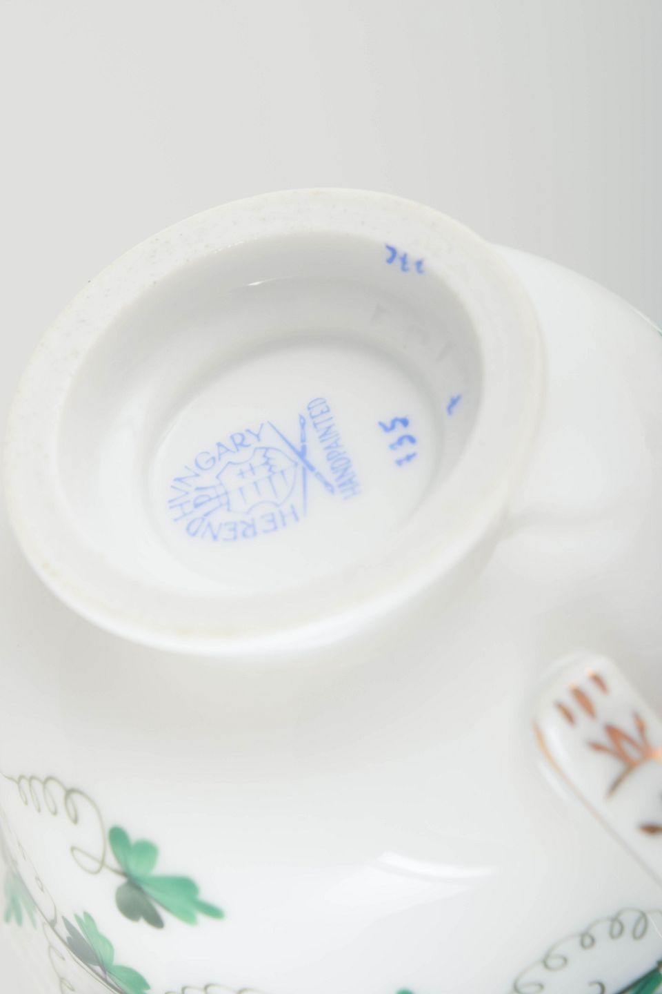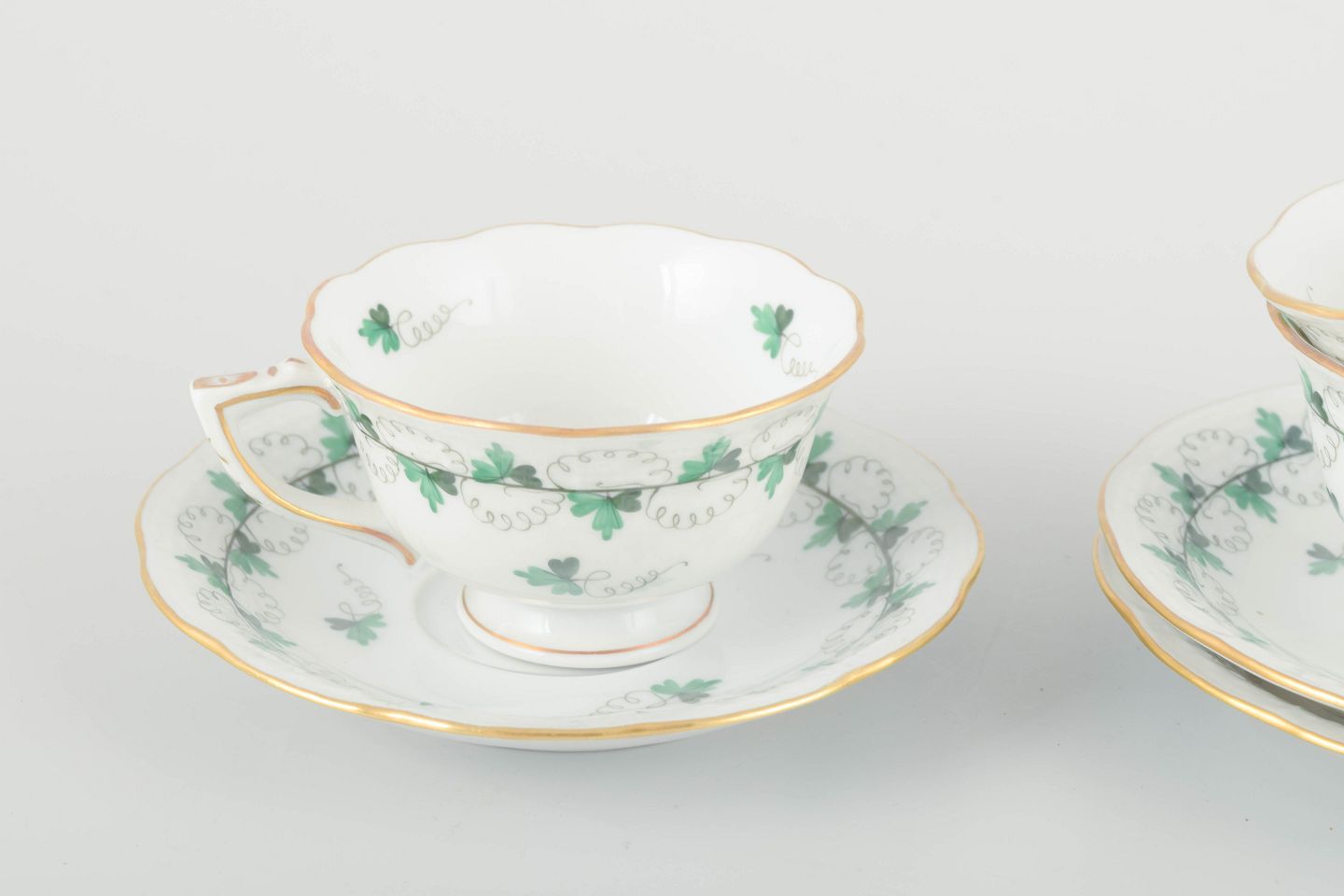 Elegant porcelænsservice med håndmalet grøn blomsterranke og forgyldte kanter. Klassisk Herend-dekoration med fine detaljer og let buet form.