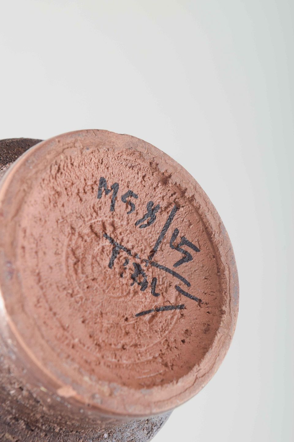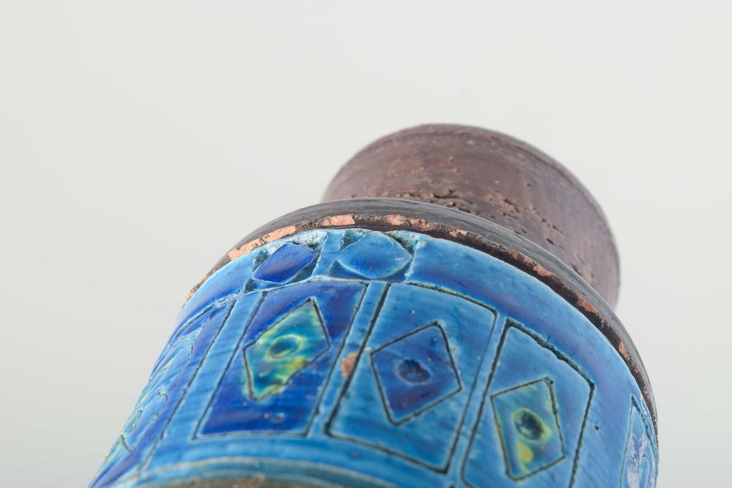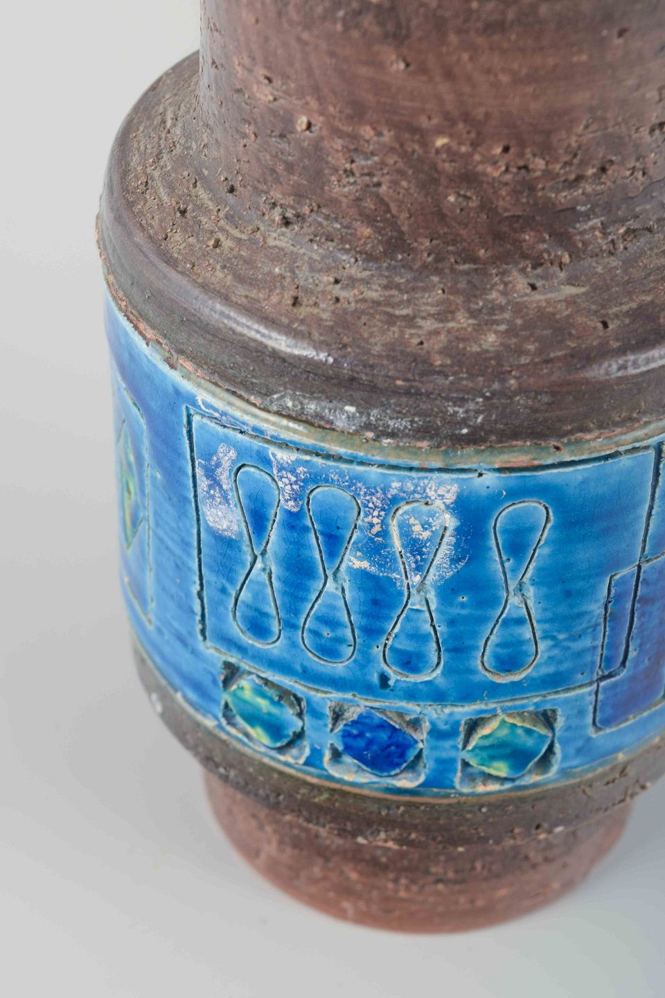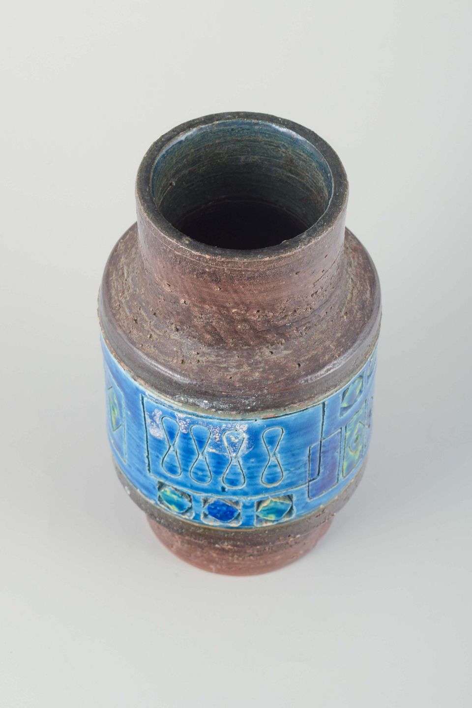 Cylindrisk vase i stentøj med rustik brun glasur og dekorativt bånd i karakteristisk “Rimini Blu” glasur med geometrisk reliefdekoration i blå, turkis og grønne nuancer.