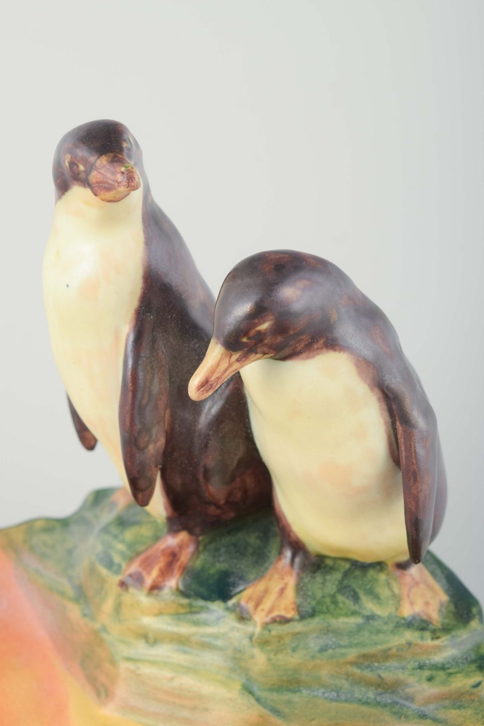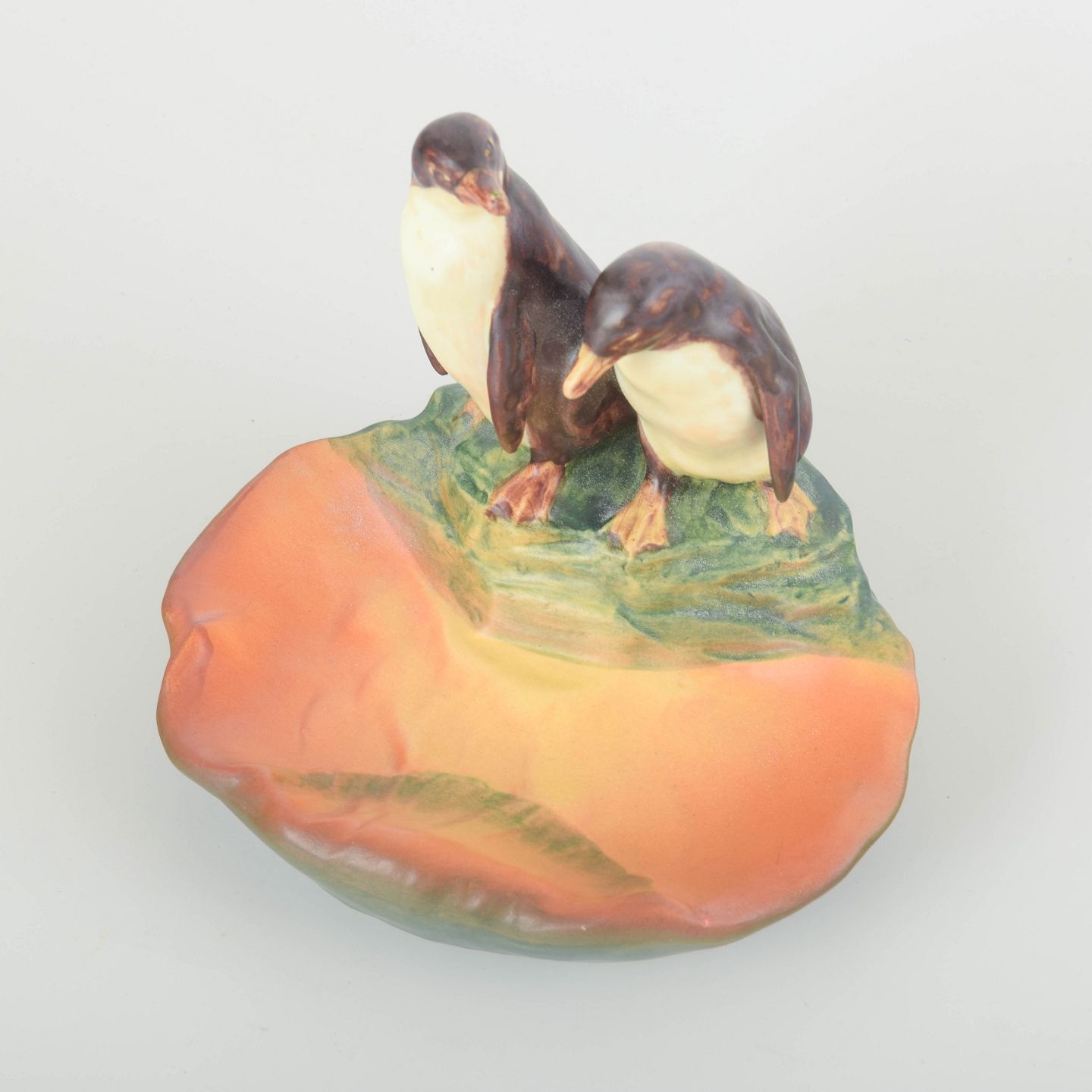 Dekorativ skål med to pingviner stående på kanten. Glasur i grønne, brune og cremefarvede nuancer med naturlig overfladestruktur. Et sjældent figurativt arbejde fra Ipsens Enke, 1920’erne.