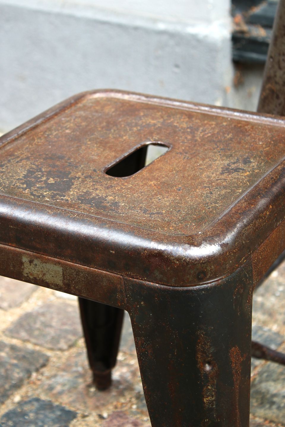 Original gammel fransk Tolix taburet i afpudset metal med fantastisk fin patina. H: 45cm. Top 31x31cm. Bund 40x40cm.