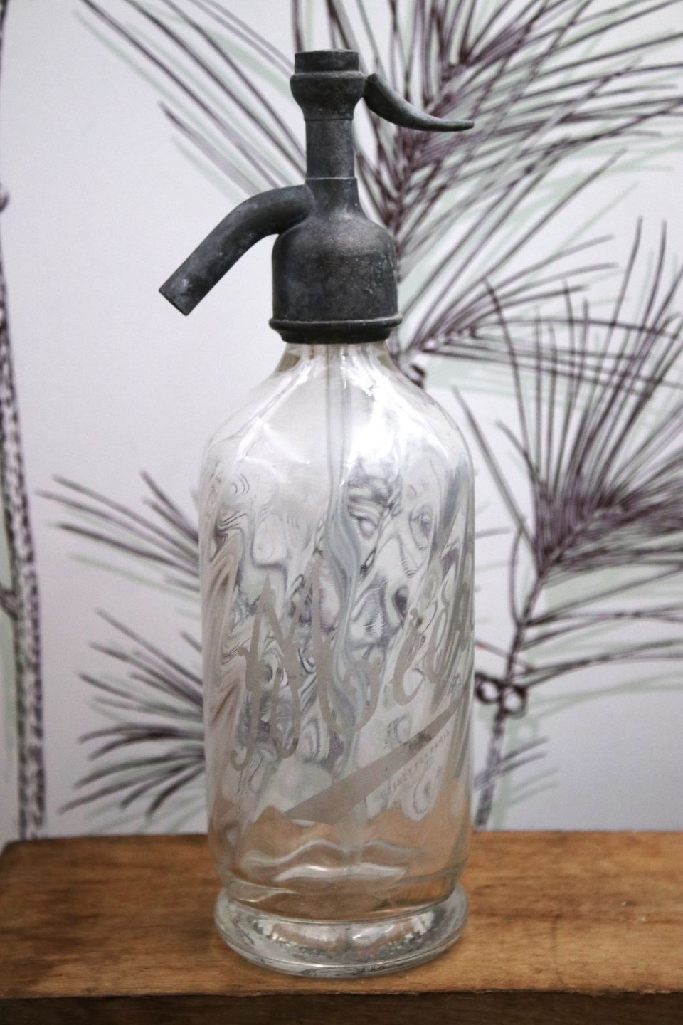 Dekorativ , sjælden fransk mini glas sifon fra begyndelsen af 1900 tallet i klart glas med graveret skrift på siden af sifonen og en fin patina.