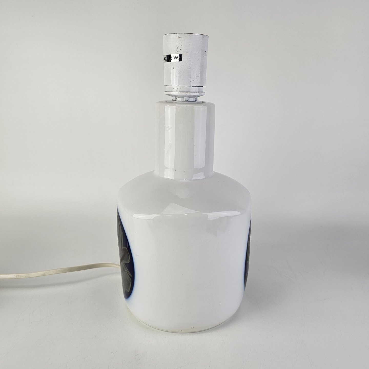 Bordlampe i hvidt porcelæn med abstrakt dekoration i blå og grå