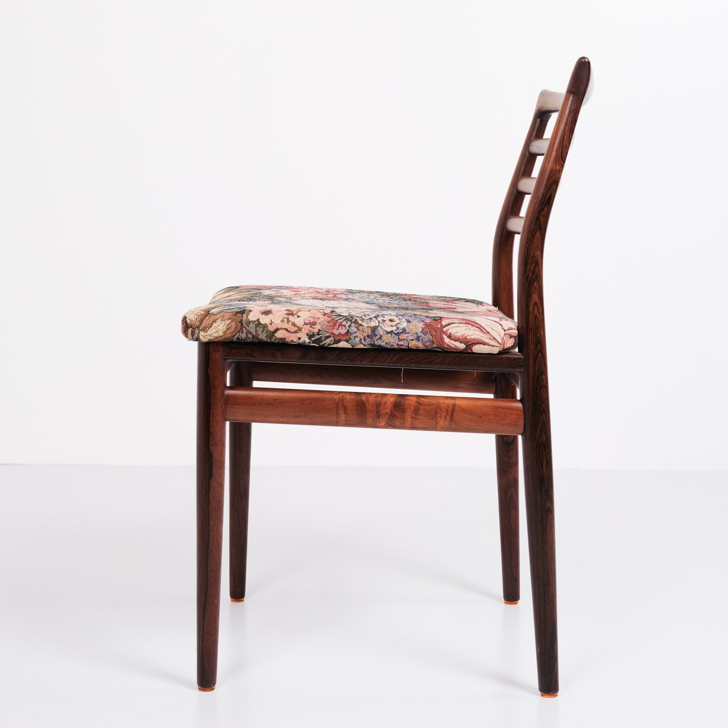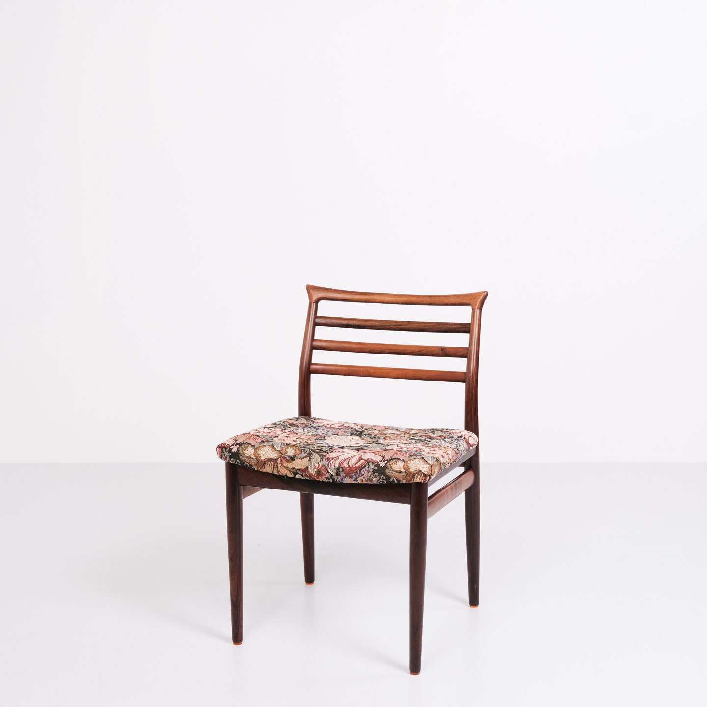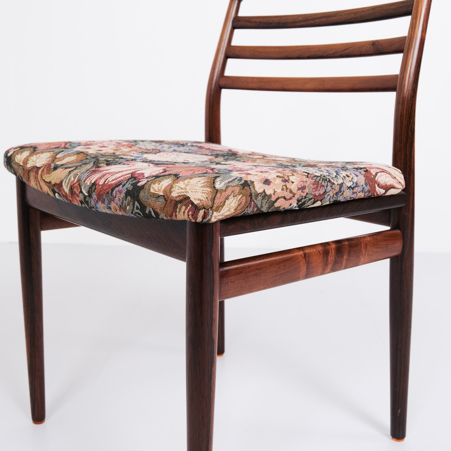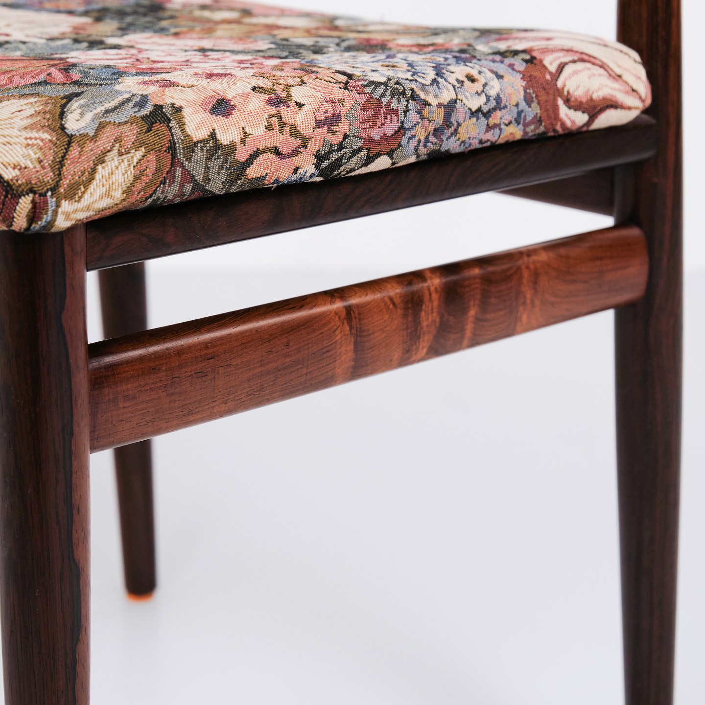 Sæt af seks Erling Torvits spisebordsstole fra 1960’erne. Palisander med blomstret sæde. Sorø Møbelfabrik.