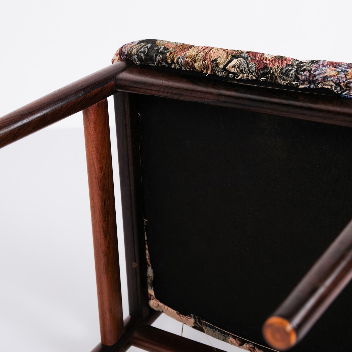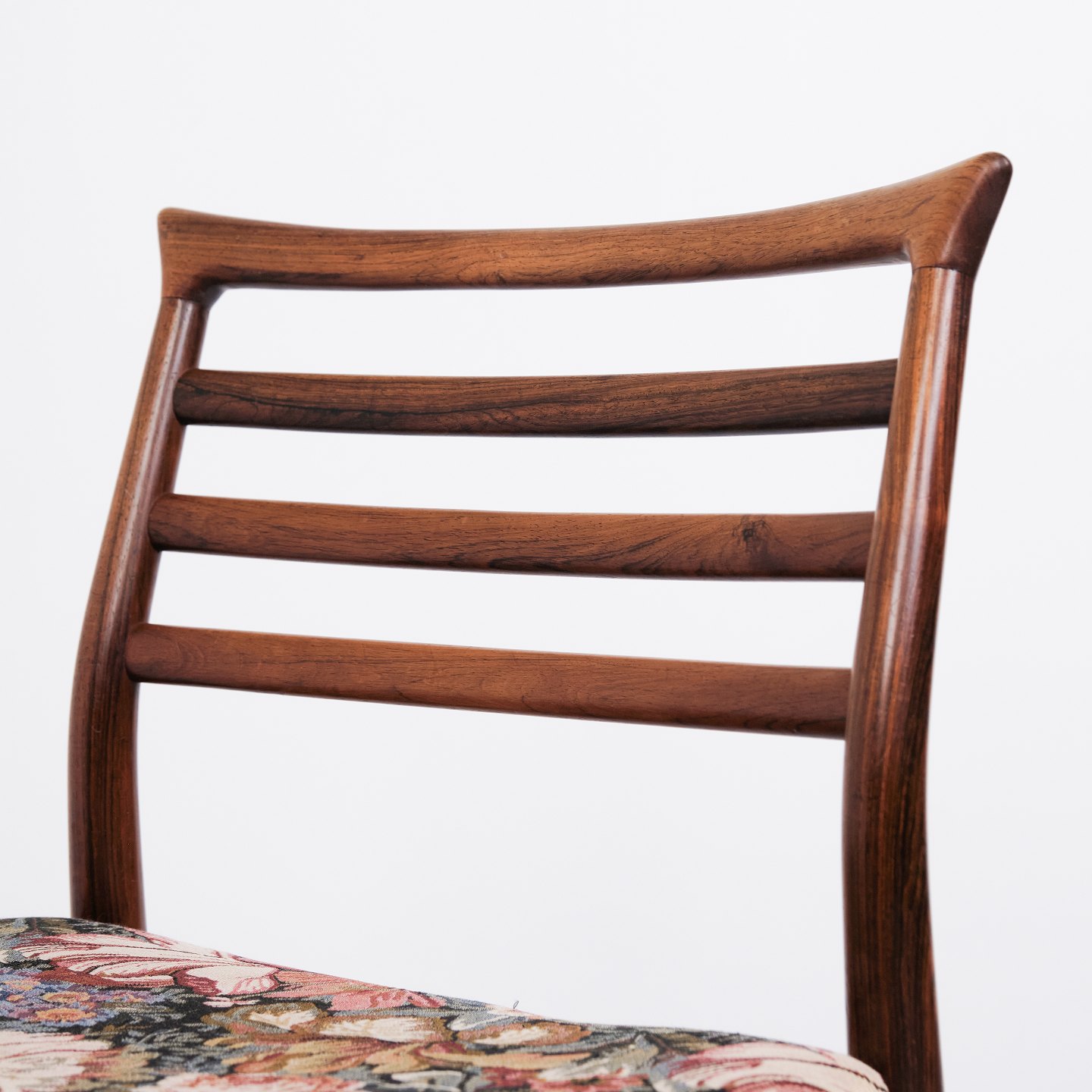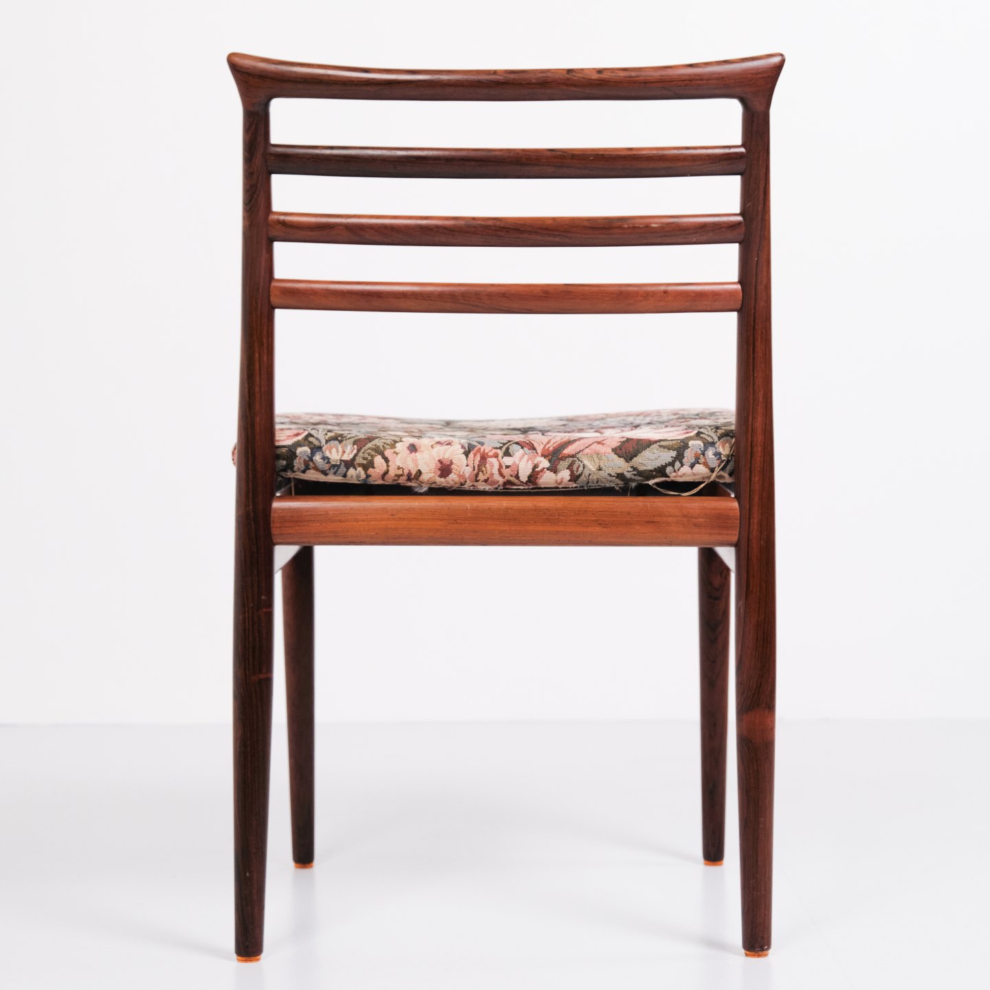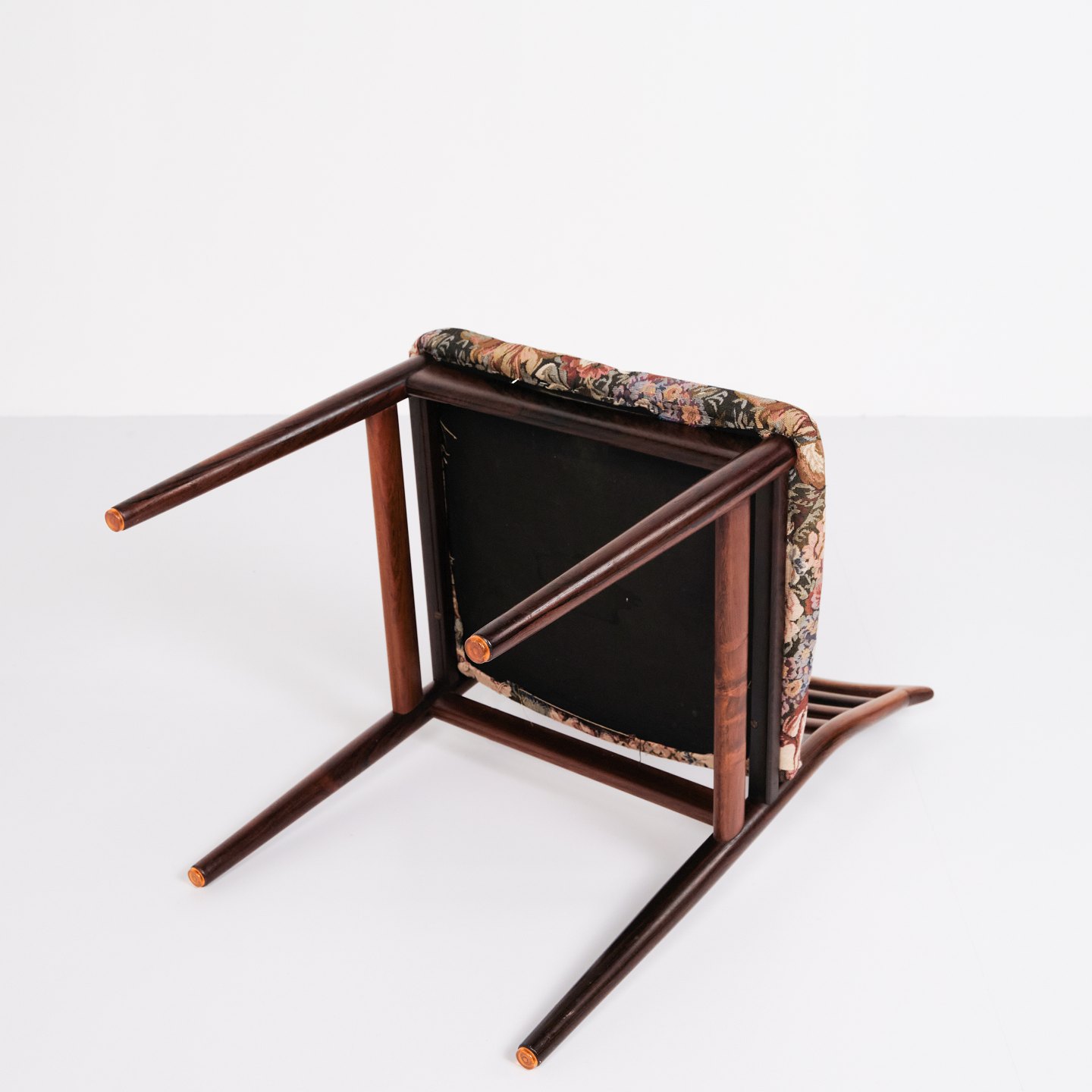 Sæt af seks Erling Torvits spisebordsstole fra 1960’erne. Palisander med blomstret sæde. Sorø Møbelfabrik.