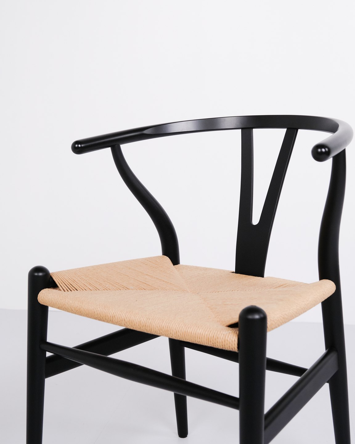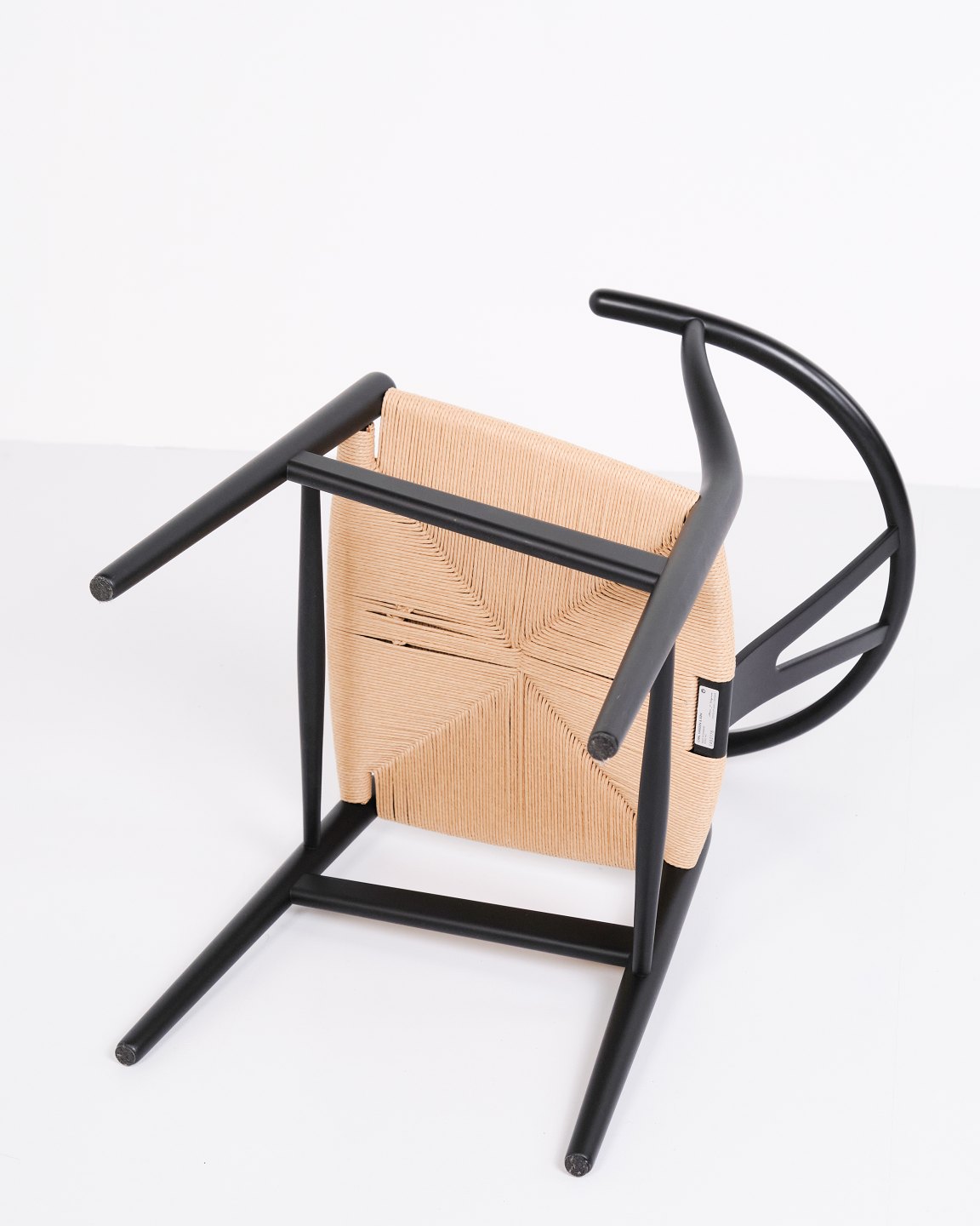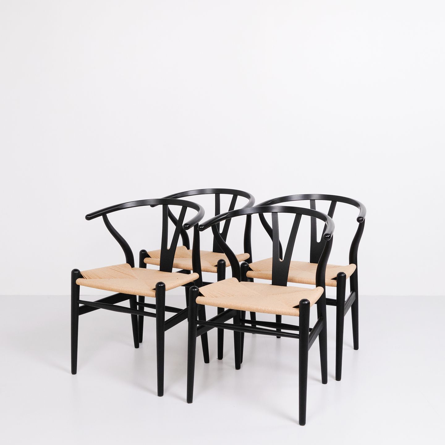 Text zugänglich auf Dänische: Sæt af fire Y-stole, model CH24, designet af Hans J. Wegner og produceret af Carl Hansen & Søn. Stolene er udført i massivt træ, lakeret i Soft Black, og med sæde i flettet naturpapir.