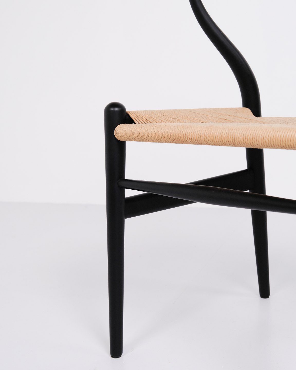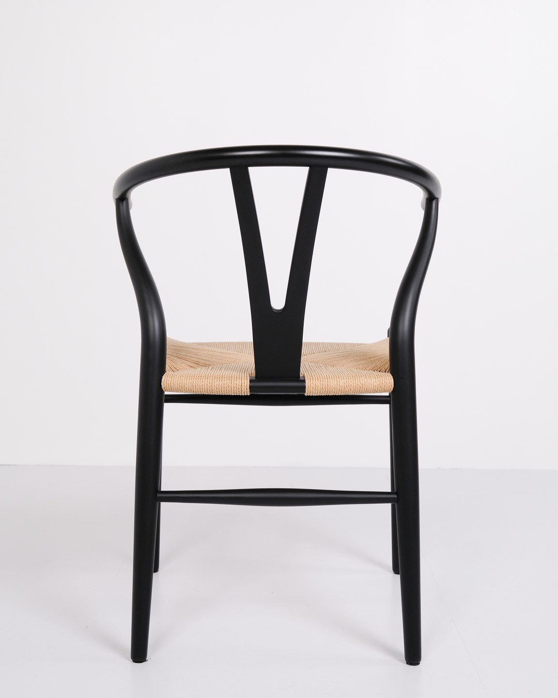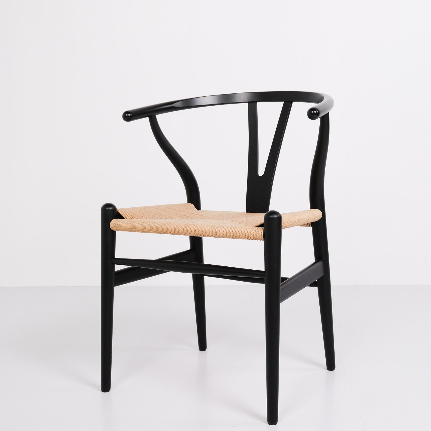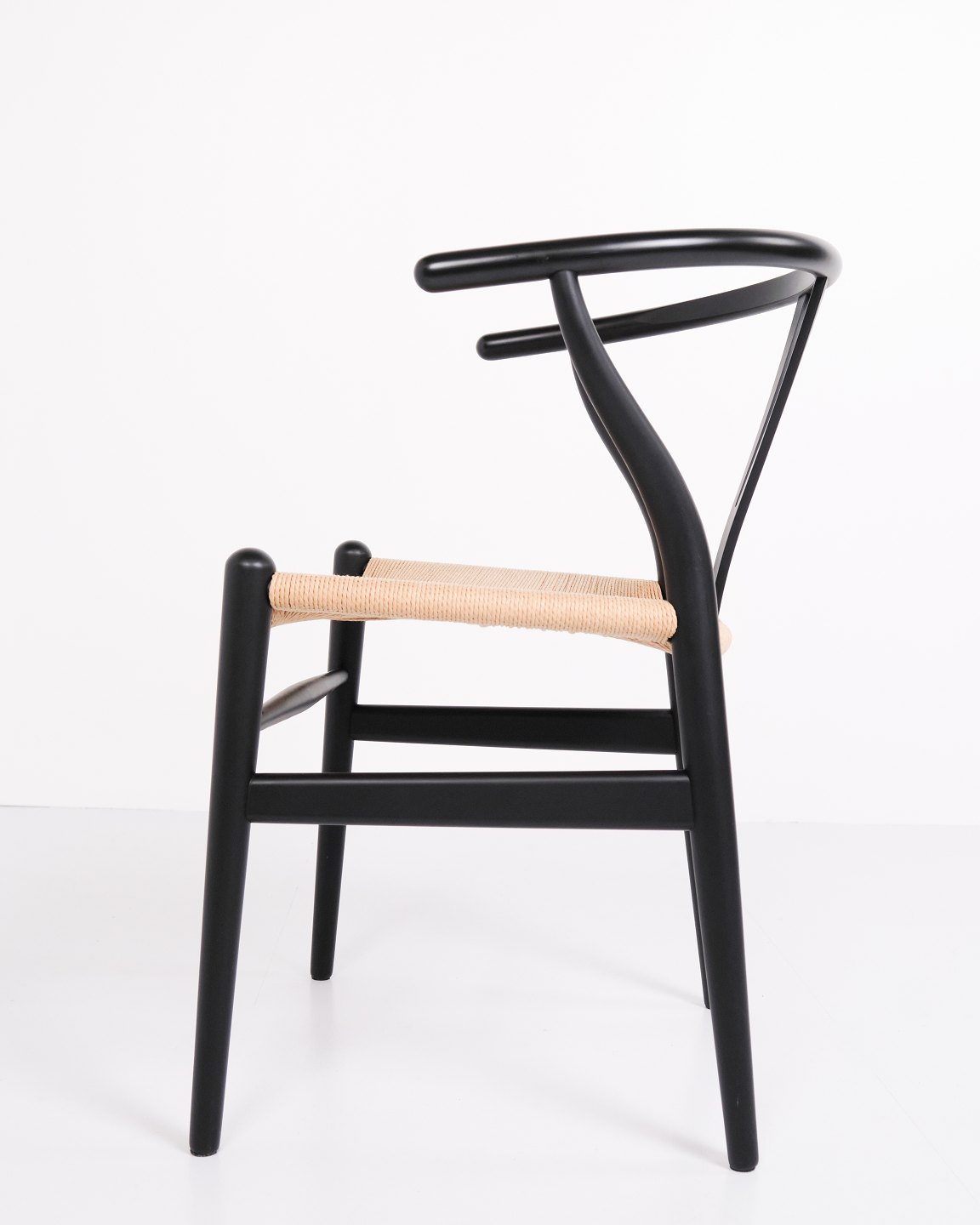 Text zugänglich auf Dänische: Sæt af fire Y-stole, model CH24, designet af Hans J. Wegner og produceret af Carl Hansen & Søn. Stolene er udført i massivt træ, lakeret i Soft Black, og med sæde i flettet naturpapir.