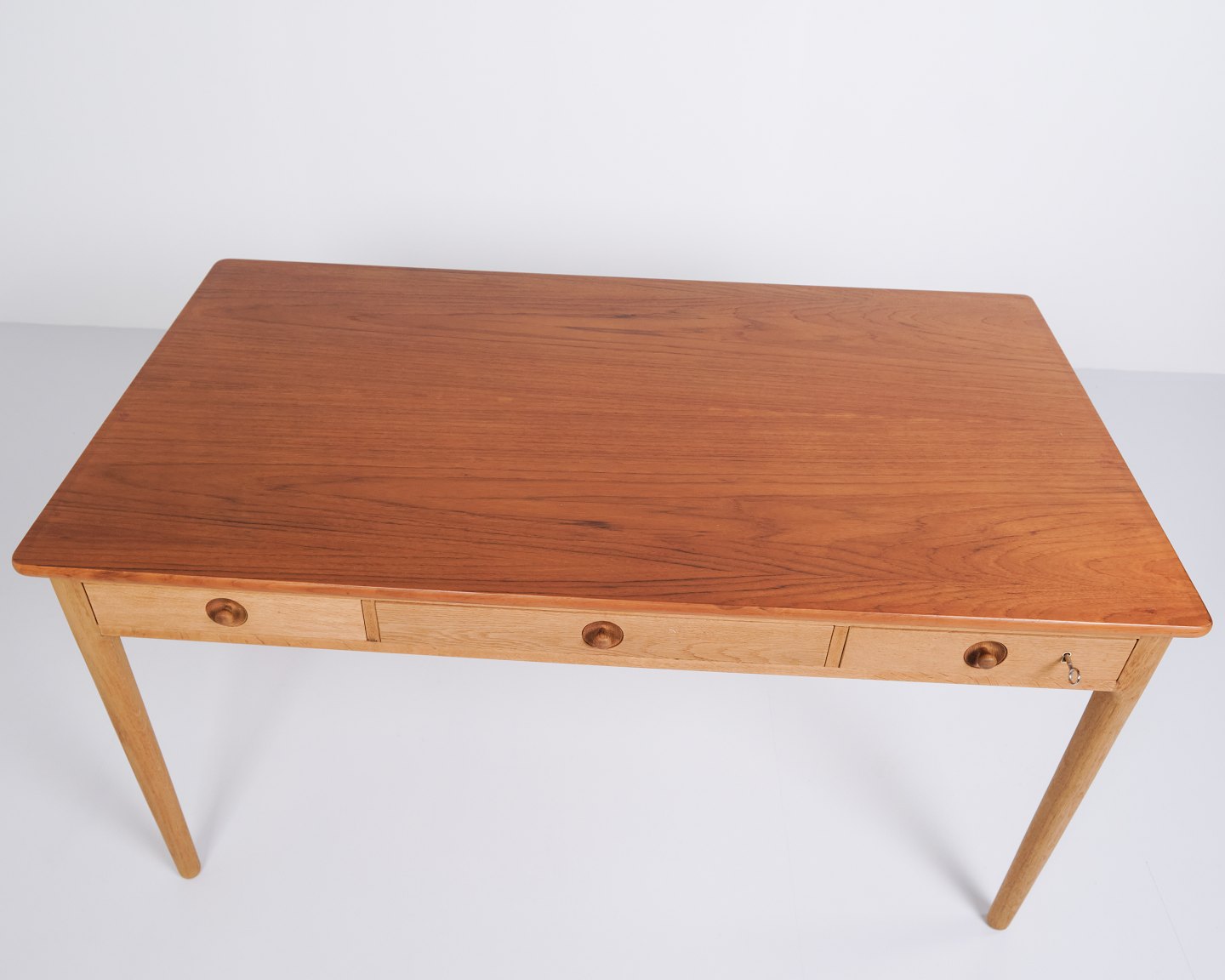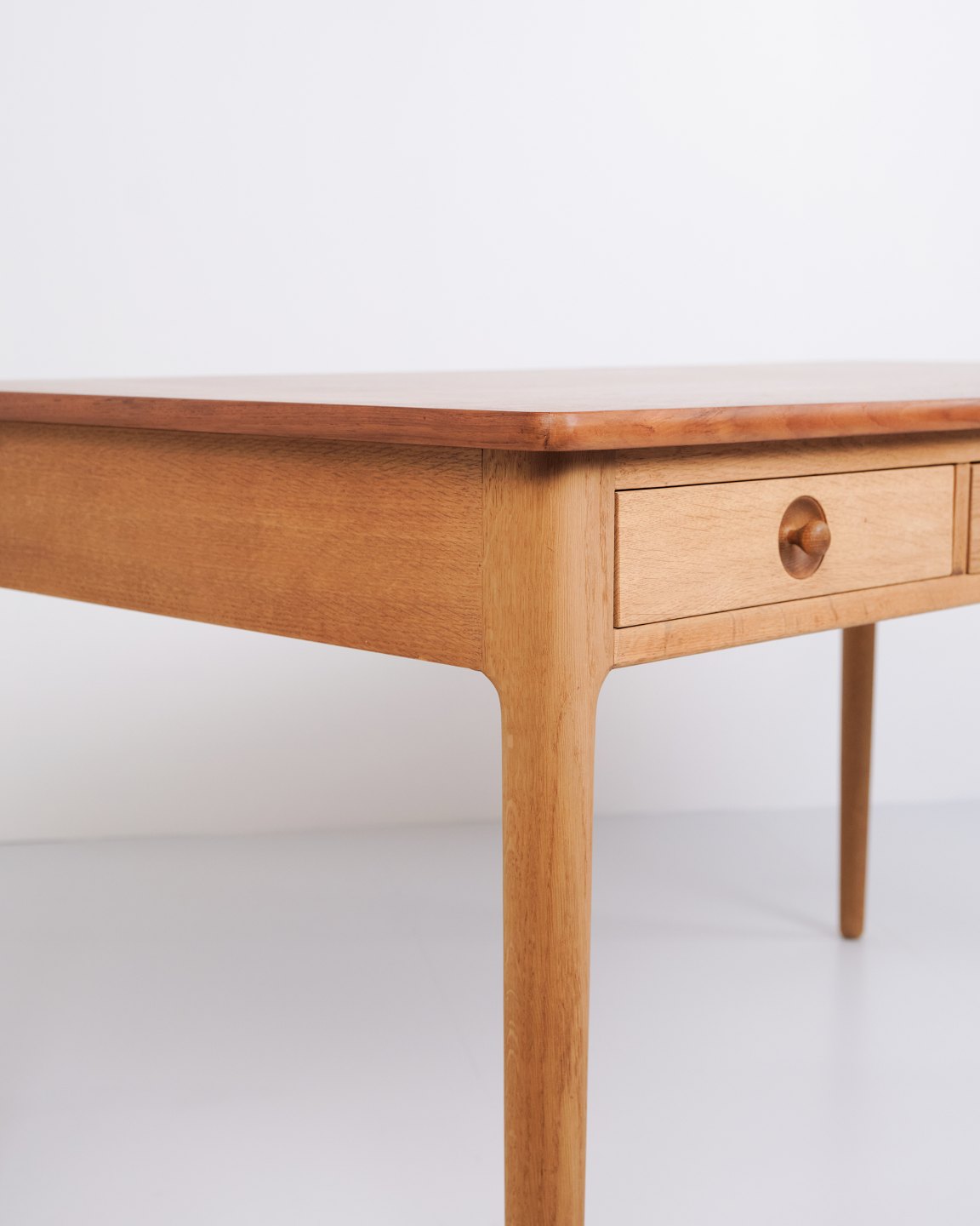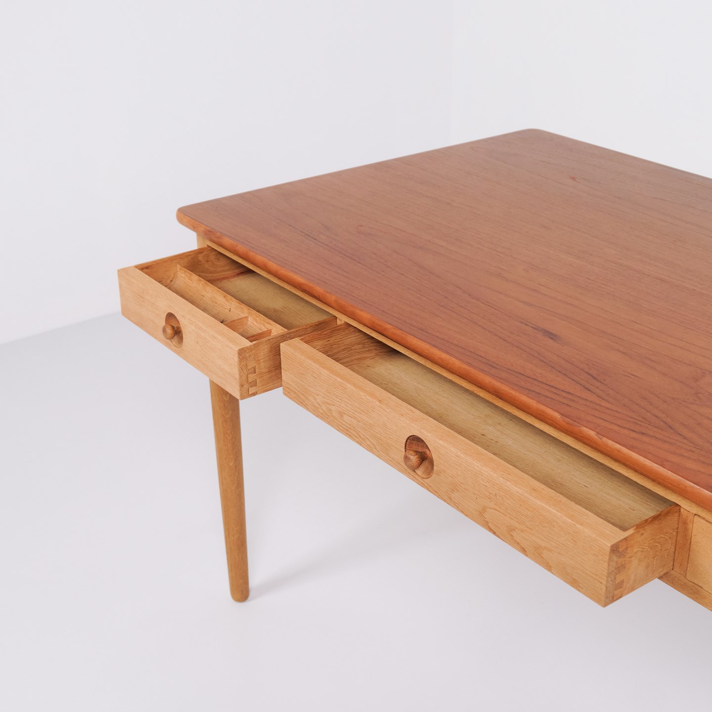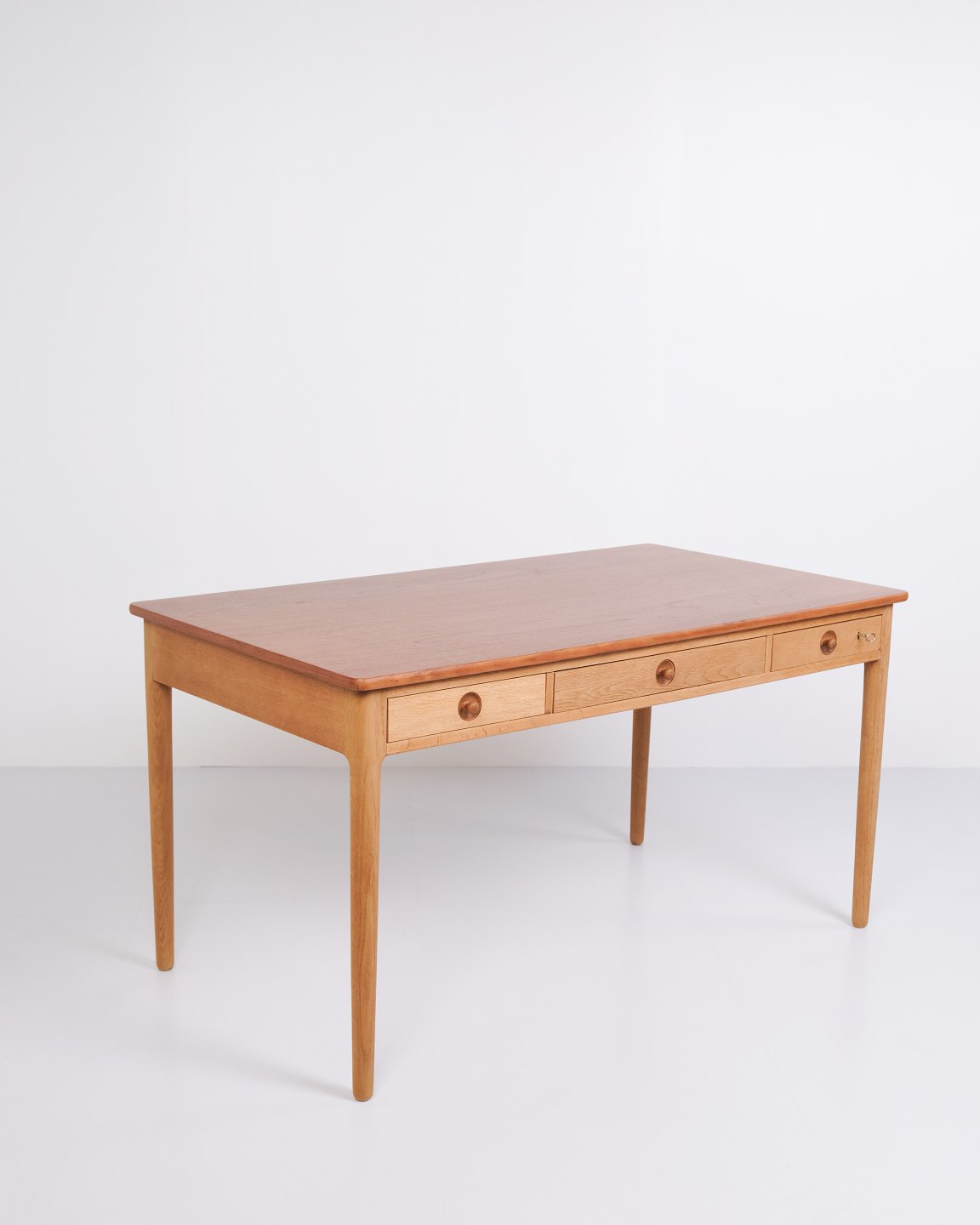 Schreibtisch entworfen von Hans J. Wegner und produziert von Andreas Tuck in den 1960er Jahren. Der Tisch ist aus Teak gefertigt mit einer Eichen-Beinkonstruktion – eine klassische Materialkombination, die Wegners Sinn für Proportion und natürliche Balance hervorhebt. Der Tisch hat Schubladen auf der Vorderseite.