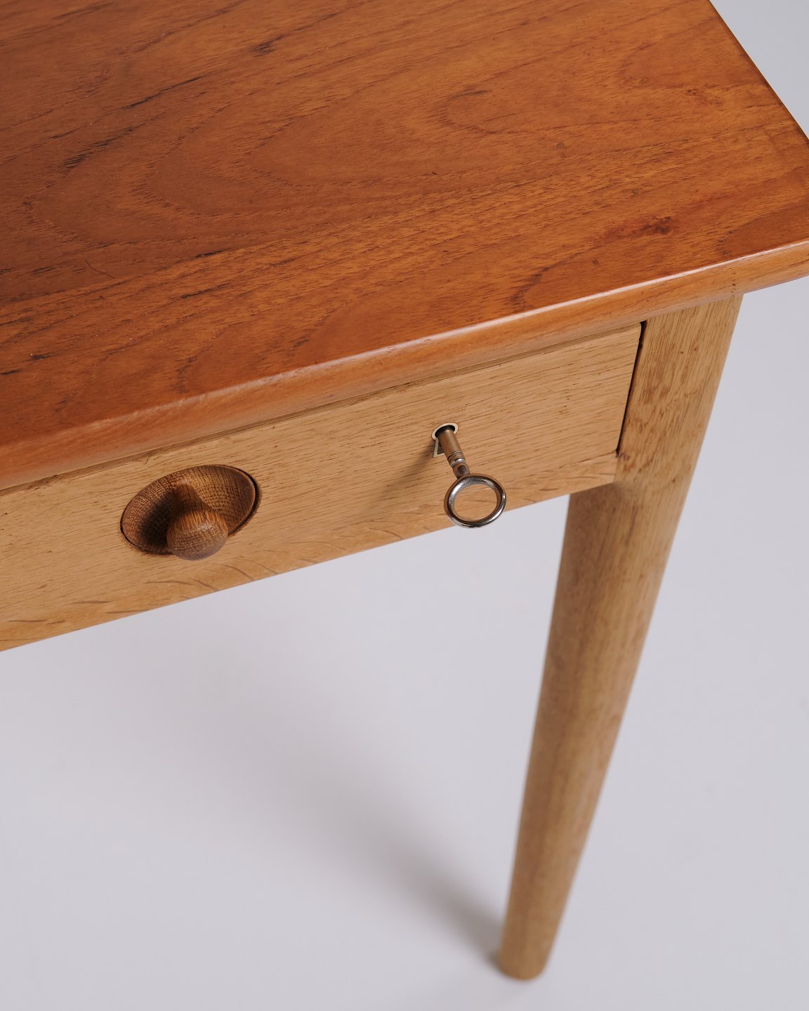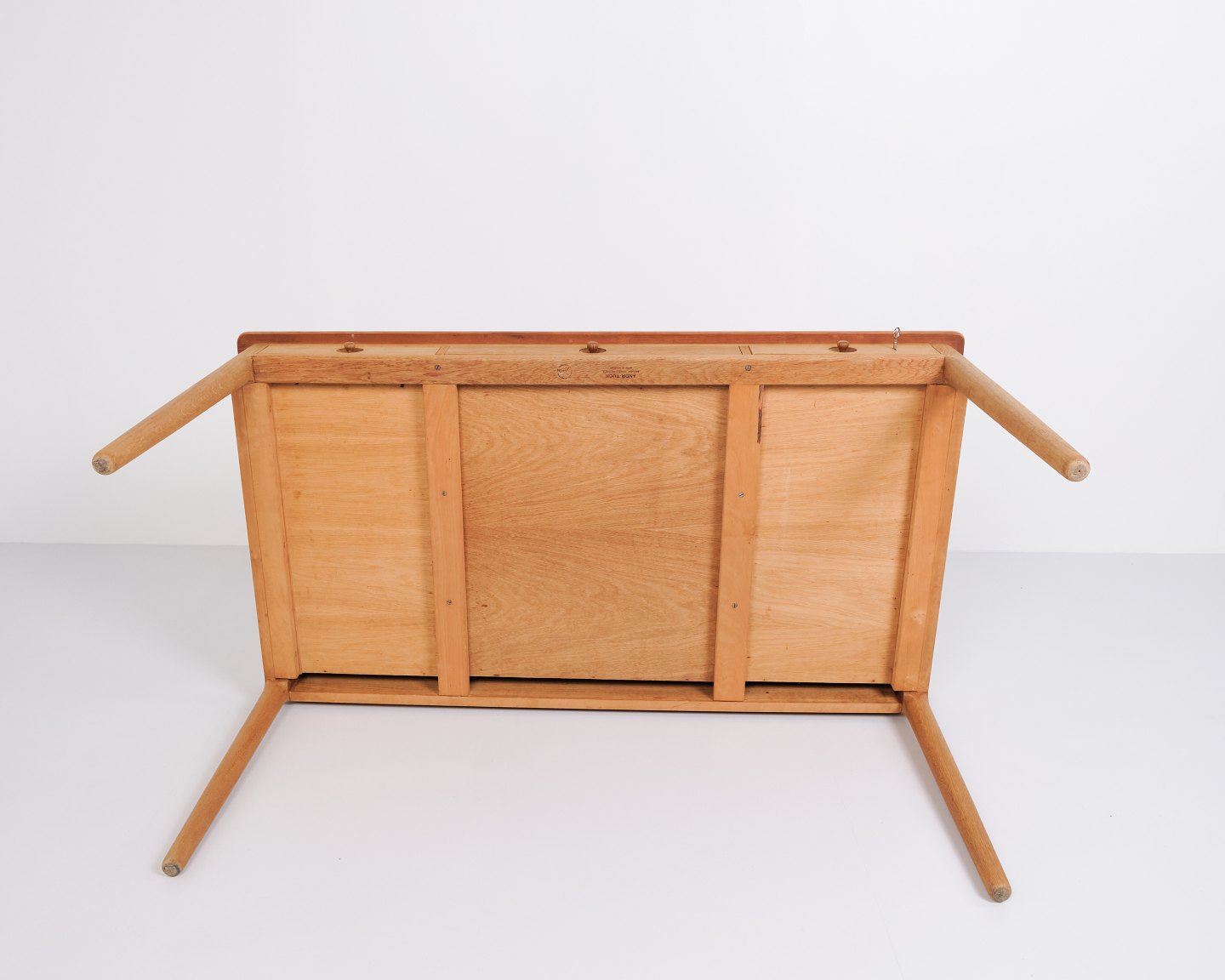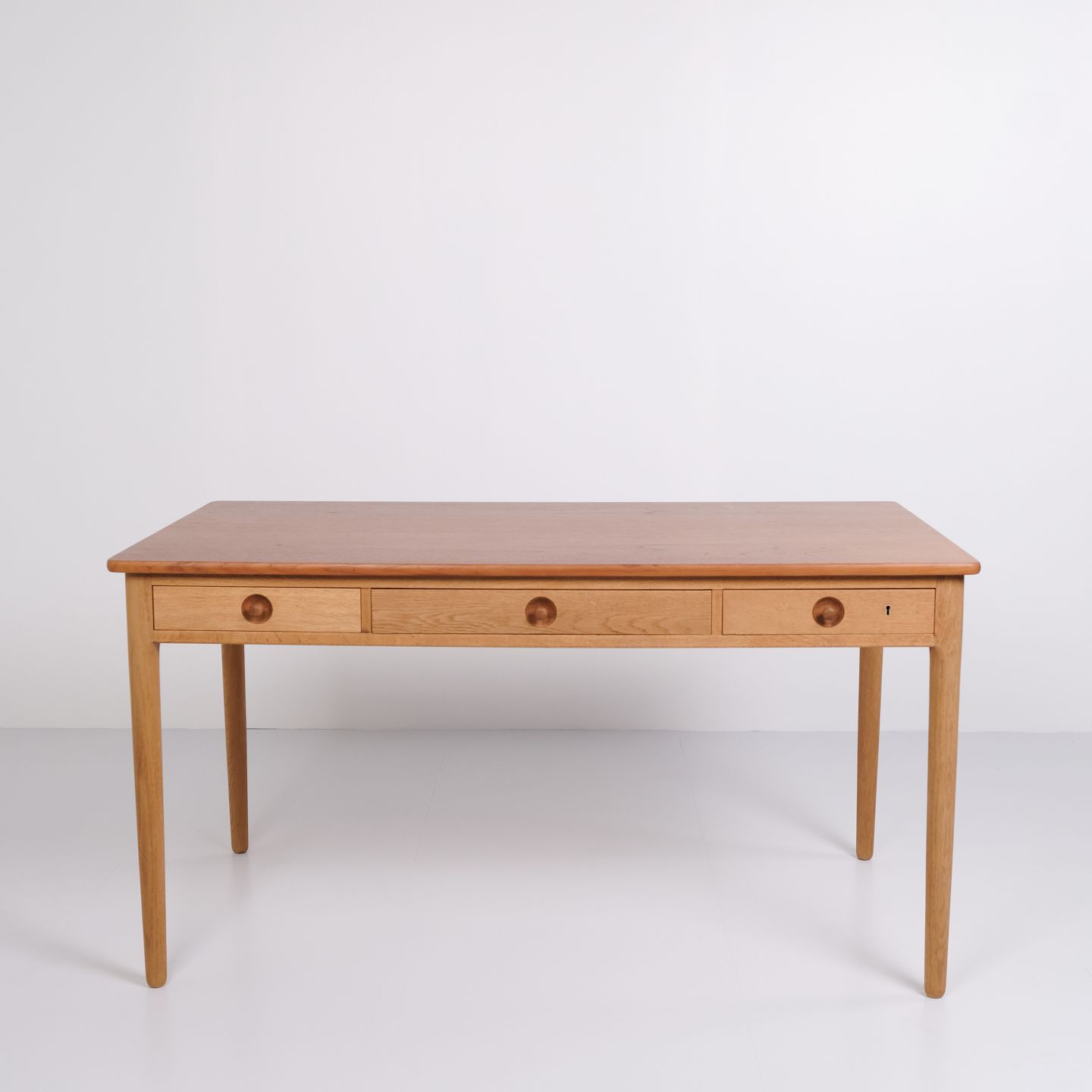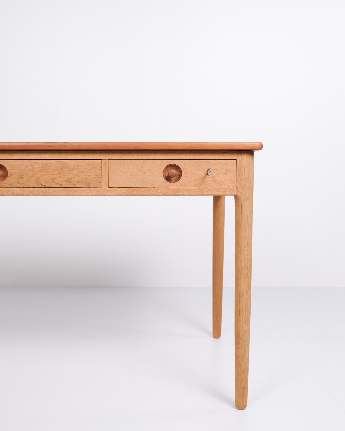 Schreibtisch entworfen von Hans J. Wegner und produziert von Andreas Tuck in den 1960er Jahren. Der Tisch ist aus Teak gefertigt mit einer Eichen-Beinkonstruktion – eine klassische Materialkombination, die Wegners Sinn für Proportion und natürliche Balance hervorhebt. Der Tisch hat Schubladen auf der Vorderseite.