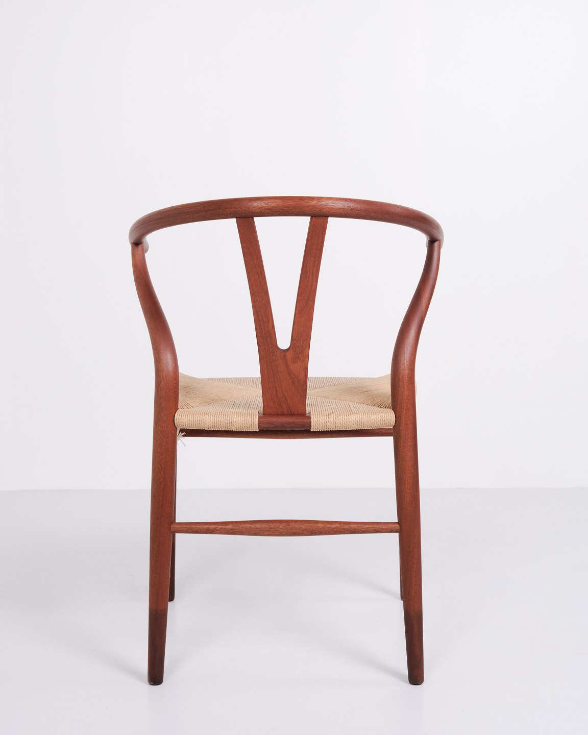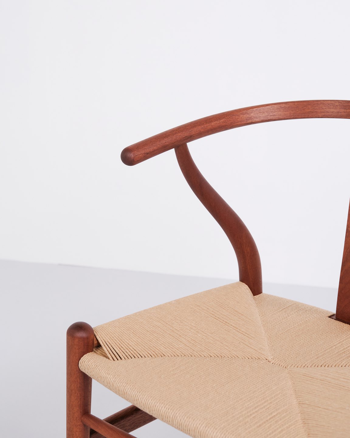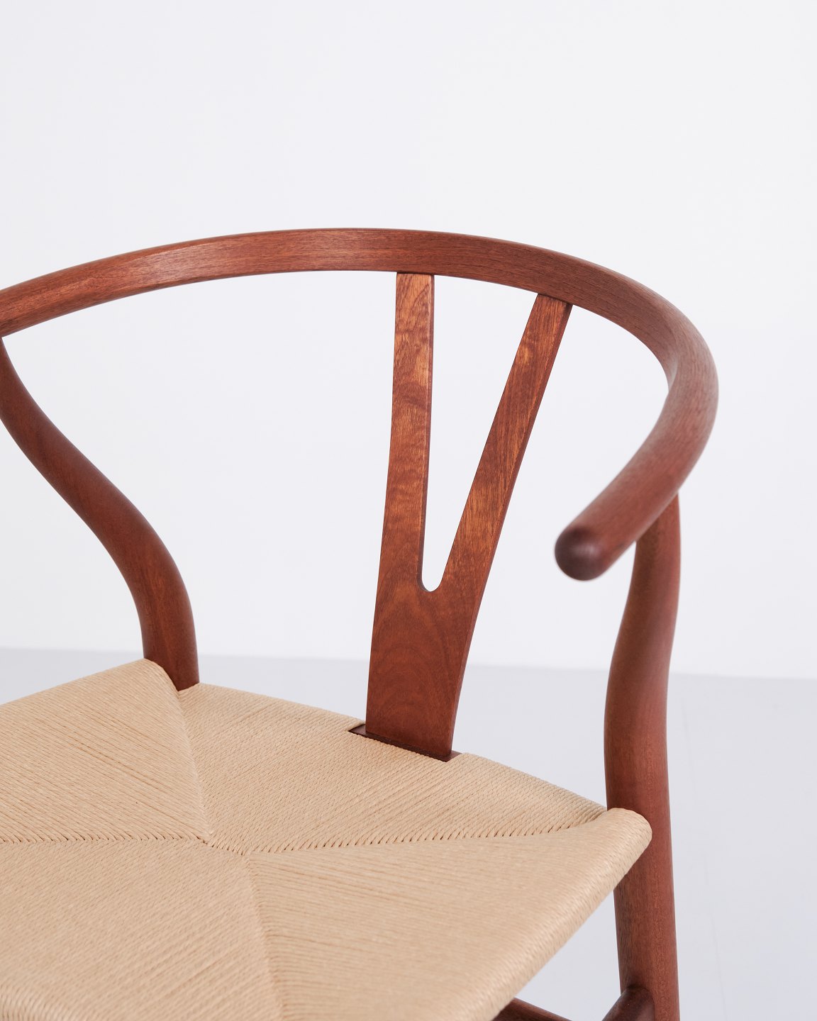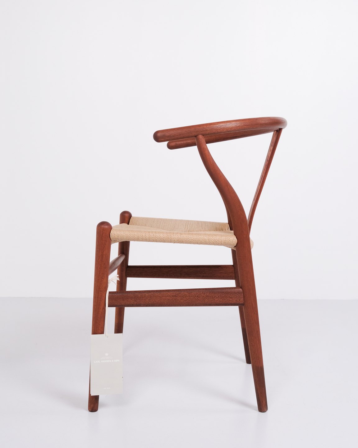 Text zugänglich auf Dänische: Sæt af fire Hans J. Wegner Y-stole, model CH24. Mahogni med naturflet. Carl Hansen & Søn.