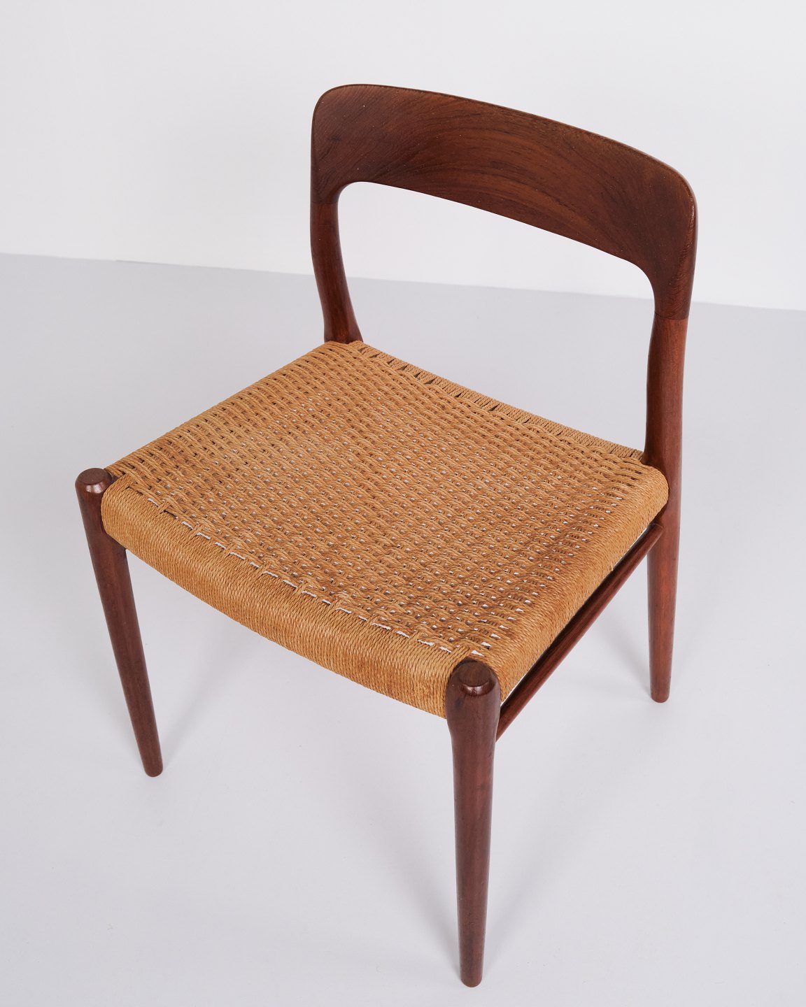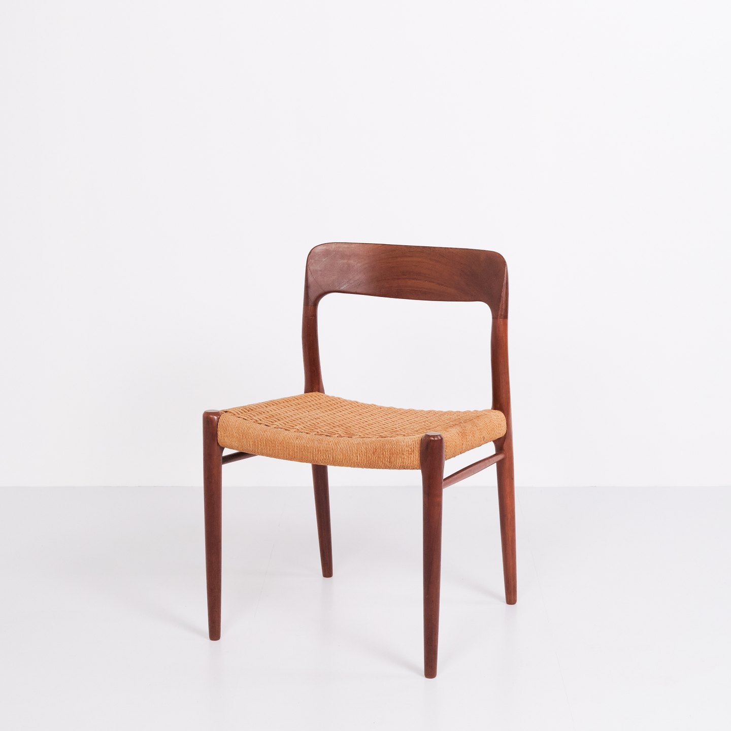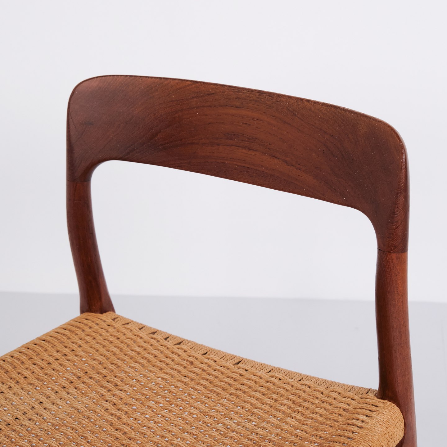 Text zugänglich auf Dänische: Sæt af Fem N.O. Møller spisebordsstole, model 75. Teak og papirflet, 1960’erne.