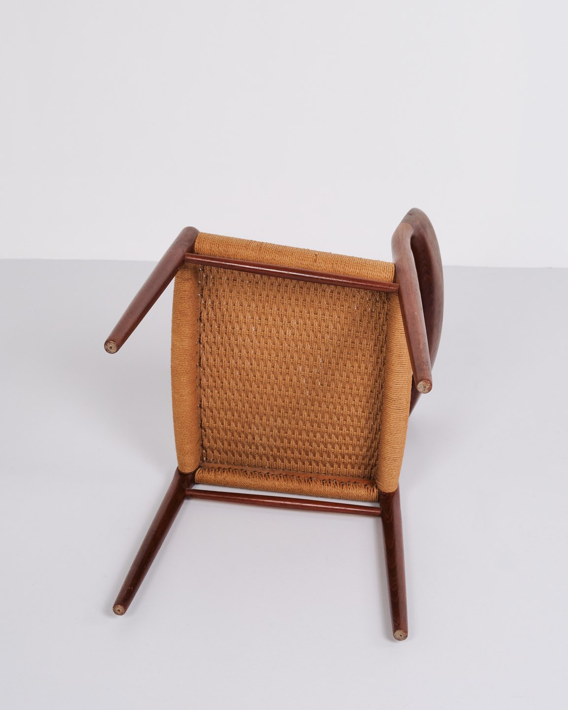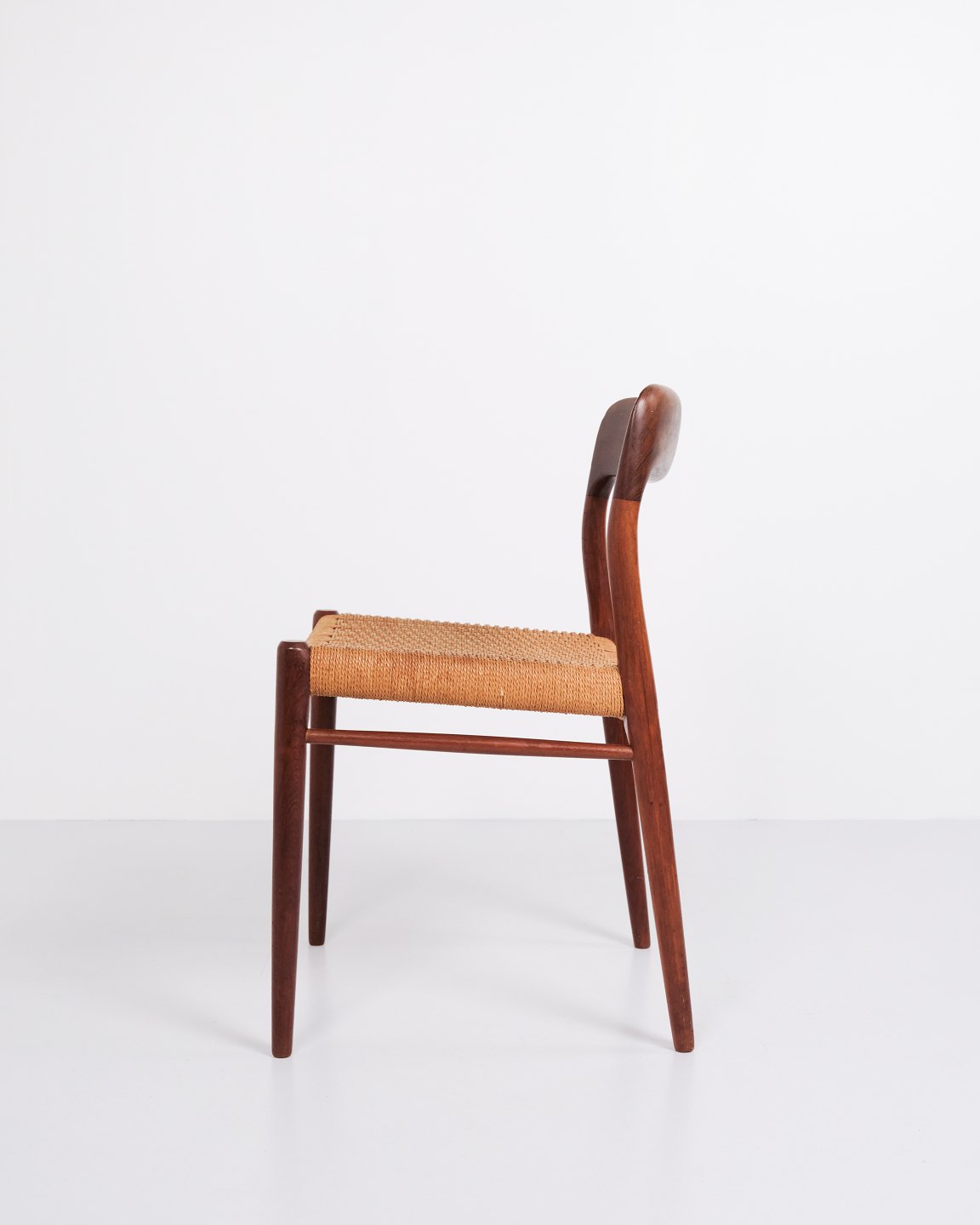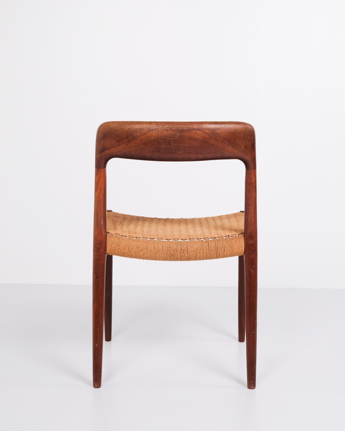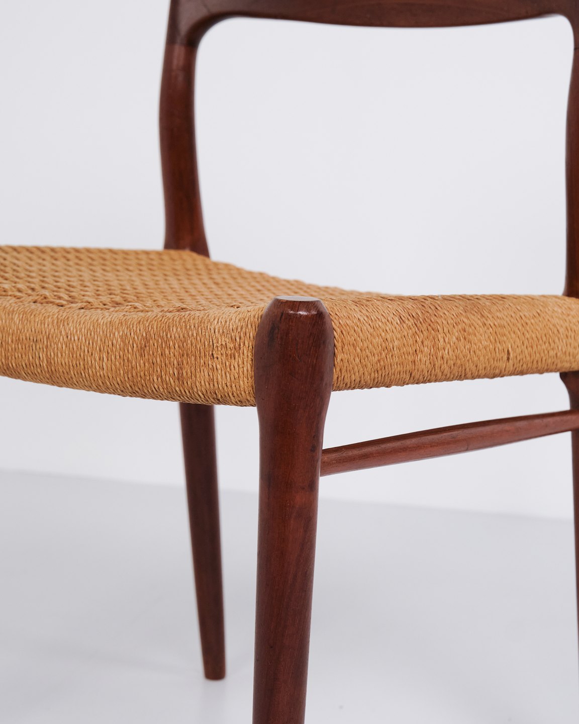 Text zugänglich auf Dänische: Sæt af Fem N.O. Møller spisebordsstole, model 75. Teak og papirflet, 1960’erne.