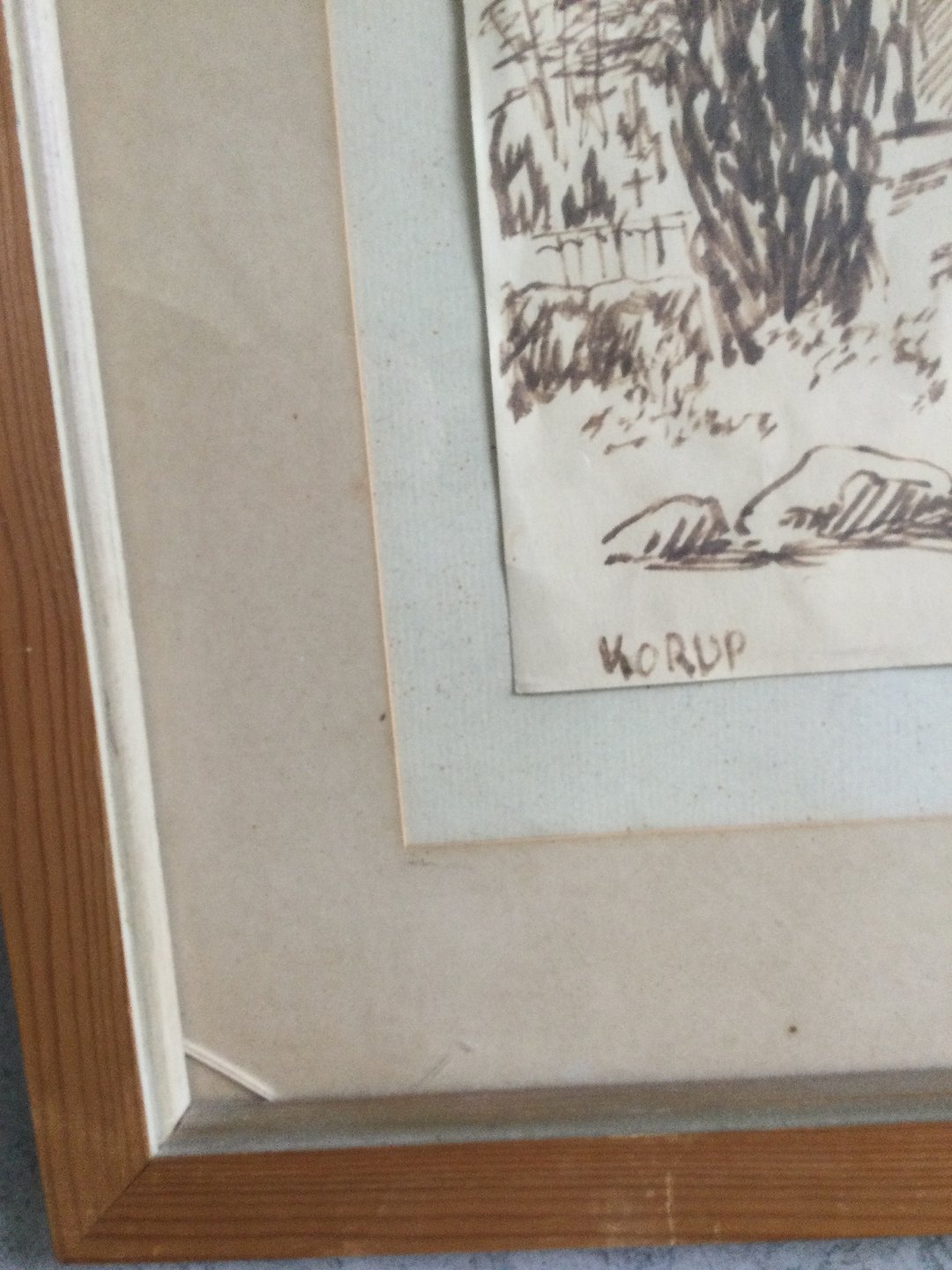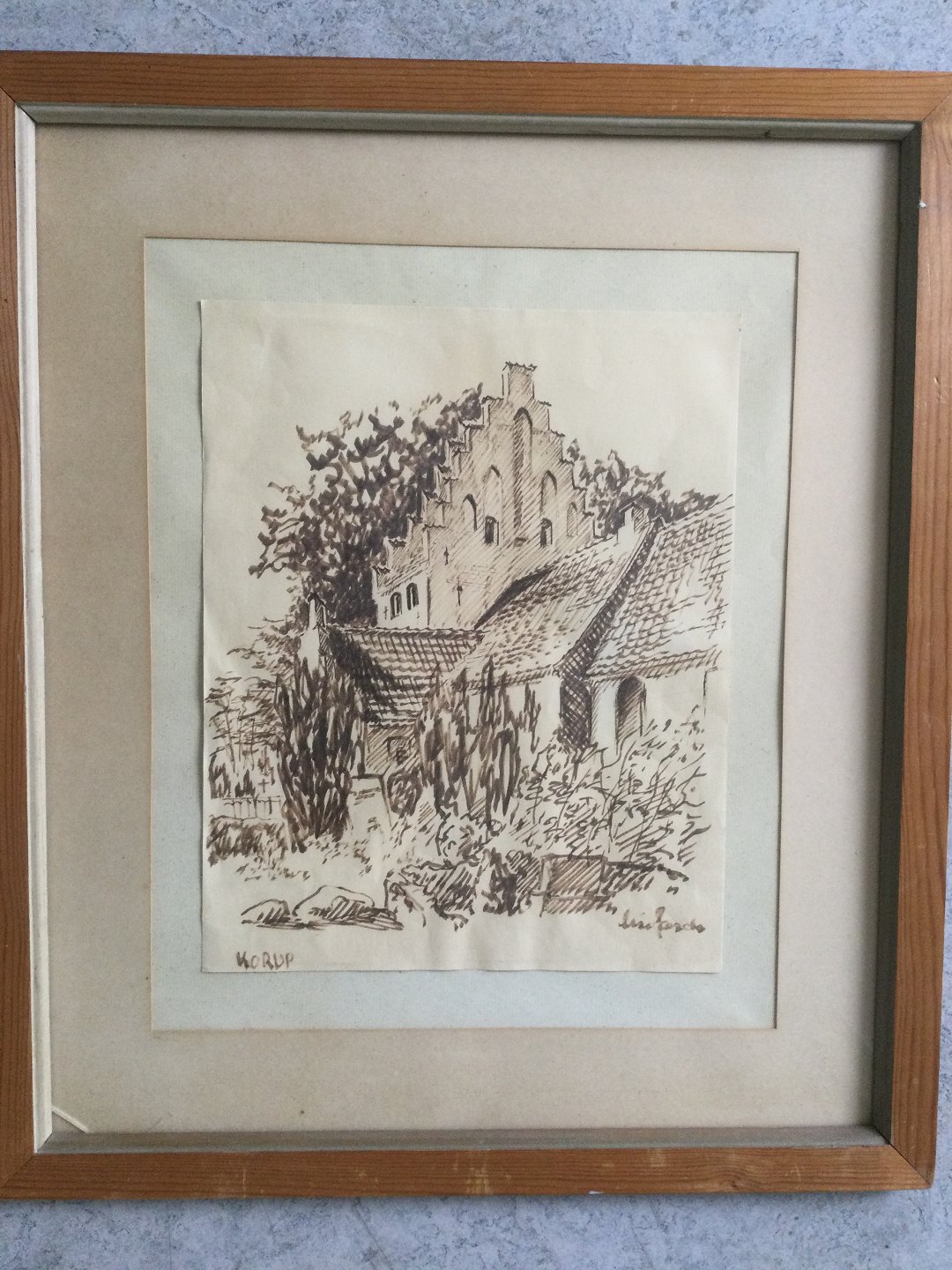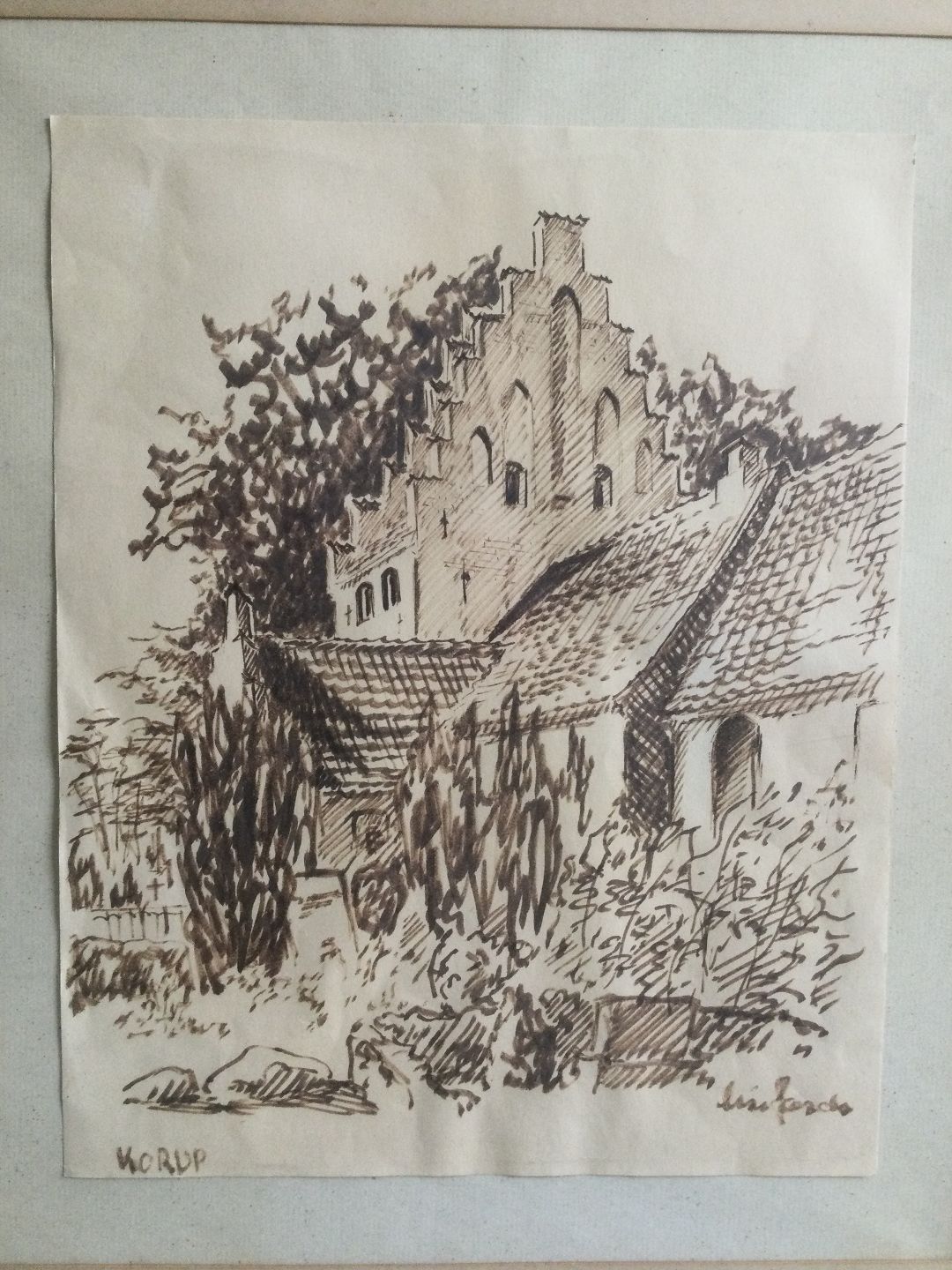Text zugänglich auf Dänische: Tegning af Lise Færch - Parti fra Korup Kirke ved Odense.