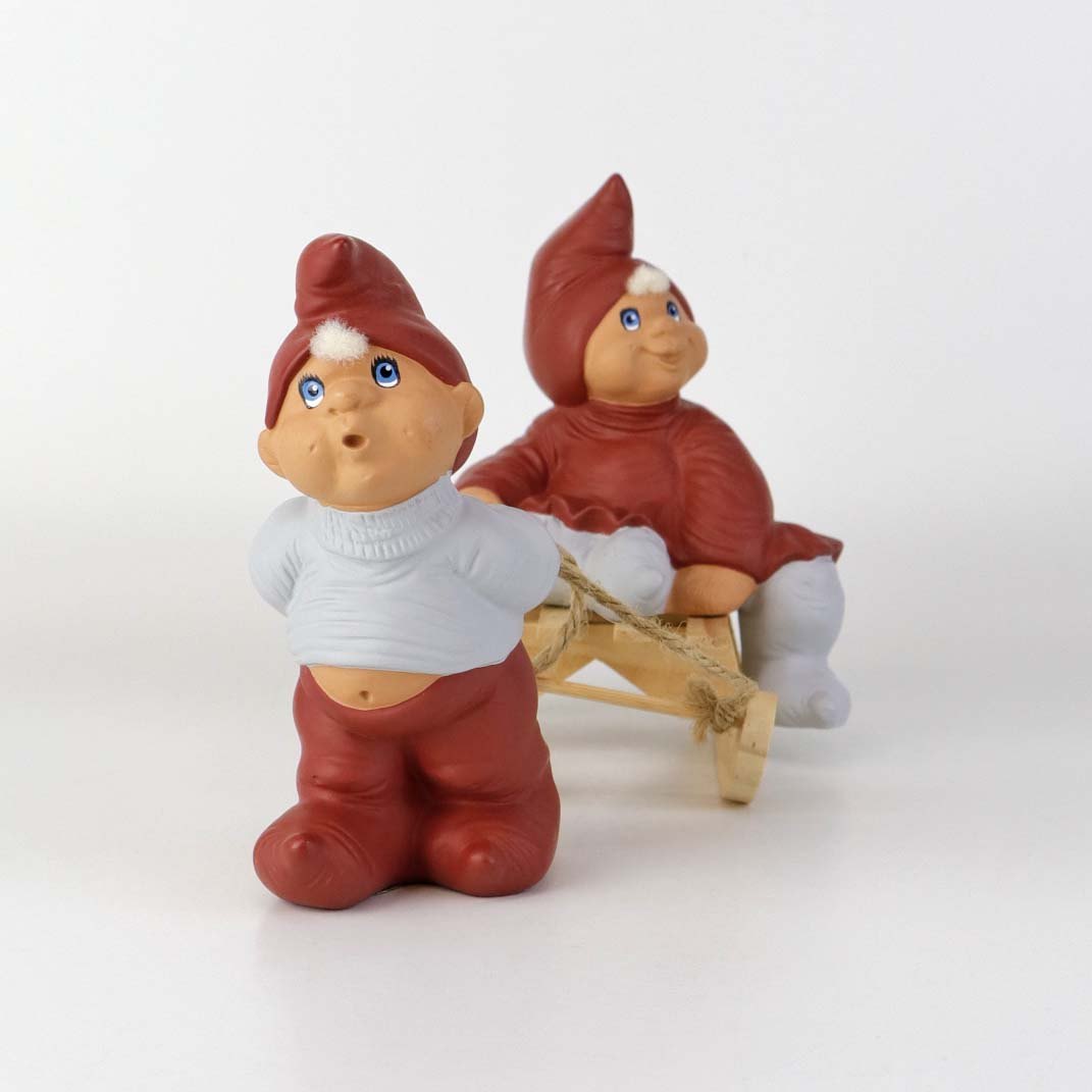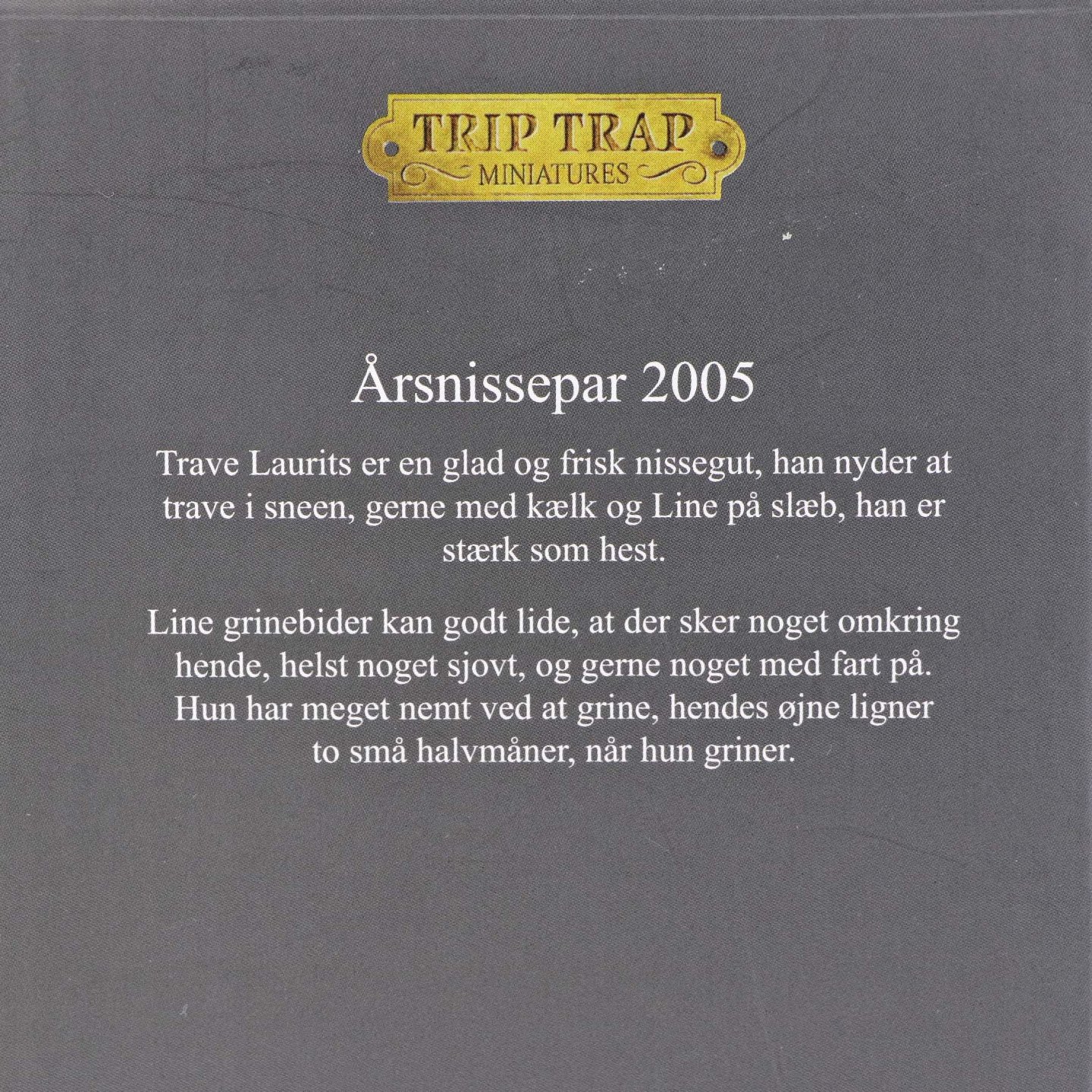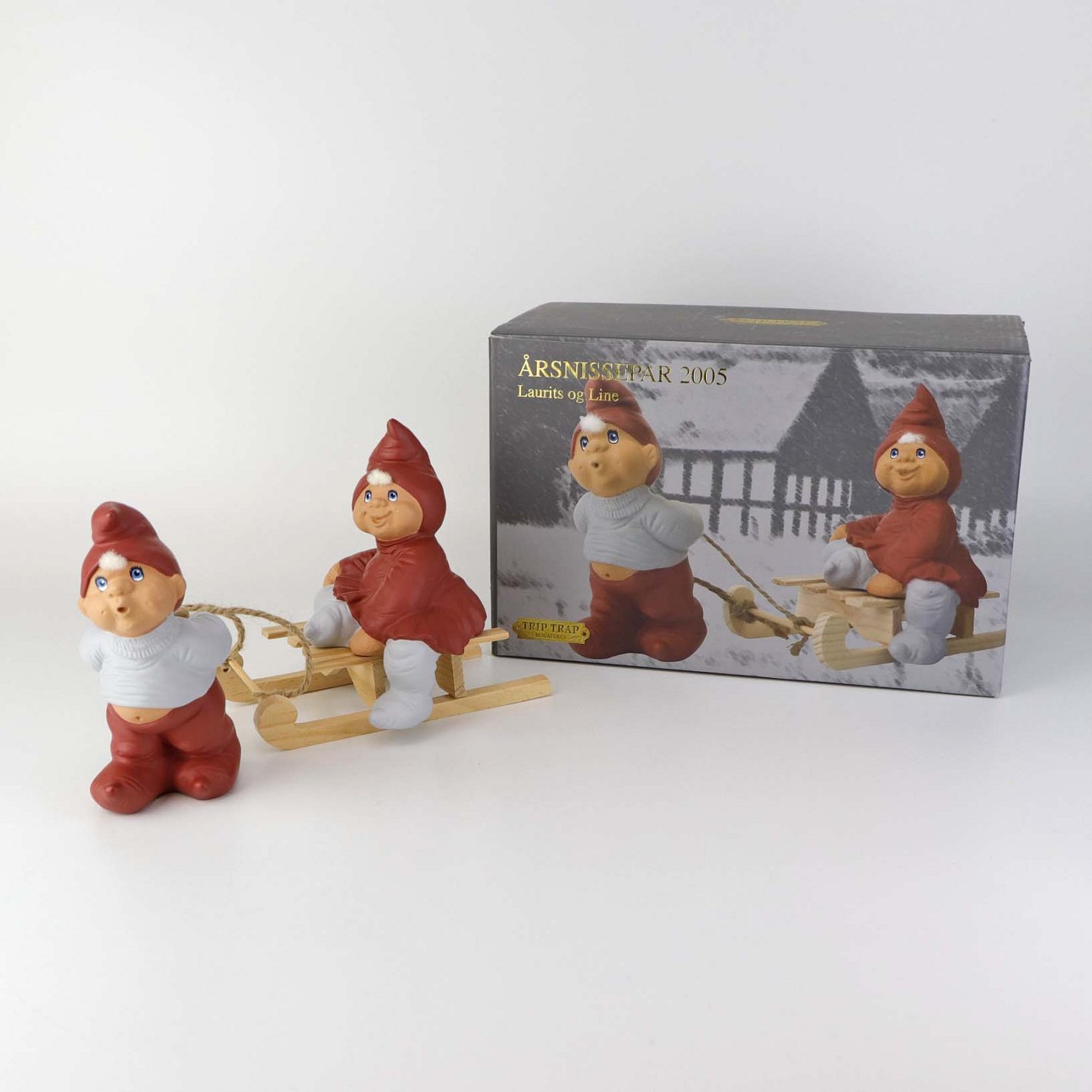 Text zugänglich auf Dänische: Figursæt med motiv Laurits og Line, som er årsnissepar fra år 2005 fra serien Klarborg jul. Figurene kommer med original boks.