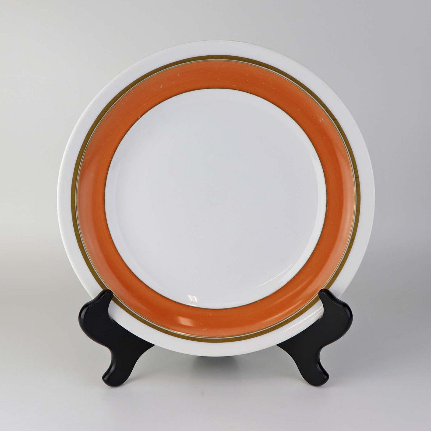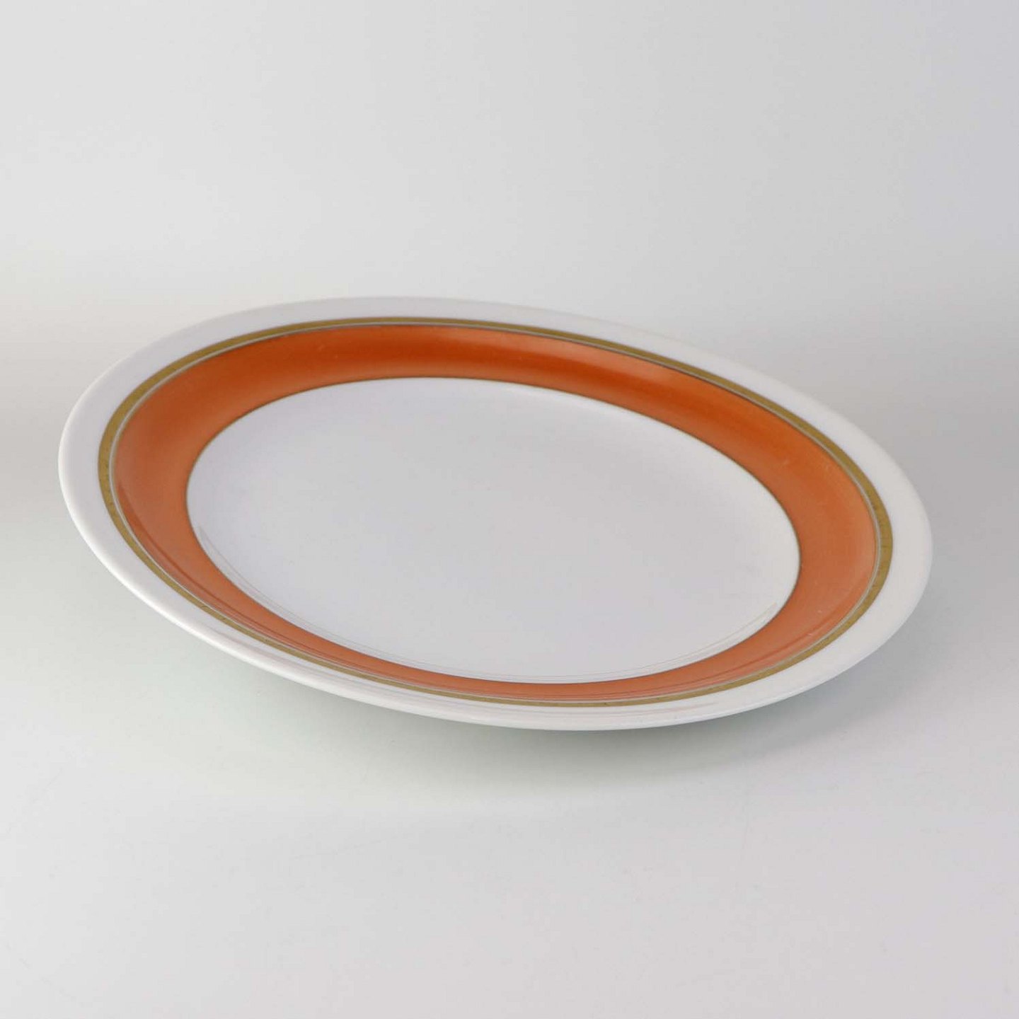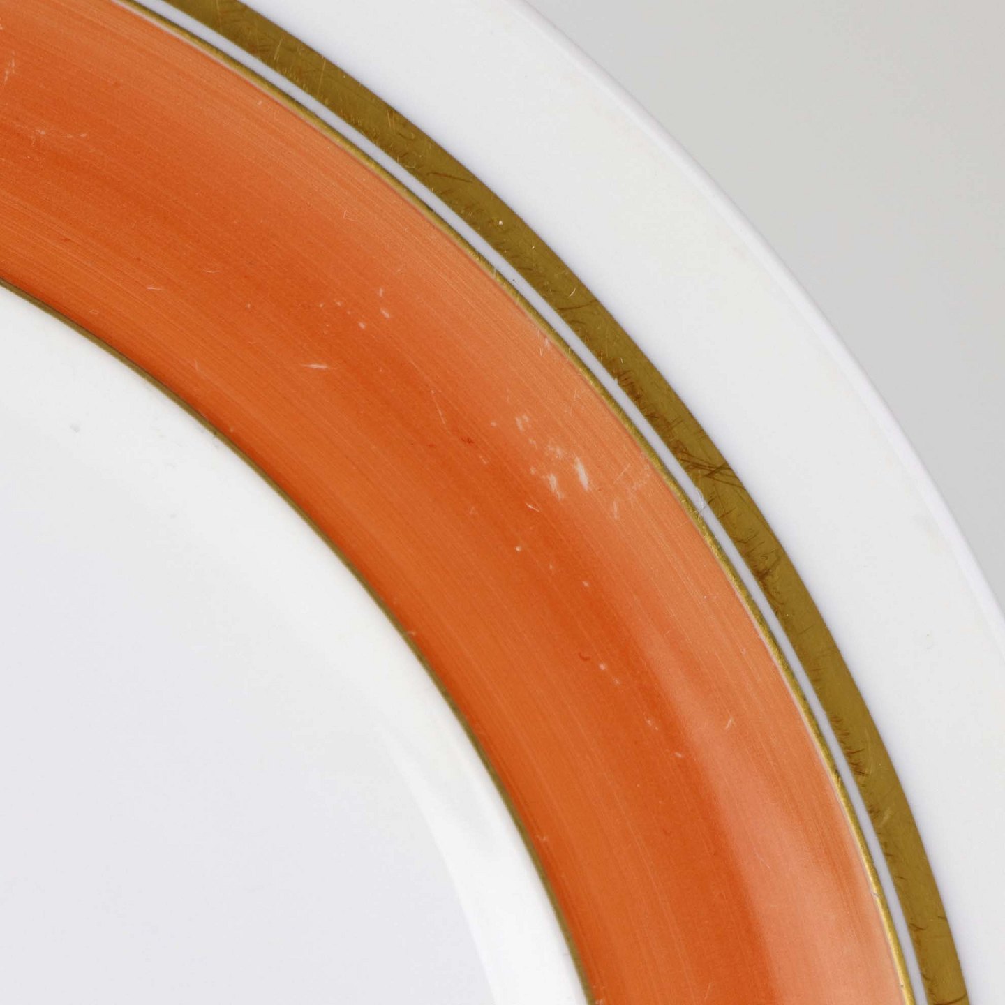 Service i glat hvidt porcelæn med orangerød dekoration over glasuren og guldkant