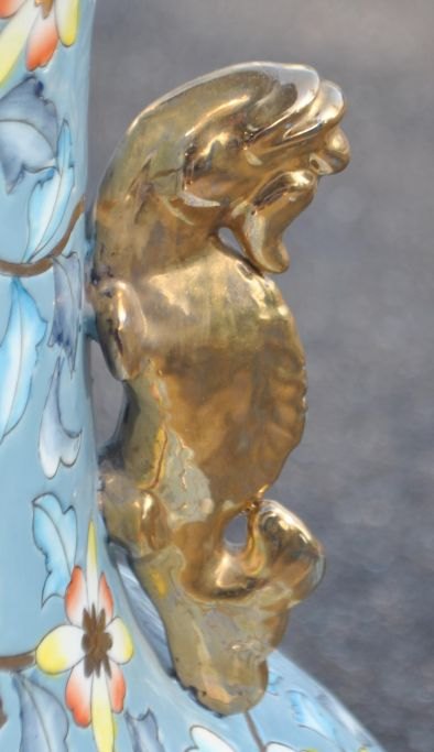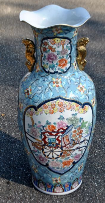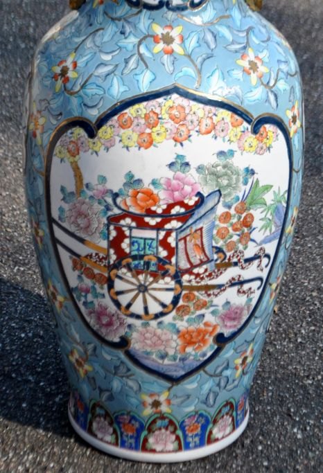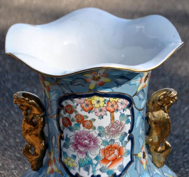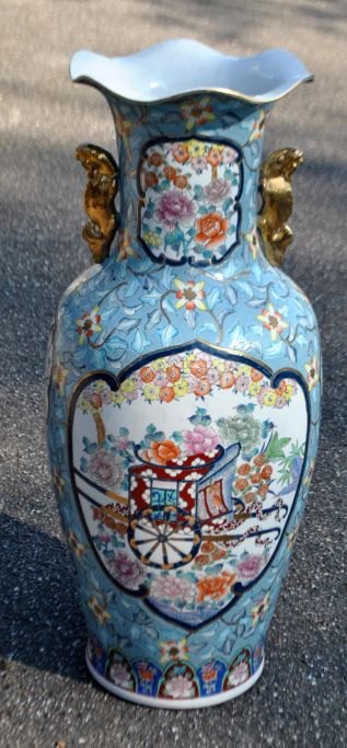 Große chinesische Bodenvase aus Porzellan, 20. Jahrhundert. Zahlreiche polychrome Dekorationen in Form von Kutschen mit Blumen, Vögeln in Blumenbüschen usw. Vergoldete Henkel. Gerüschter Rand. Gestempelt. H.: 81,5 cm.