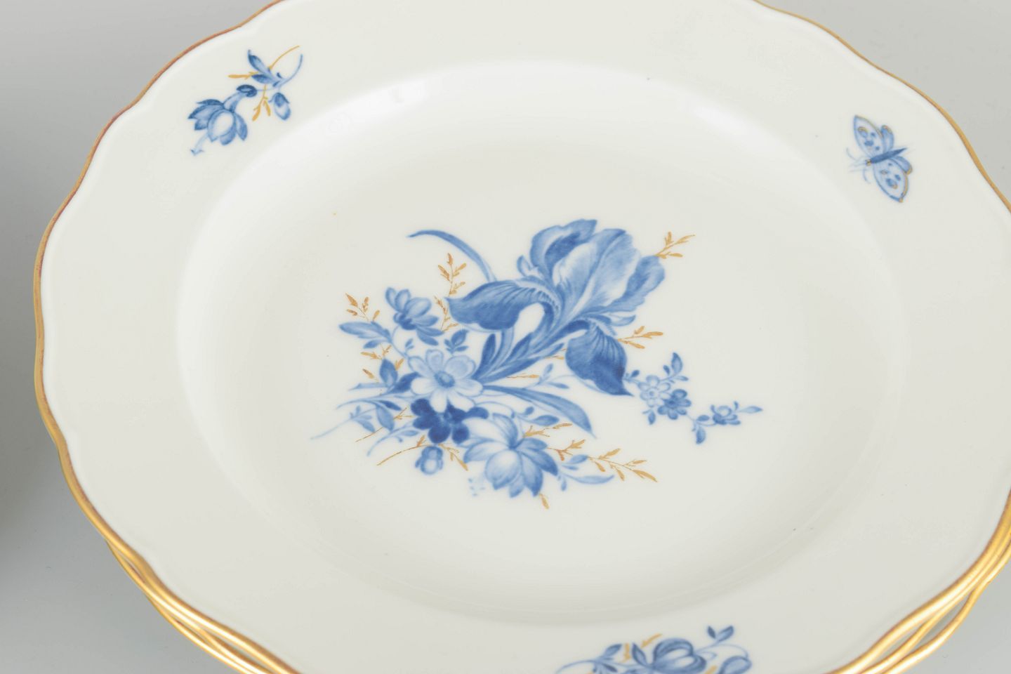 Hånddekoreret porcelæn med håndmalede blå blomsterdekorationer og forgyldte stafferinger langs kanten. Klassisk let bølget form.