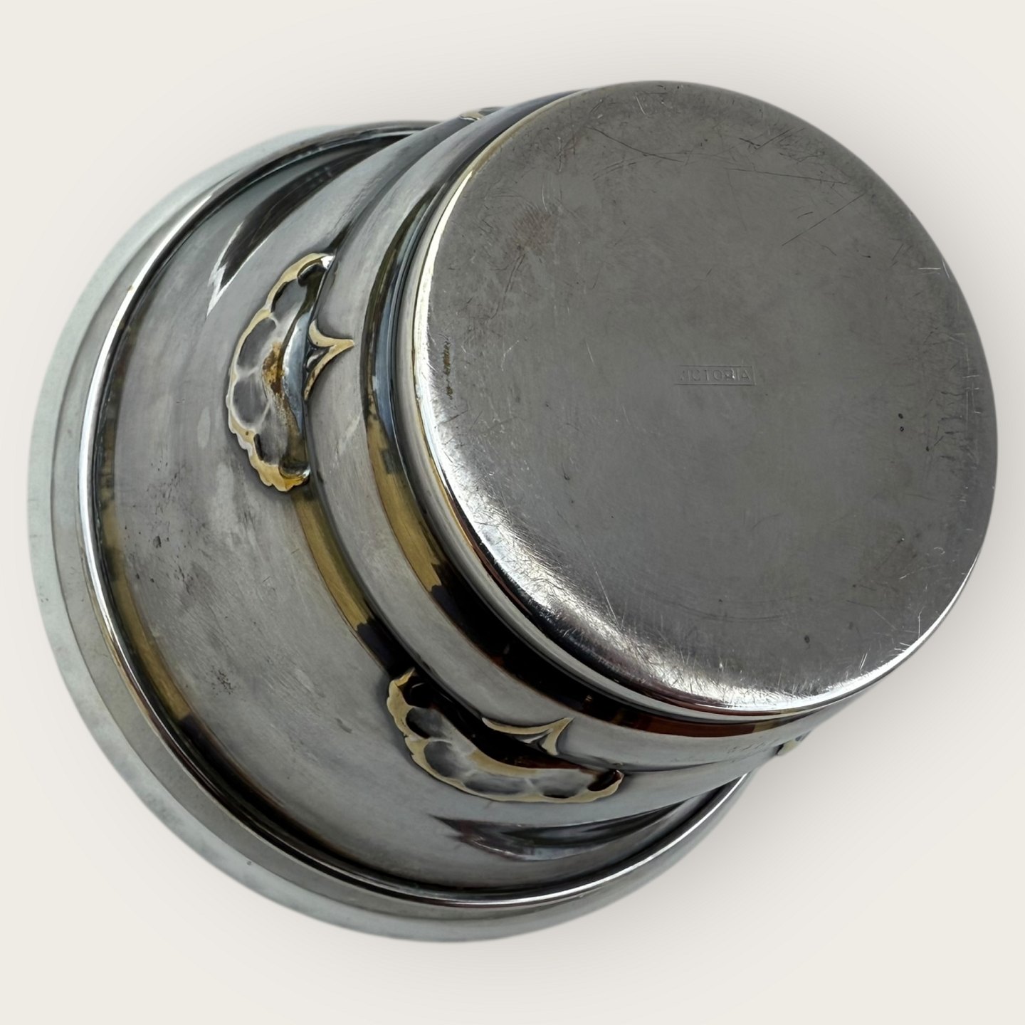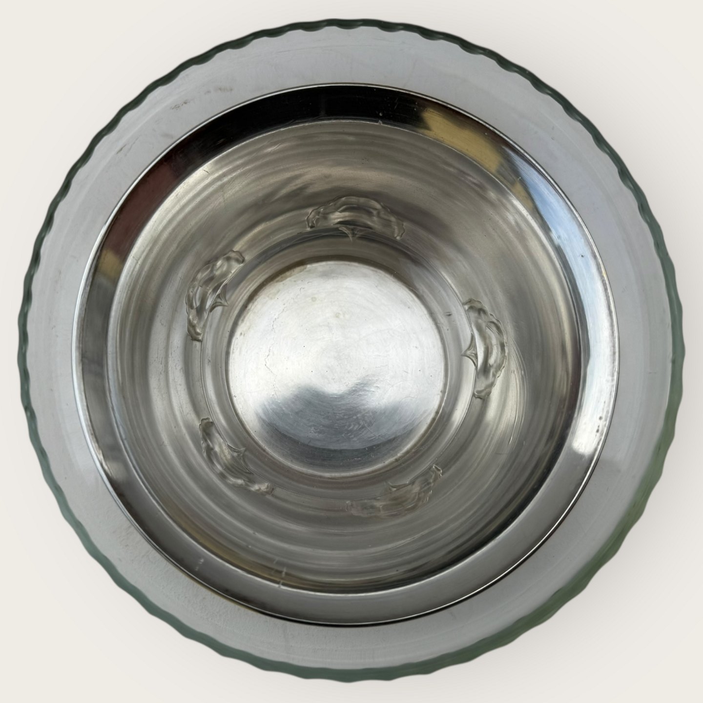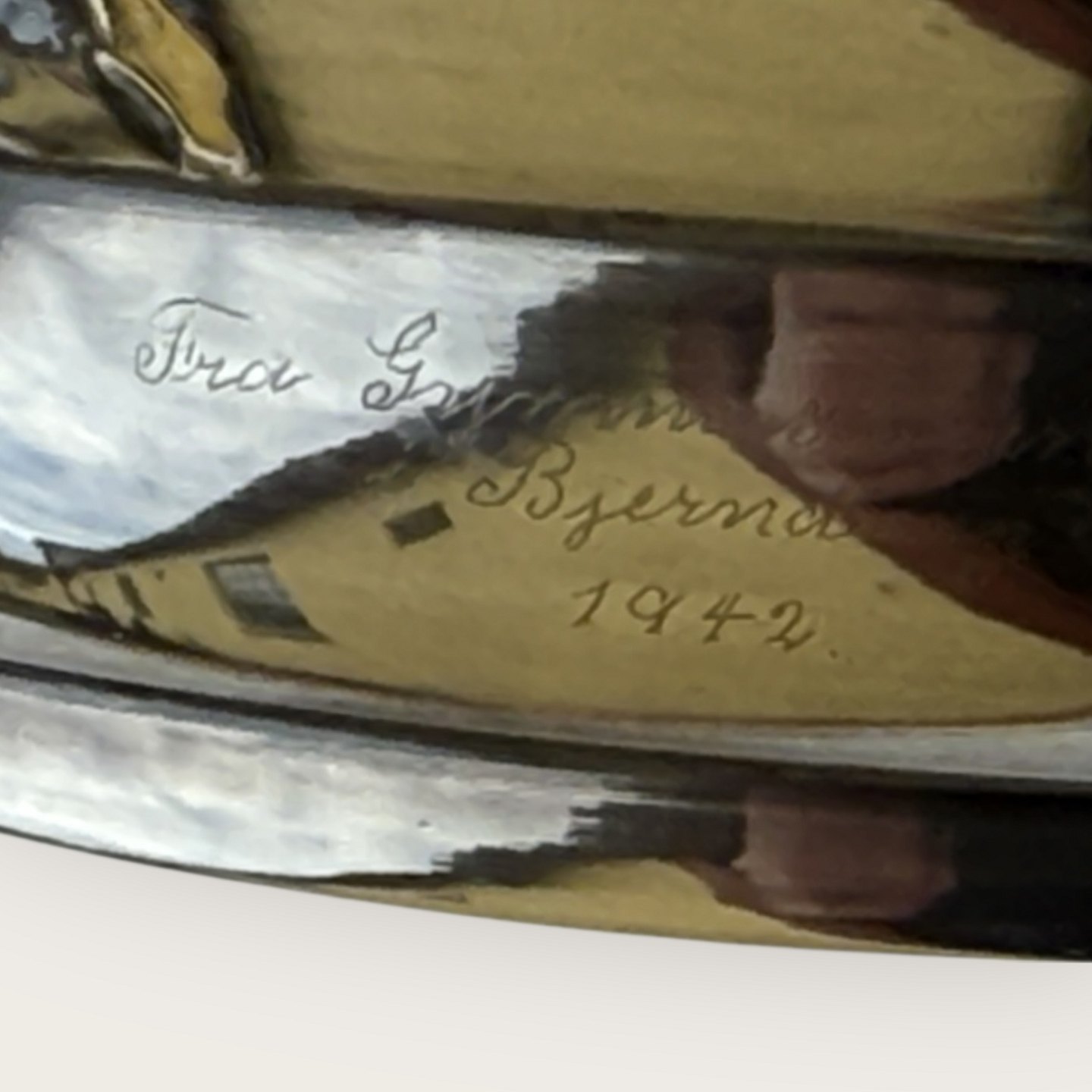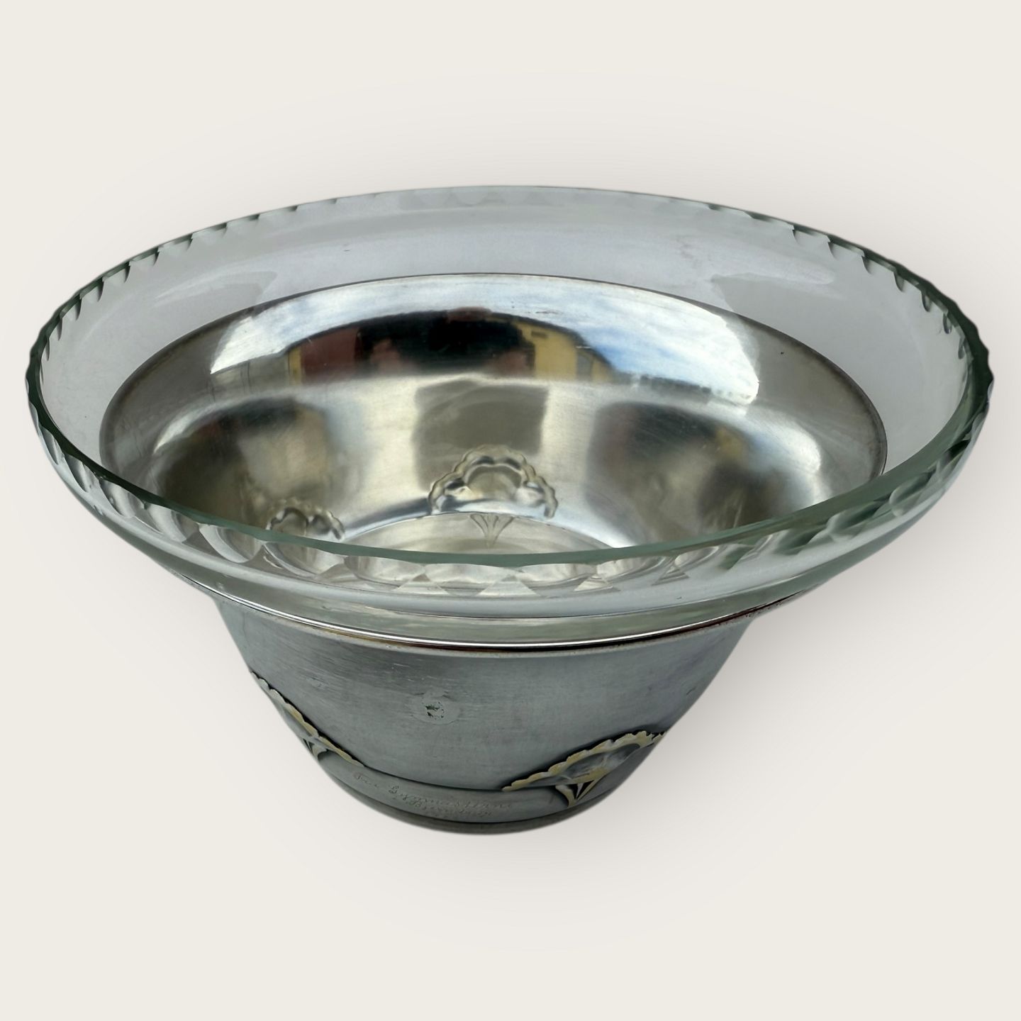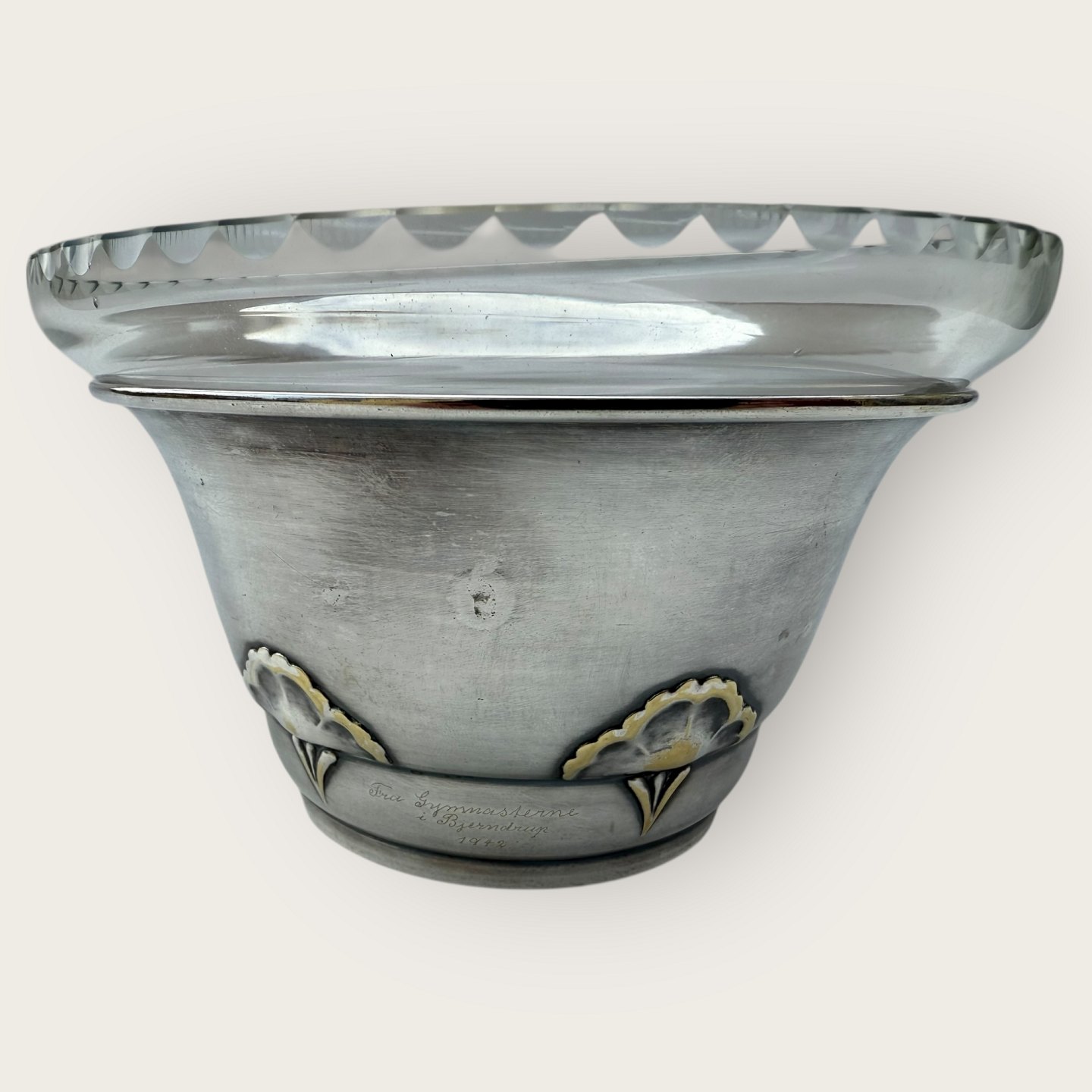 Kleine versilberte Schale mit Glaseinsatz, Höhe 8,5 cm, Durchmesser 13,8 cm, Glaseinsatz in gutem Zustand, versilberte Schale mit Patina und Gravur: Von den Turnern in Bjerndrup 1942 / Fra gymnasterne i Bjerndrup 1942