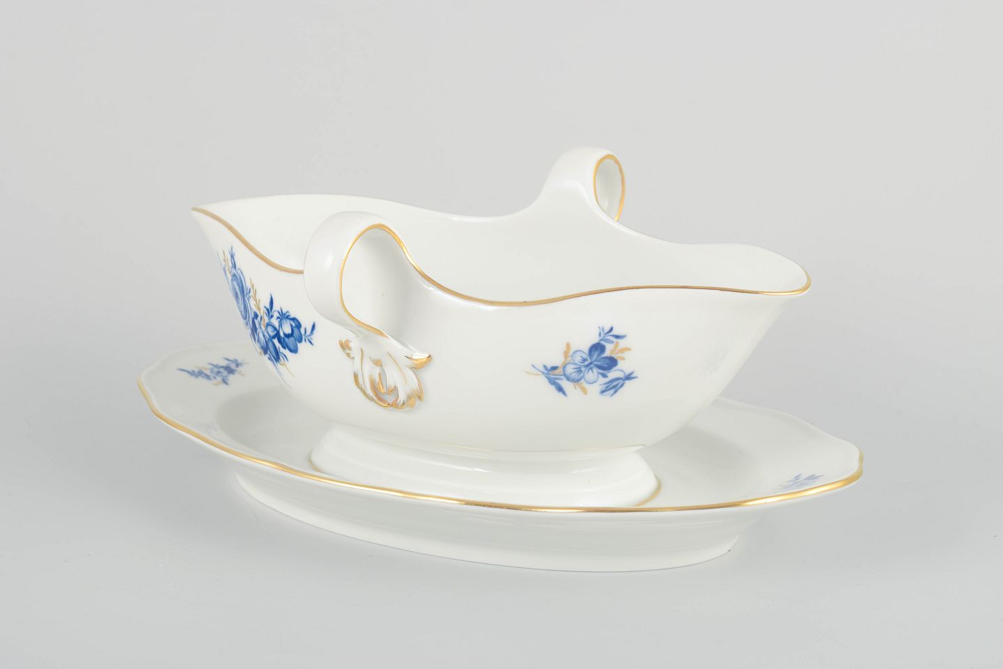 Hånddekoreret porcelæn med håndmalede blå blomsterdekorationer og forgyldte stafferinger langs kanter og hank. Elegant asymmetrisk form med dobbelt hank.