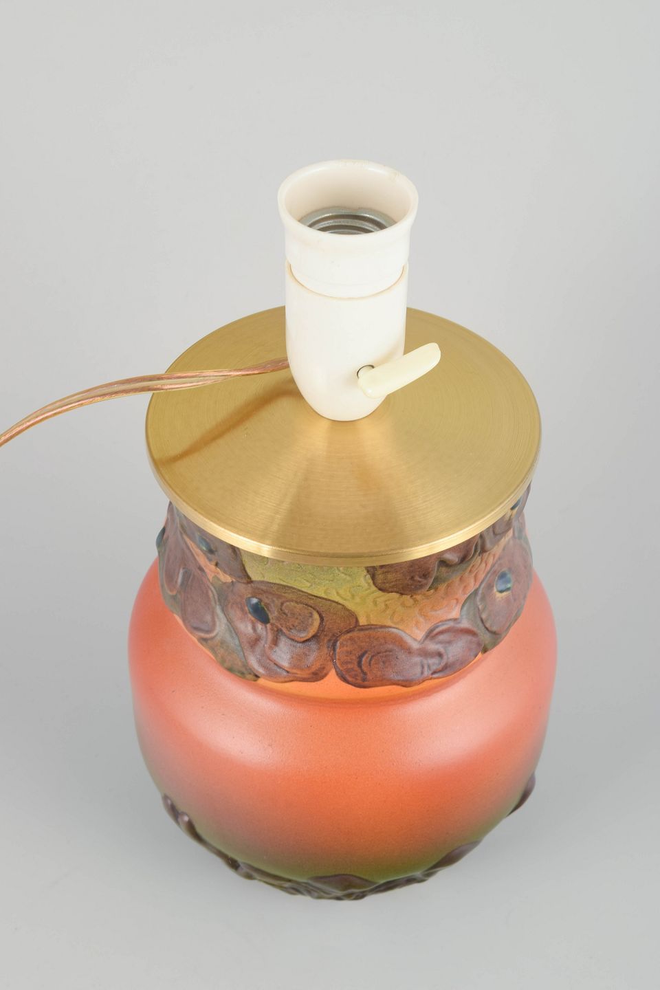 Keramisk lampefod i glaseret keramik med plastisk modelleret blomsterrelief i brune og grønne nuancer, over mat orange grundglasur med grøn toning mod bunden. Originalt metal-låg bevaret, senere monteret med nyere elektrisk fatning.