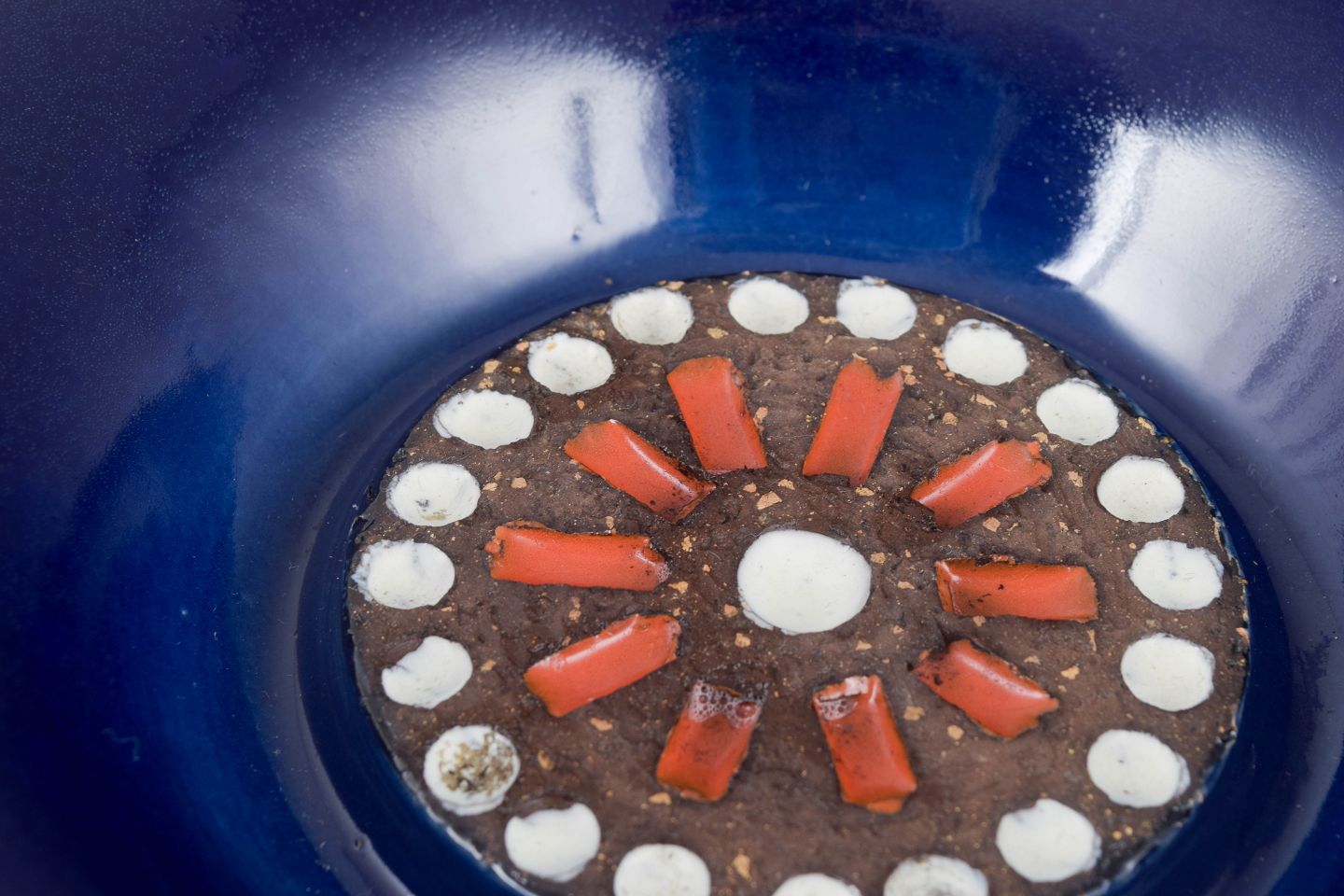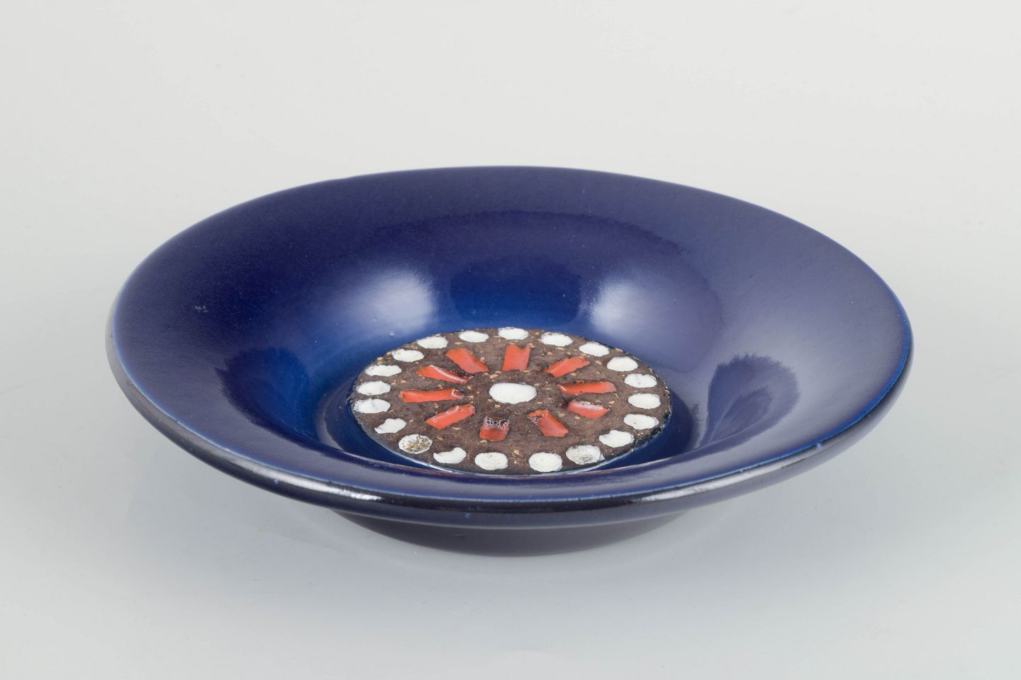 Et raffineret og dybt koboltblåt dekorationsfad med indlagt reliefkomposition i centrum, karakteriseret ved Simmulsons særegne balance mellem skandinavisk stringens og farvemættet ornamental ekspressivitet. Værket udviser et markant taktilt spil mellem glasurens dybe glans og den rå keramiske tekstur i midterfeltets mosaik.
