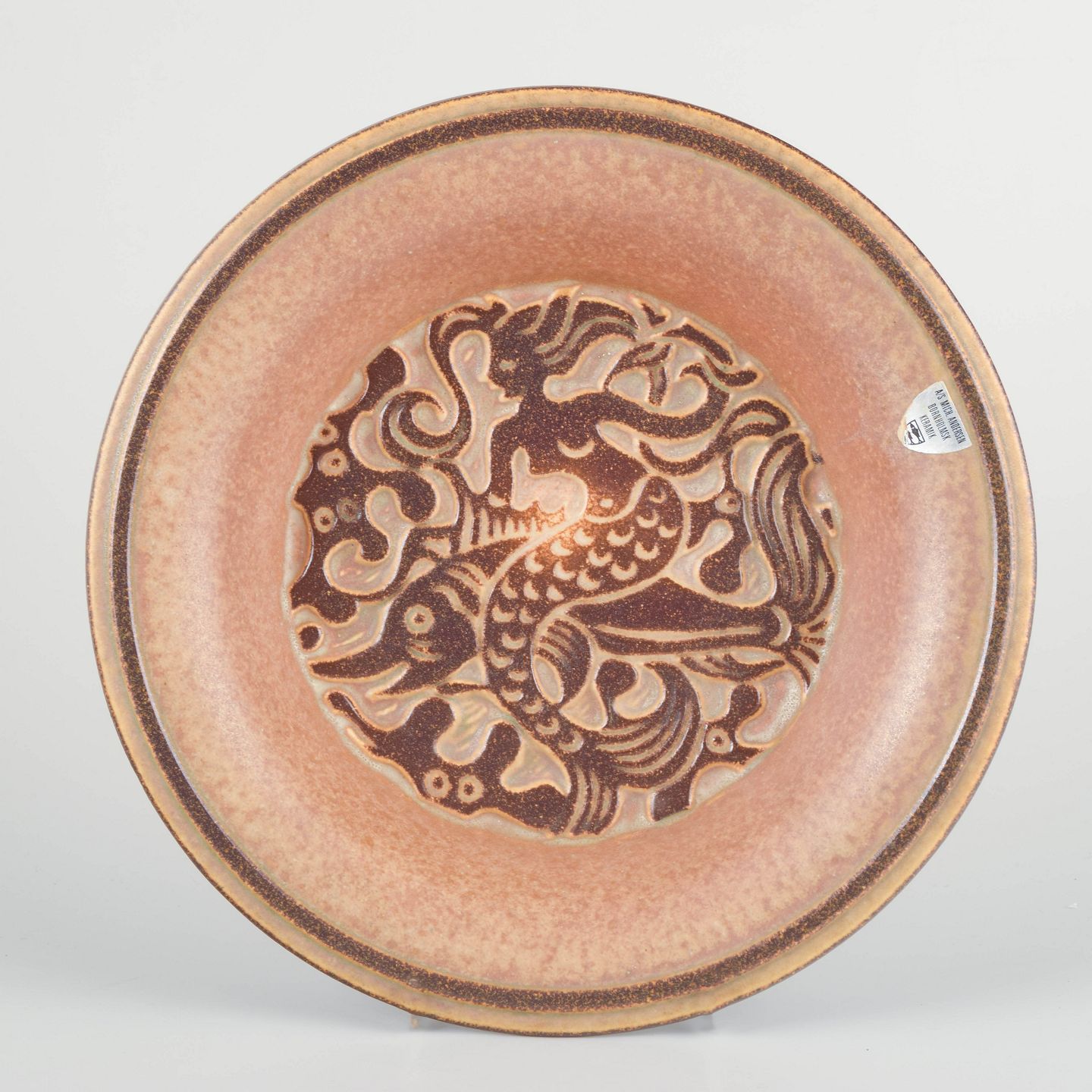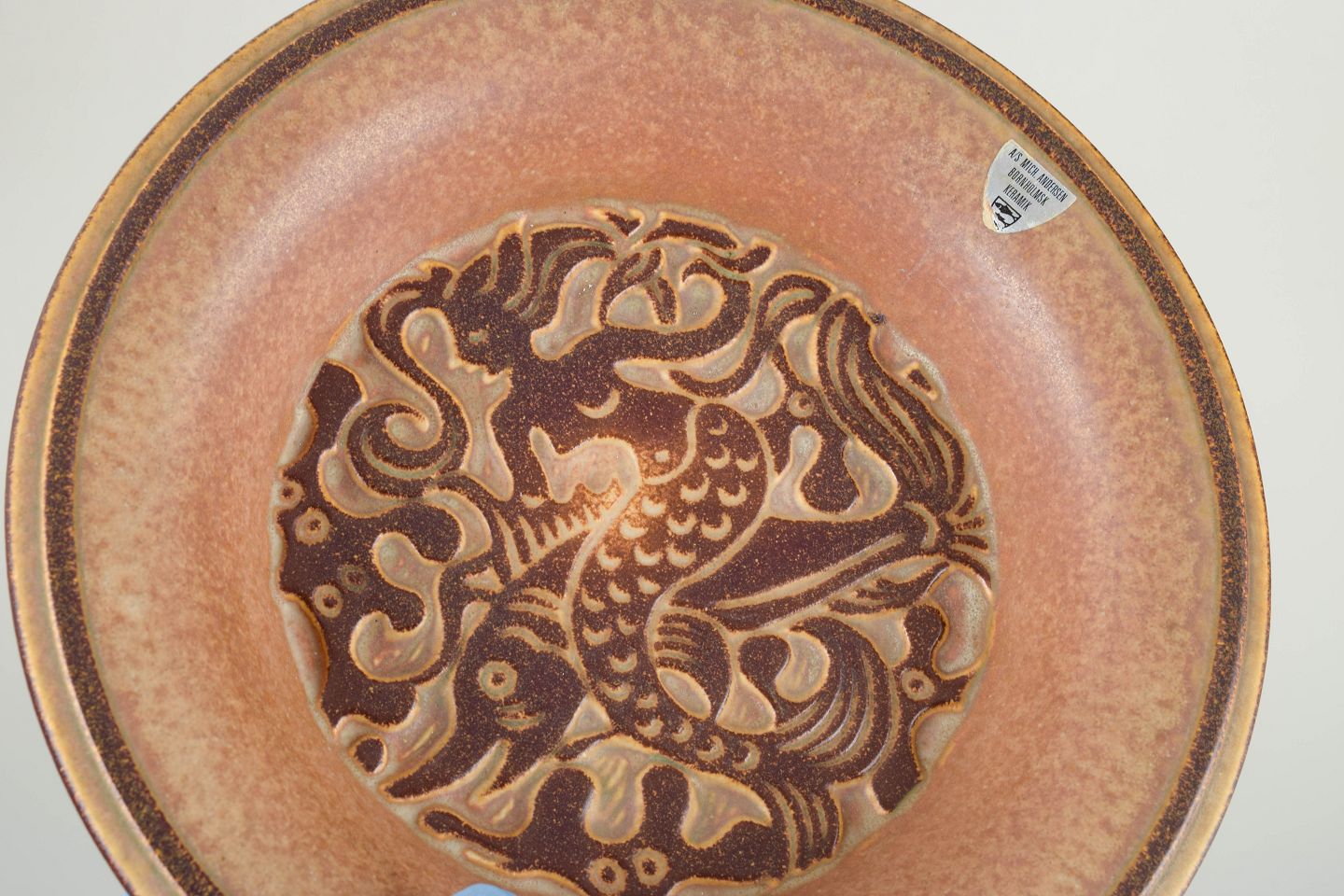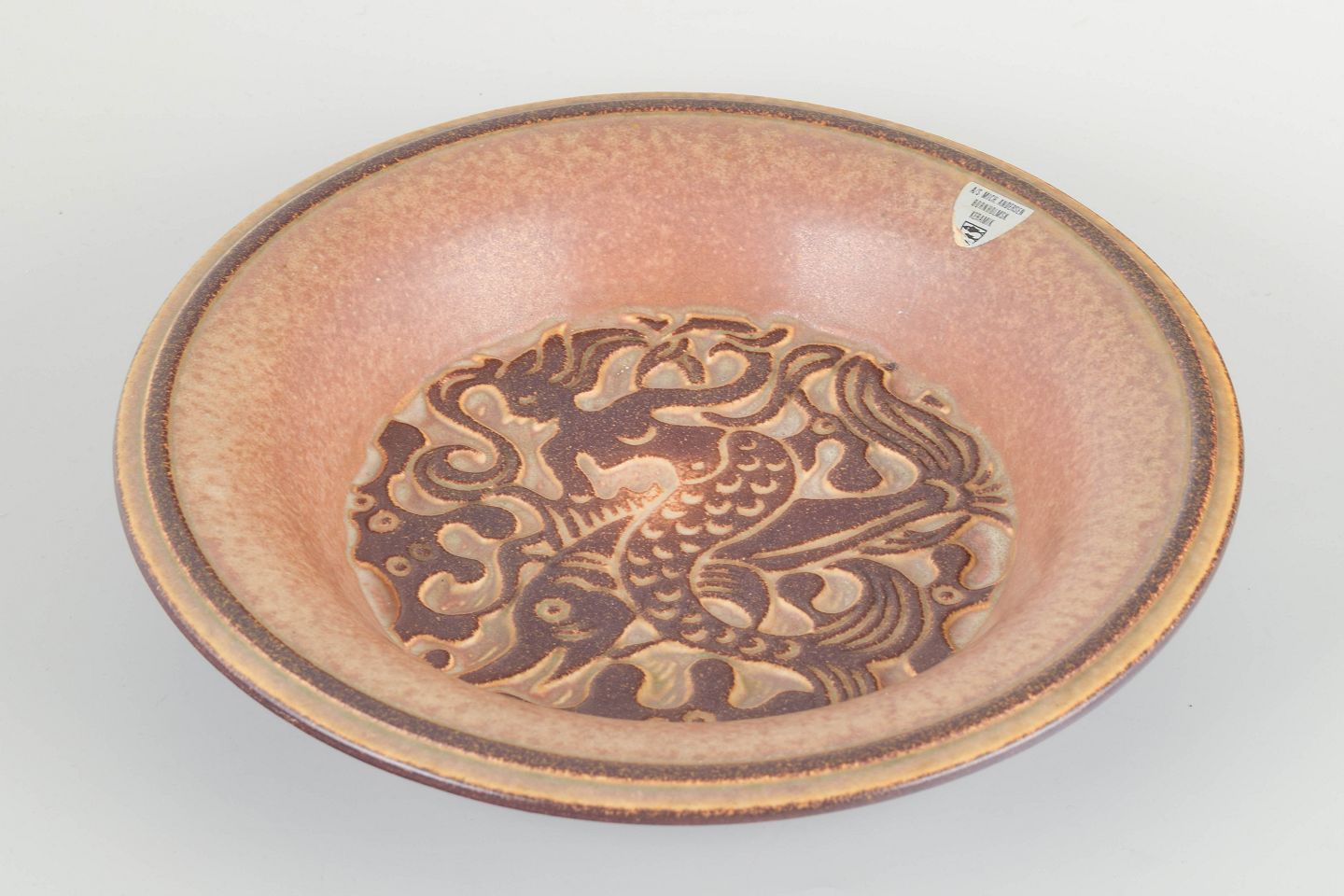 Rund stentøjsskål med reliefdekoreret centrum med stiliseret fisk og organiske bølgeformer. Model 6407/2.
