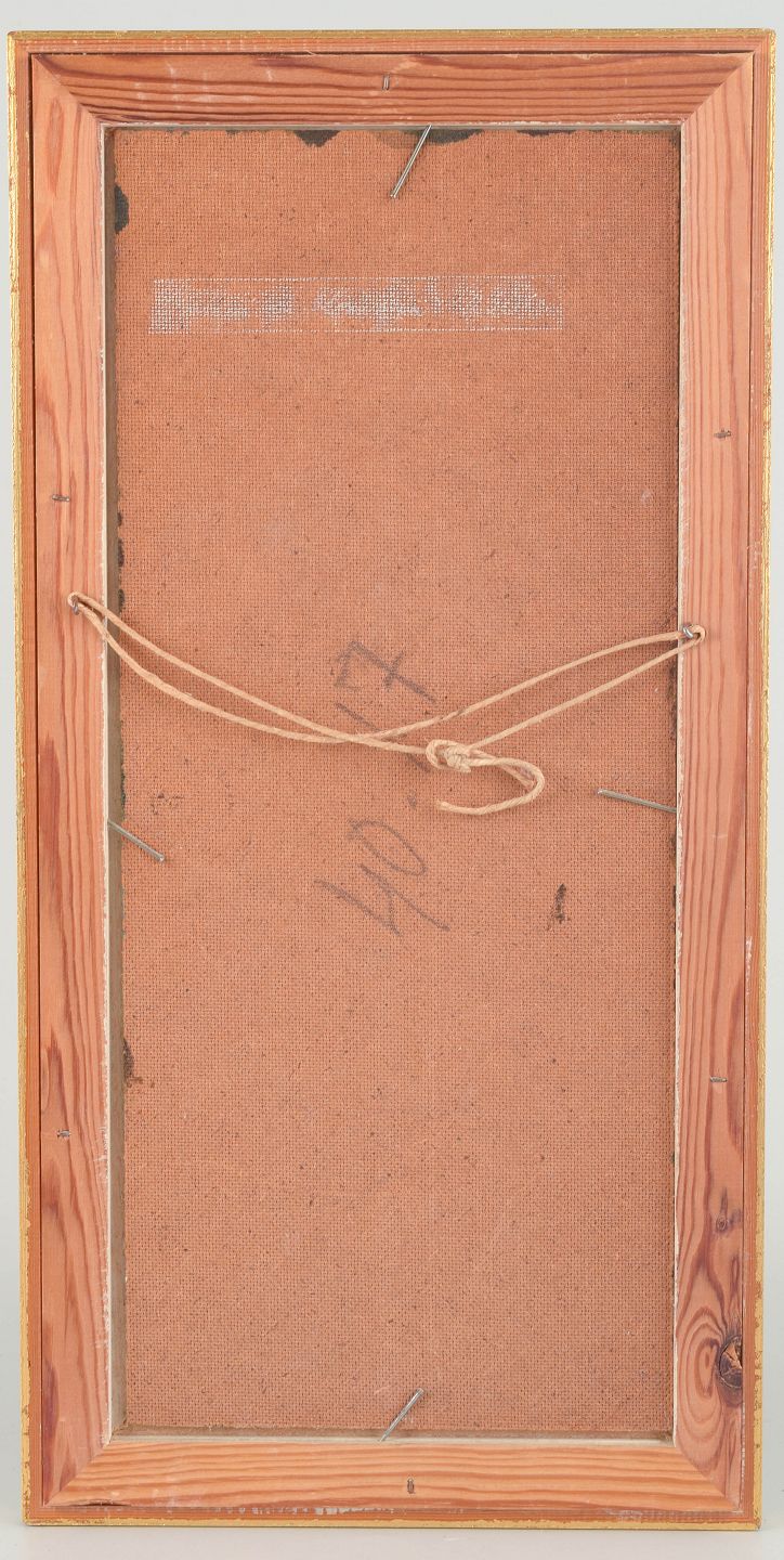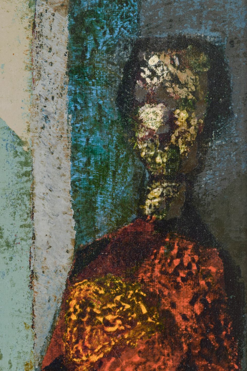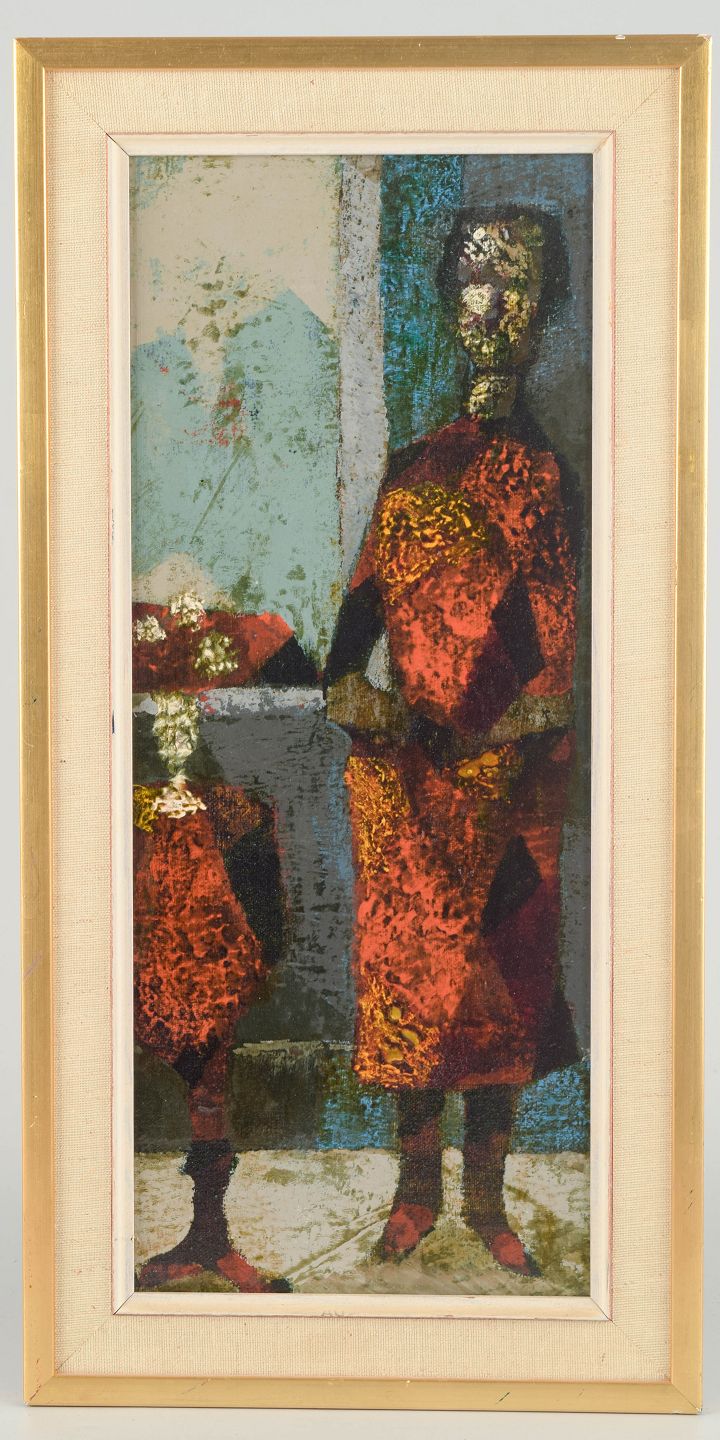 Et stemningsmættet figurmaleri med to abstraherede kvindeskikkelser, komponeret i en mosaikagtig struktur med stærke røde og gyldne toner. Den stoflige overflade og aflange vertikale komposition giver værket et ceremonielt og næsten ikonisk præg — typisk for den svenske efterkrigsmodernisme, hvor figur og ornament smelter sammen til et rytmisk billedrum.