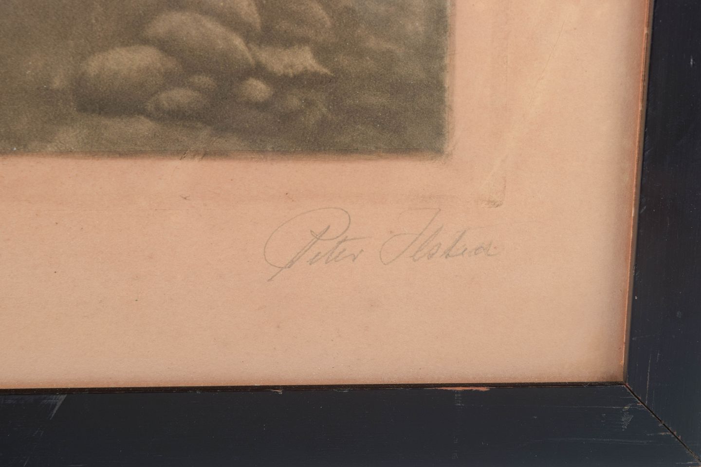 Stemningsfuldt interiørmotiv med en ung pige ved en søjle – gengivet i Ilsteds karakteristiske stille, lysmættede tonesprog. Den fint nuancerede mezzotinteteknik skaber et drømmeagtigt spil mellem lys og skygge og fremhæver den poetiske ro, som Ilsted er kendt for.