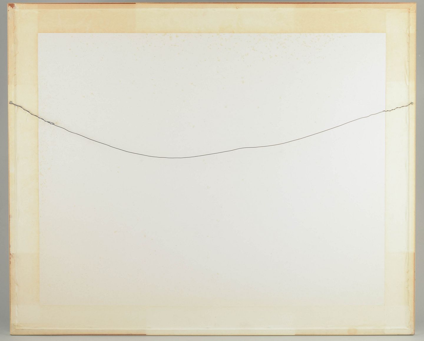 Et poetisk og bevægelsesfyldt akvarelmaleri, hvor musikalske gule rytmer bølger diagonalt gennem billedet og opløses i en sværm af flyvende fuglesilhuetter. Til venstre anes dybere, organiske formationer i blågrå toner, mens en lysere blå figurform svæver frit mod højre. Et værk med drømmende lethed og spirituel energi.