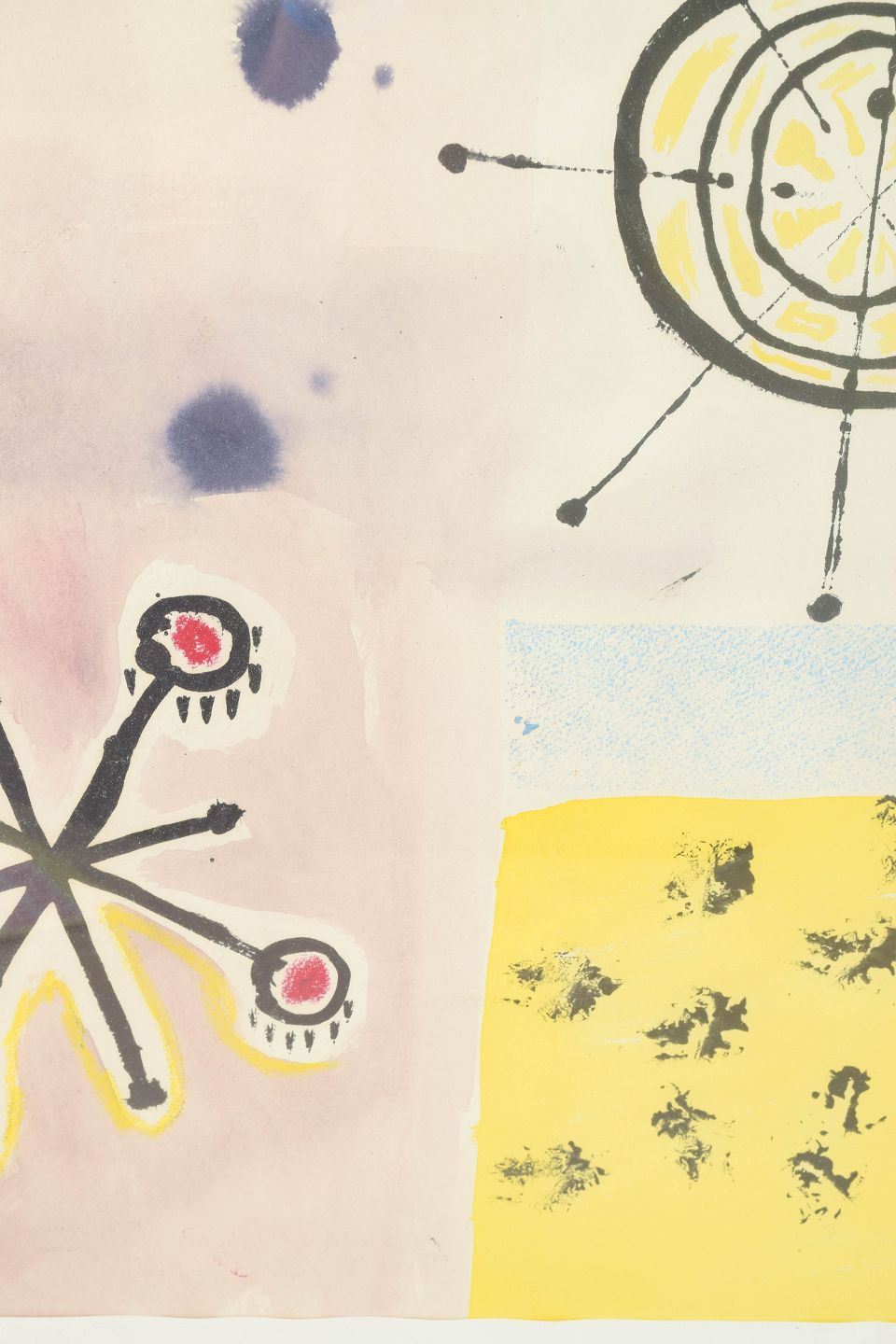 Et poetisk abstrakt værk med kosmiske og biomorfe former udført i bløde pastelfarver. Spiralfigurer, svævende prikker og radierende strukturer minder om planetariske eller mikroskopiske konstellationer, der udfolder sig på en flade i sarte rosa, elfenbens- og gulnuancer. Udtrykket er intuitivt, lyrisk og grafisk med et klart surrealistisk præg fra midten af det 20. århundrede.