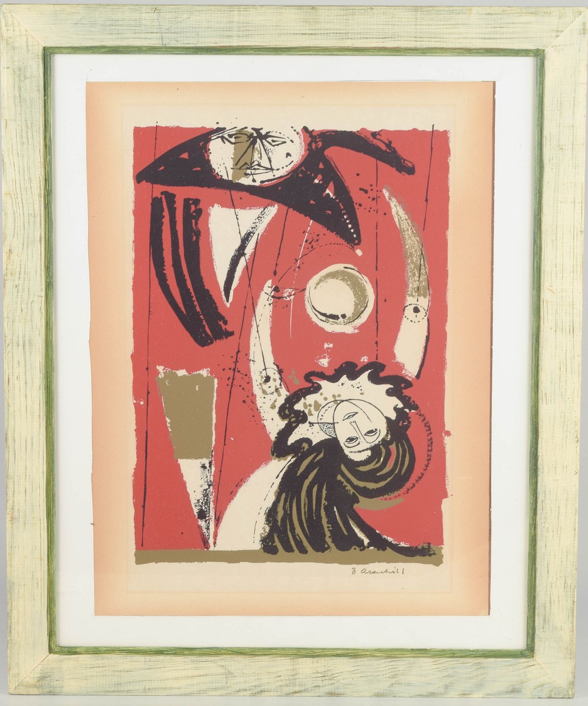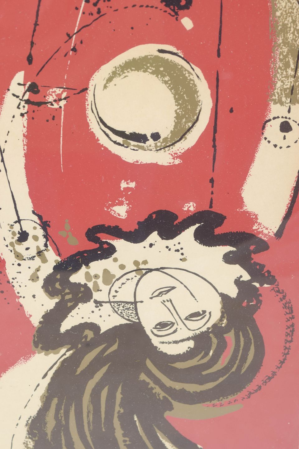 Abstrakt komposition med stiliserede kosmiske figurer og grafiske former i røde, gyldne og sorte toner, typisk for Arenhills poetiske billedsprog med inspiration fra teater, musik og drømmesekvenser.