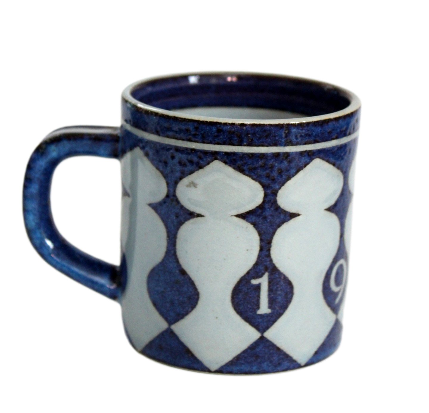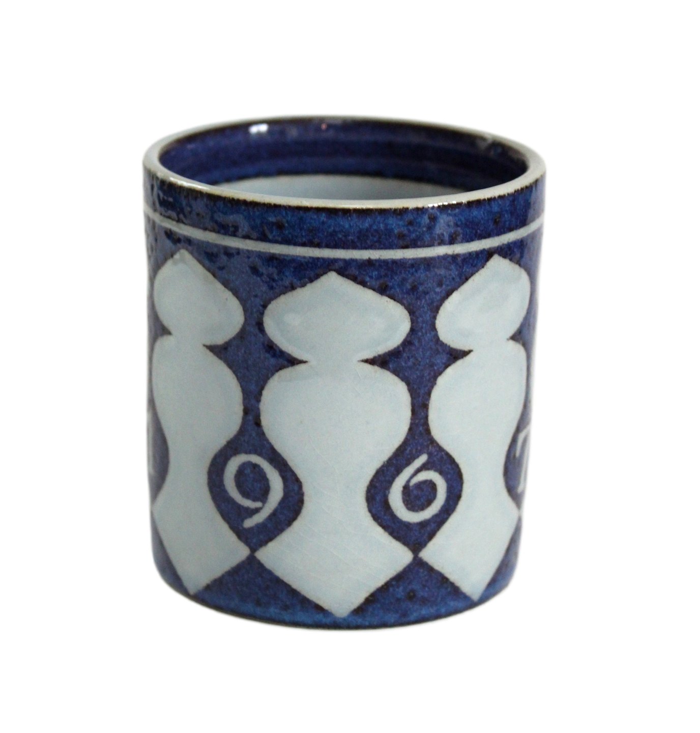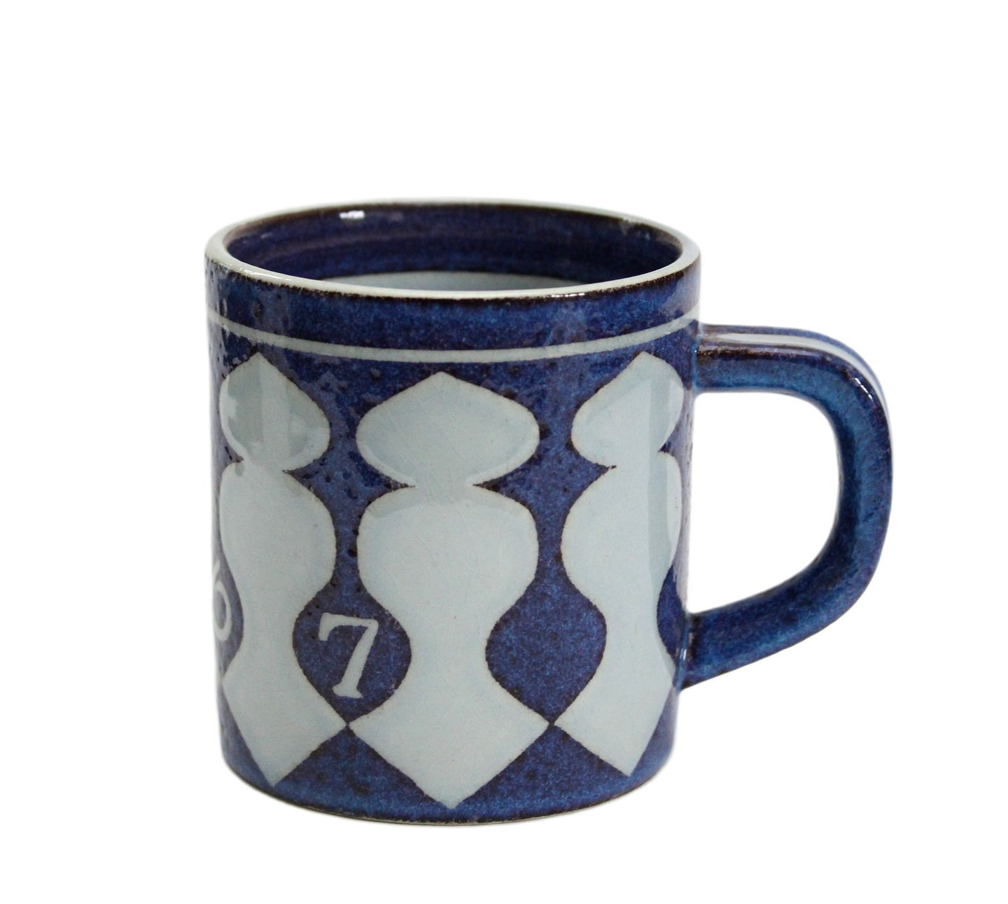 Text zugänglich auf Dänische: Aluminia, Lille årskrus i kunstfajance. Designer Nils Thorson. Dette er det første årskrus. Nr. 3495. Årskrus er produceret fra perioden 1967 til 2014, fra 1968 er det Royal Copenhagen. Højde 7,5 cm. Diameter 6,8 cm. Lettere overfladekrakelering. Pris: 700 kr. stk. Lager: 1