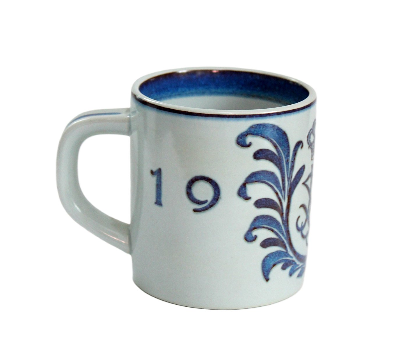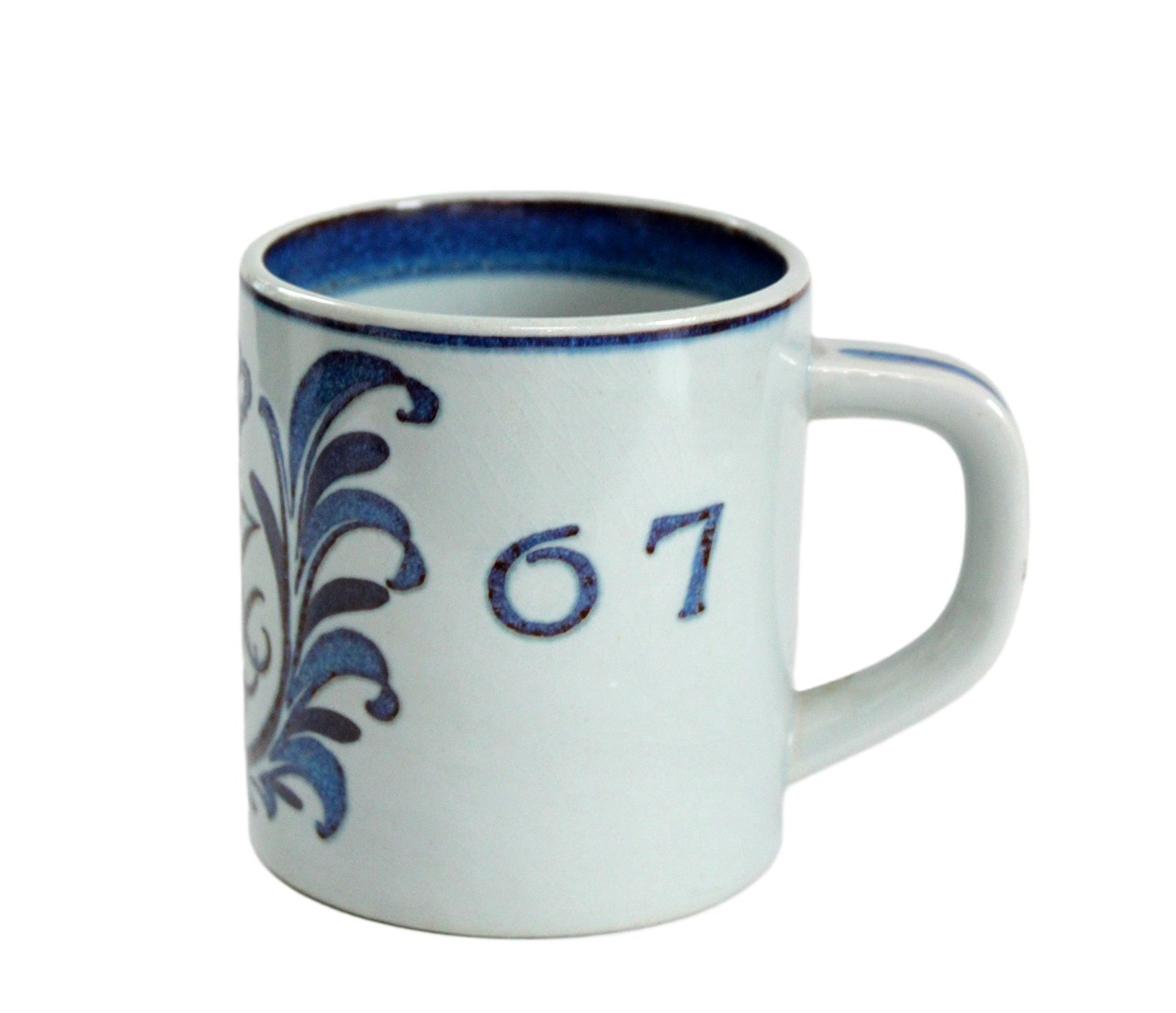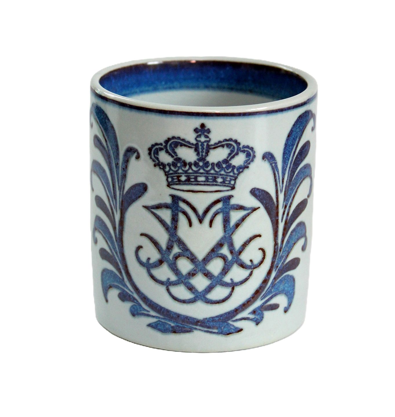 Text zugänglich auf Dänische: Aluminia, Lille årskrus i kunstfajance 1967. Speciel edition med Dronning Margrethes Monogram. Designer Nils Thorson. Nr. 3495. Højde 7,5 cm. Diameter 6,8 cm. Lettere overfladekrakelering. Pris: 800 kr. stk. Lager: 2