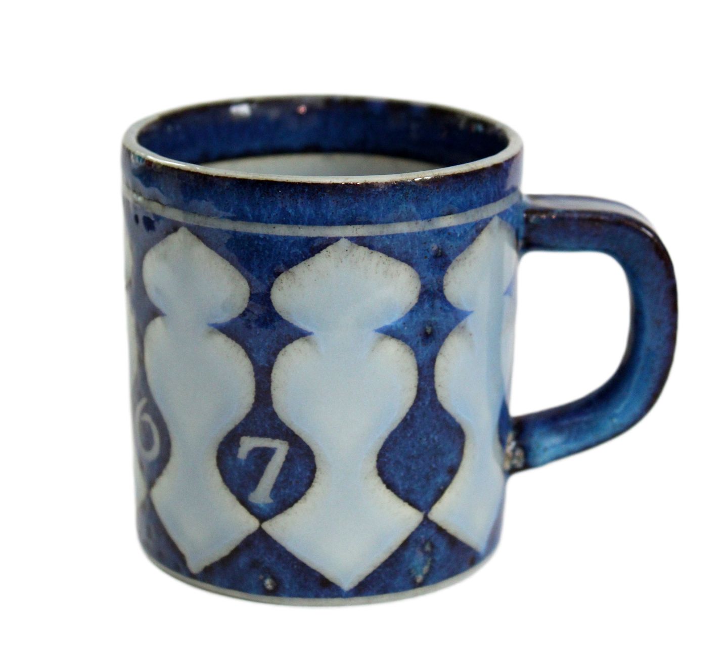 Text zugänglich auf Dänische: Aluminia, Lille årskrus i kunstfajance. Designer Nils Thorson. Dette er det første årskrus. Nr. 3495. Årskrus er produceret fra perioden 1967 til 2014, fra 1968 er det Royal Copenhagen. Højde 7,5 cm. Diameter 6,8 cm. Lidt ujævn bemalet kant. Pris: 700 kr. stk. Lager: 1