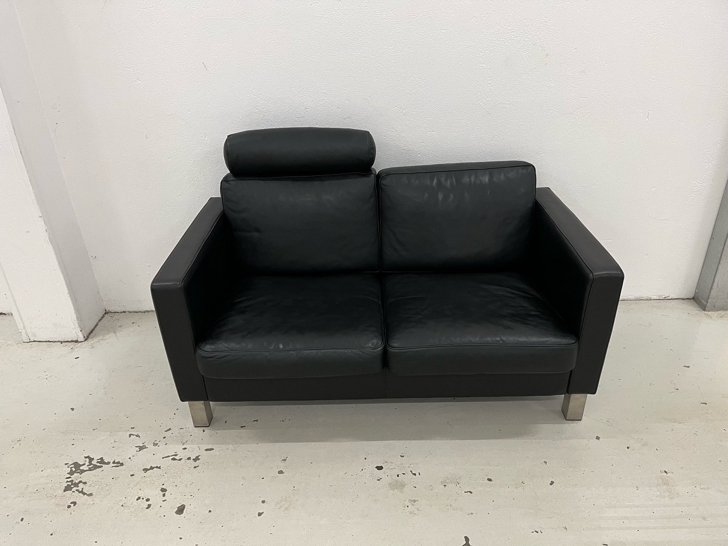 Mogens Hansen MH321 2-Sitzer-Sofa in schwarzem Prestige-Leder und mit Beinen aus gebürstetem Stahl. Neupreis 35.403,-. Das Sofa ist gereinigt und lederbehandelt und in wirklich schönem Zustand, einschließlich 1 Nackenkissen. Das Sofa hatte einen Besitzer und stammt aus einem tier-/rauchfreien Haushalt. PS hat auch ein 3-Sitzer-Sofa des gleichen Modells auf Lager. Schönes 2-Sitzer-Sofa im klassischen Designs von Mogens Hansen. Das Sofa ist mit einem daunengefüllten Sitzeinsatz ausgestattet, der genau den richtigen Komfort und die richtige Optik bietet. Da das Sofa in einem leichten und einfachen Design gebaut ist, wirkt es in einem Wohnzimmer nicht schwer, sondern eher leicht, schön und mit einer fantastischen Haltbarkeit, die der Verwendung durch die ganze Familie standhält. Das Sofa wird in Mogens Hansens eigener Fabrik in Aarhus hergestellt, wo alle Komponenten der Möbelproduktion in Dänemark hergestellt werden und hohen Umweltstandards entsprechen. Mit einem Sofa von Mogens Hansen investiere