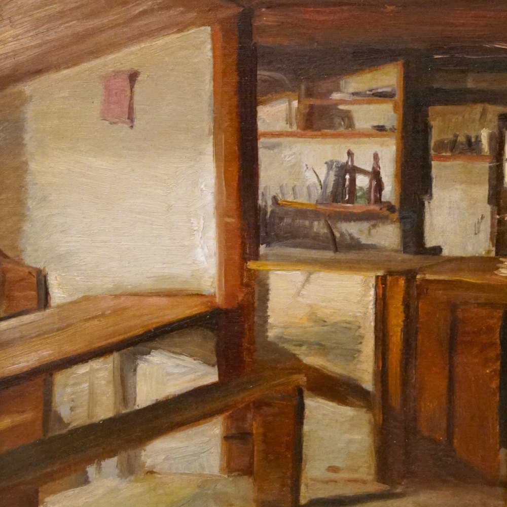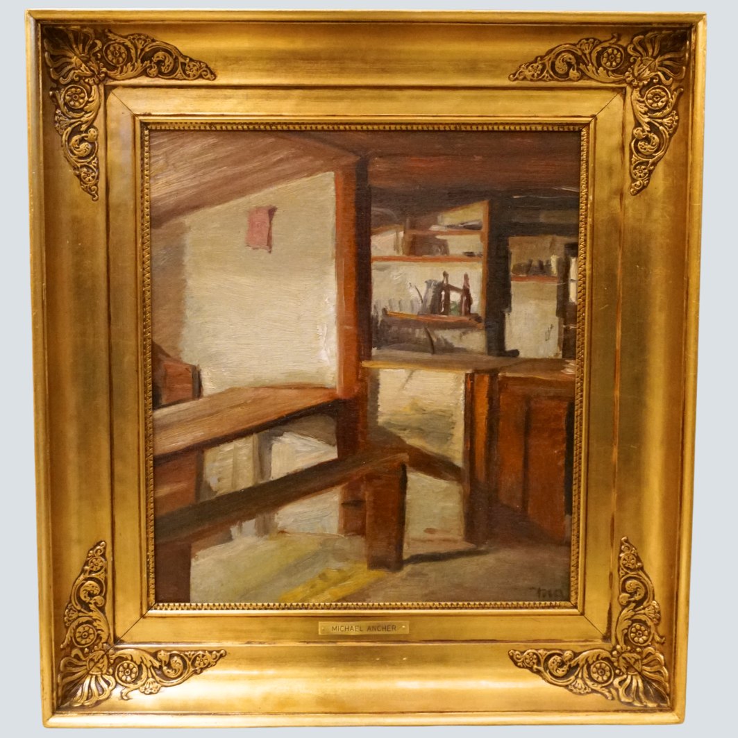 Michael Ancher; Oliemaleri. Med motiv af interiør. Signeret "MA".