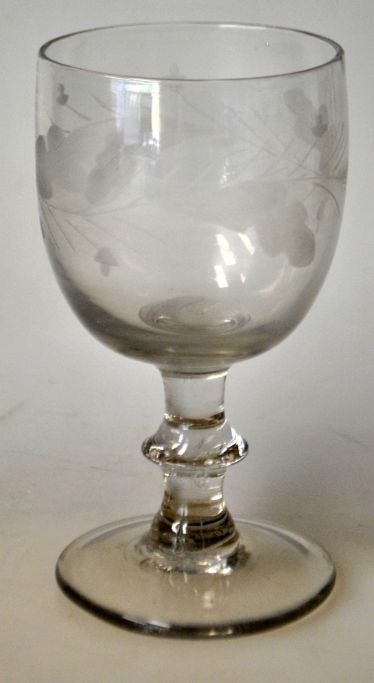 Weinglas mit Eichenblattschliff, Dänemark, 19. Jahrhundert. Stiel mit Knopf. Schliff mit 4 Blättern und 8 Eicheln oben und unten. H.: 11 cm.