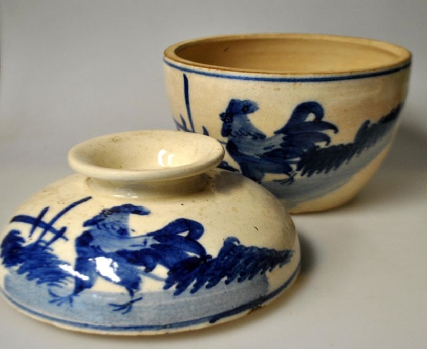 Chinesische Speiseterrine mit Deckel, Fayence, 19. Jahrhundert. Blau dekoriert mit Hahn und Schild. H.: 19 cm. Durchmesser: 17 cm.