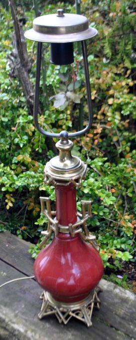 Französische Tischlampe, 19. Jahrhundert. Ehemalige Petroleumlampe, auf elektrisch umgerüstet. Bronze und Korpus aus ochsenblutfarbenem Porzellan. H.: 65 cm.