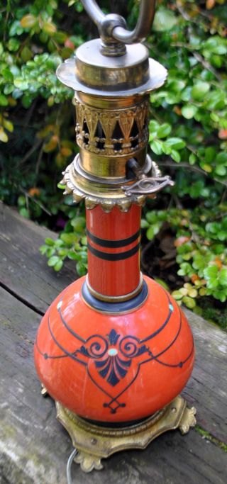 Französische Tischlampe, 19. Jahrhundert. Ehemalige Petroleumlampe, umgebaut auf elektrisch. Bronze und Korpus aus rotem Porzellan mit Verzierungen. H.: 59 cm.