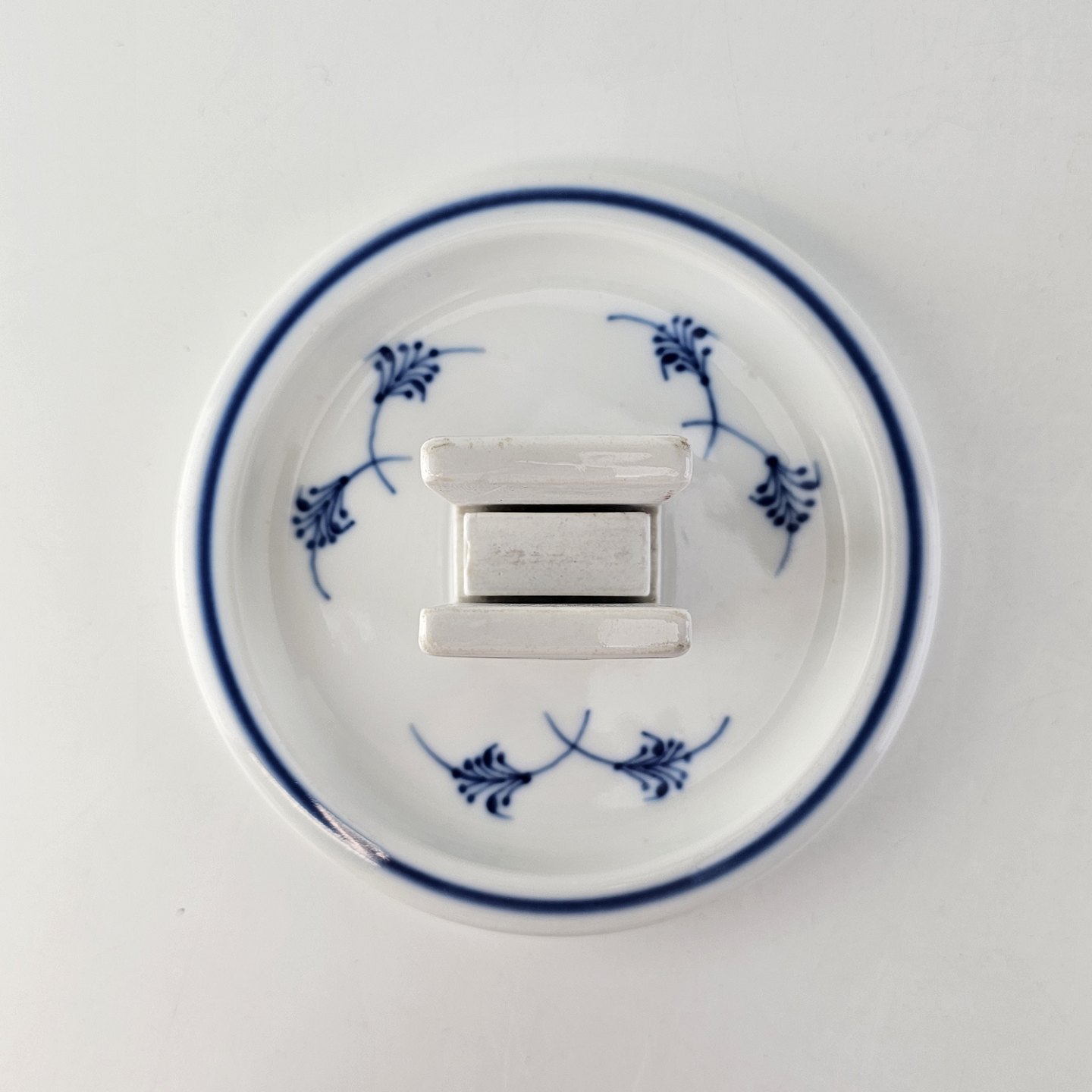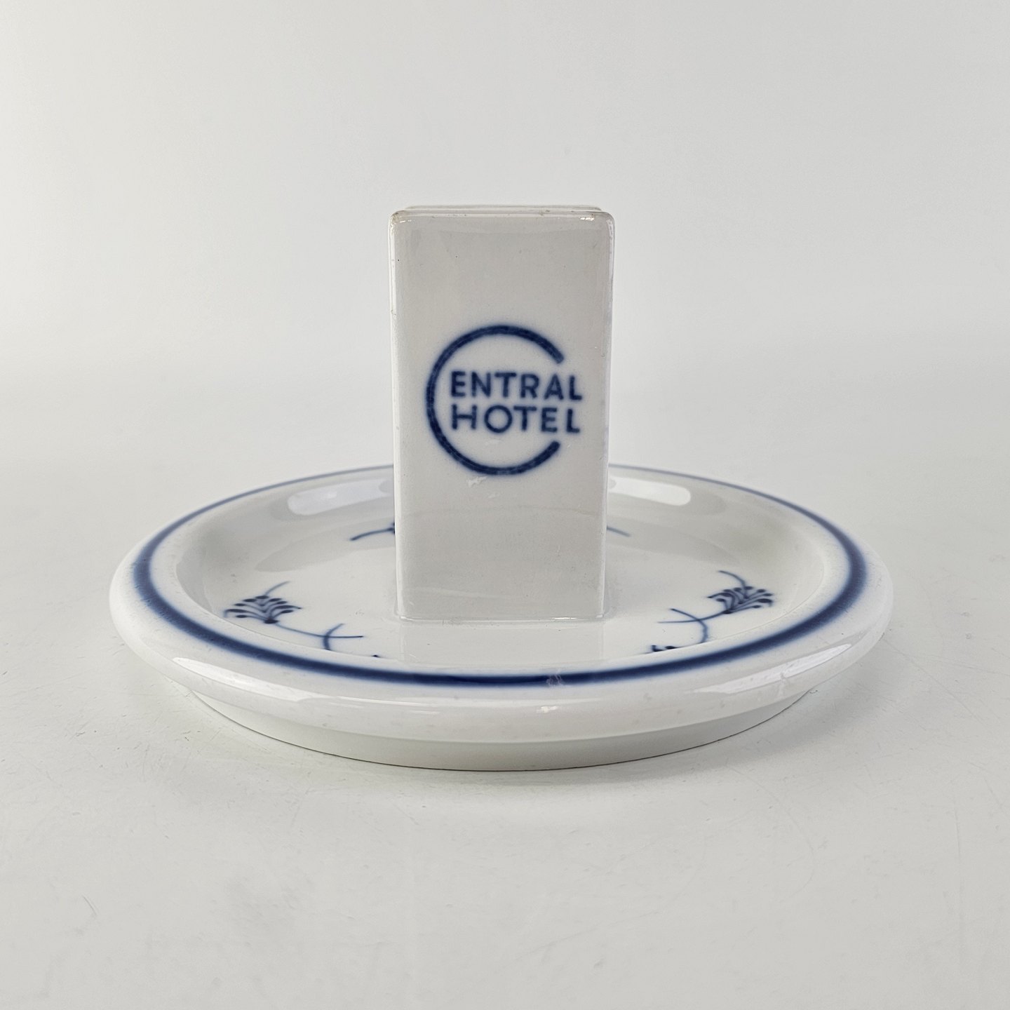 Text zugänglich auf Dänische: Tandstikkeholder i hotelporcelæn med motiv fra restaurant Kilden i Aalborg fra stellet Blåmalet