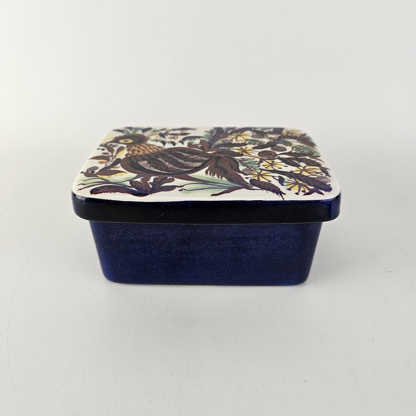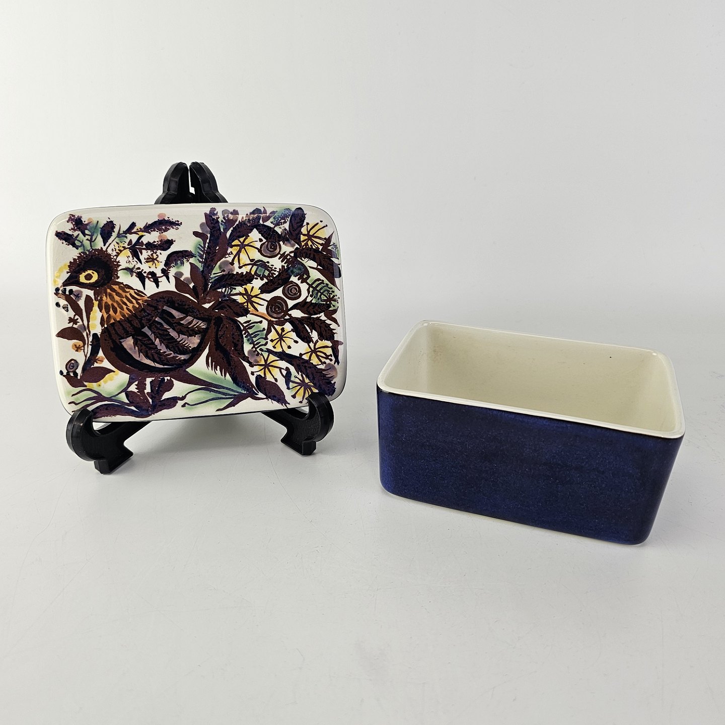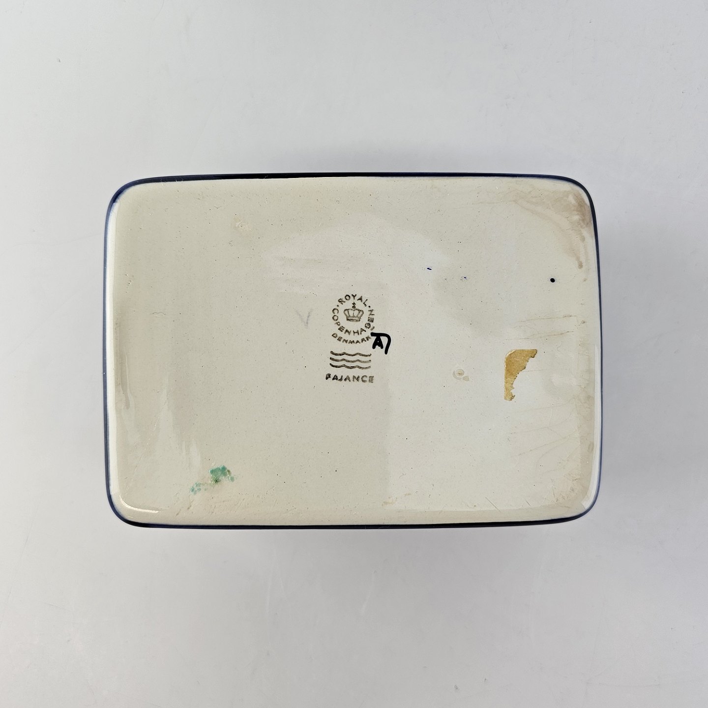 Text zugänglich auf Dänische: Smørboks fra serien Tenera. Boksen er i hvid fajance med blåmalet yderside og låget er dekoreret med motiv af en påfugl