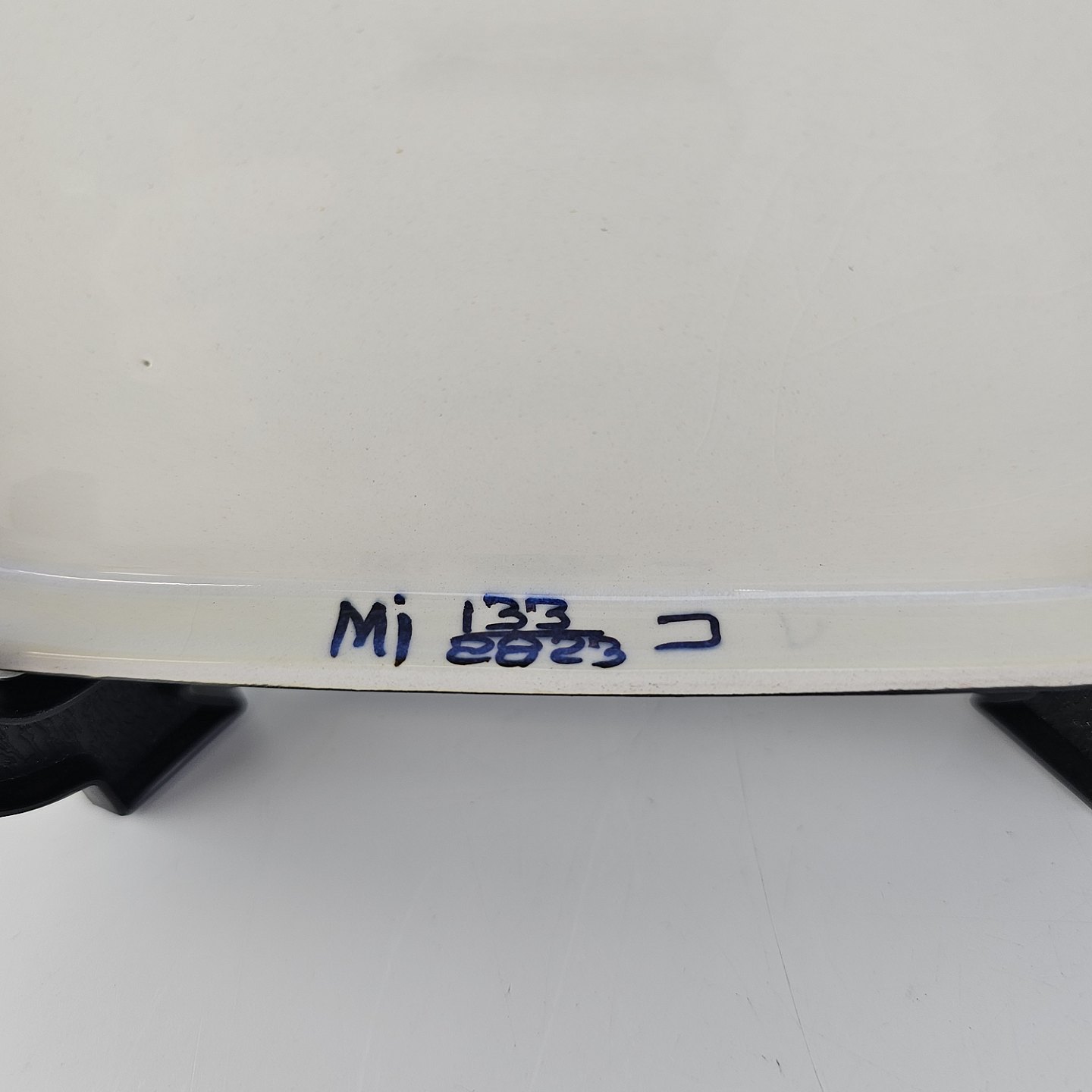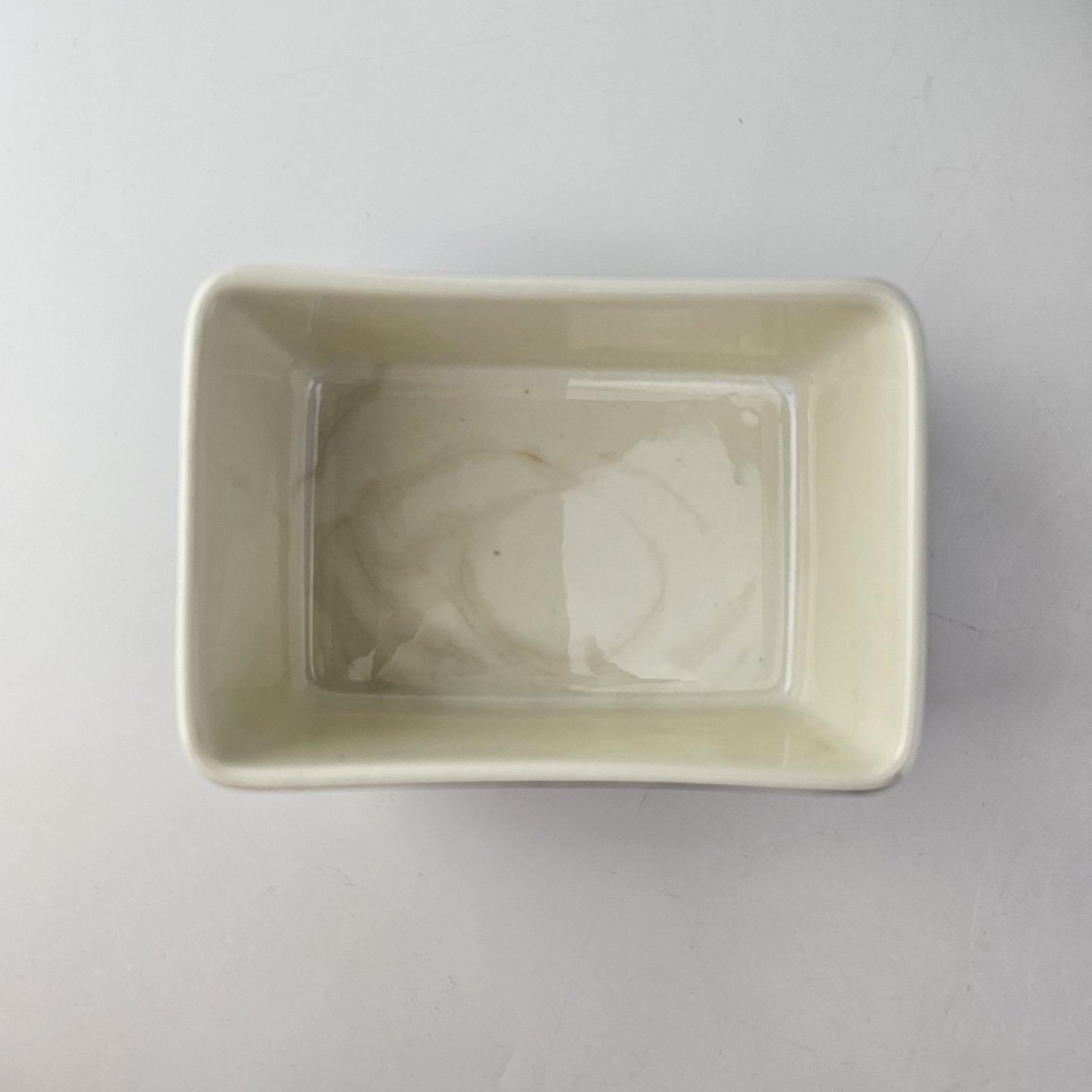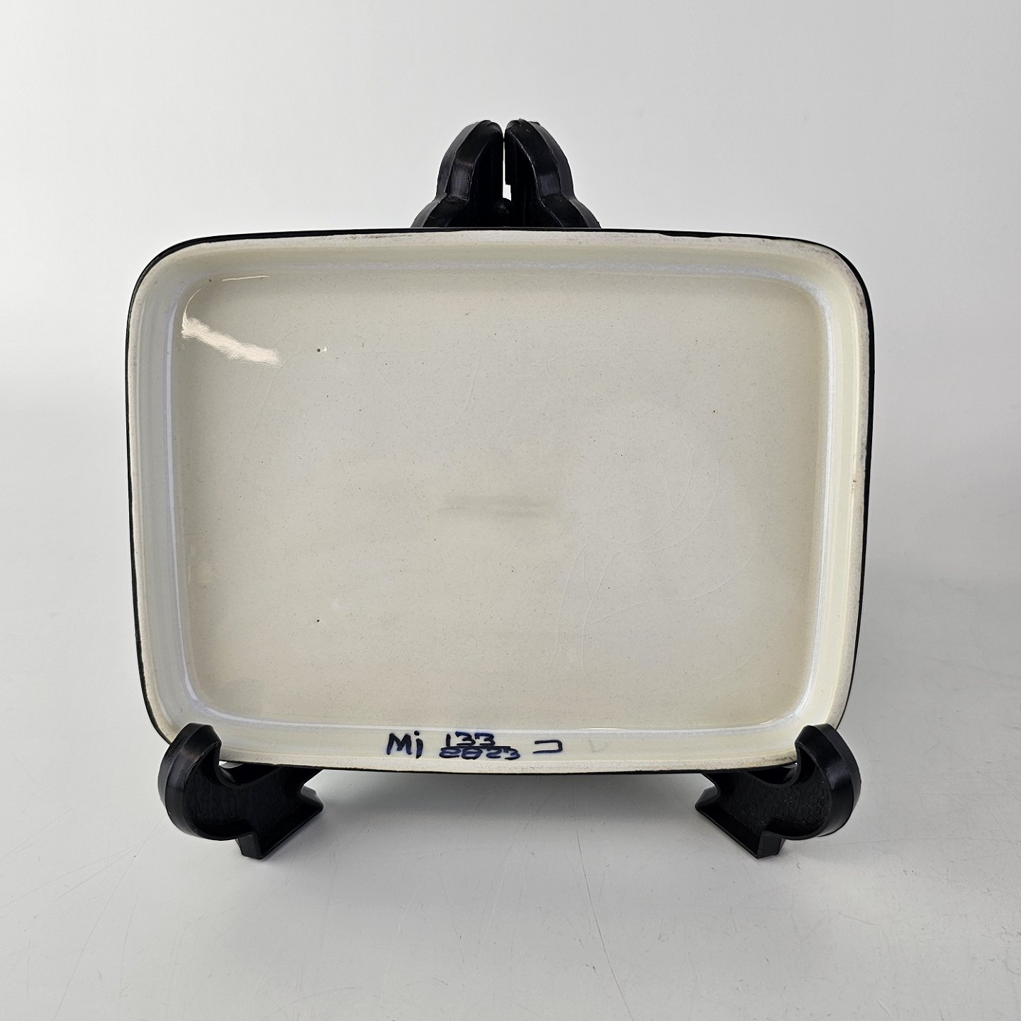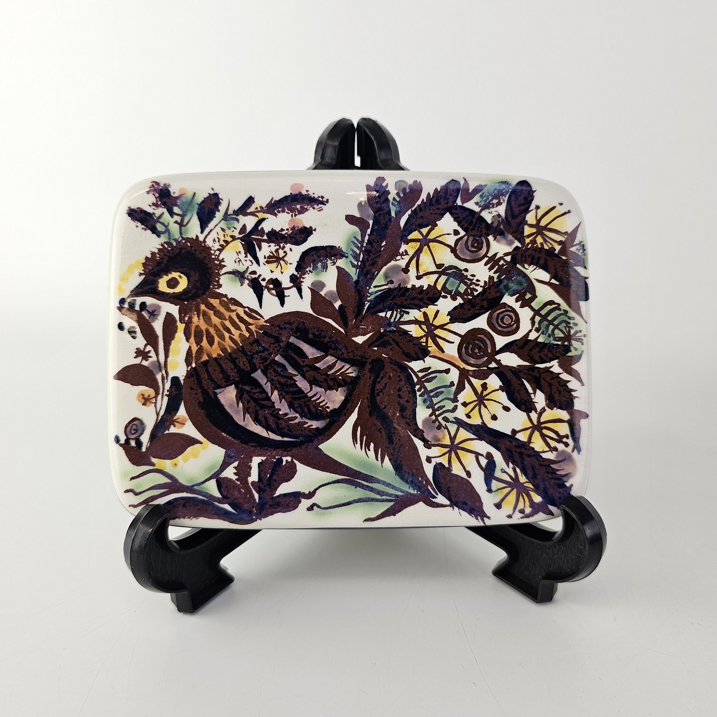 Text zugänglich auf Dänische: Smørboks fra serien Tenera. Boksen er i hvid fajance med blåmalet yderside og låget er dekoreret med motiv af en påfugl