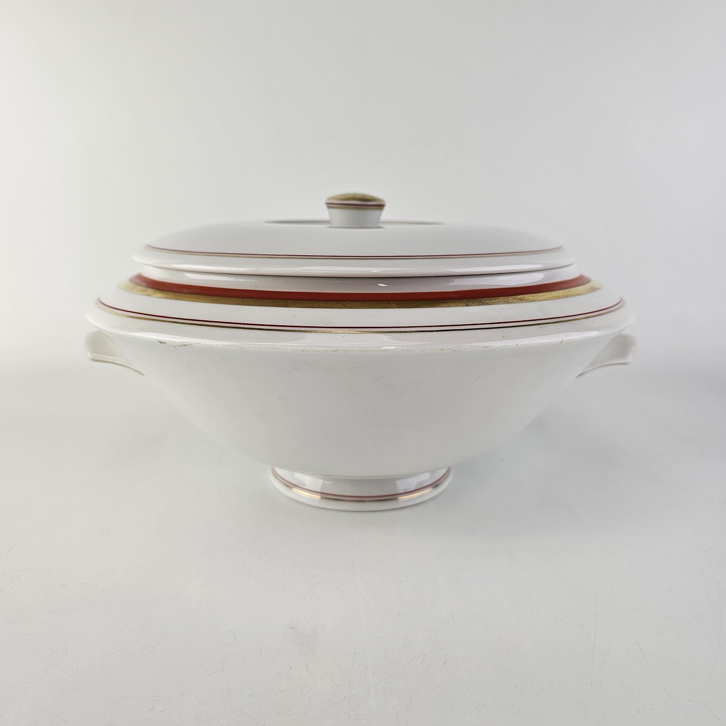 Service i glat hvidt porcelæn dekoreret med rød & guld bånd samt to tynde streger.