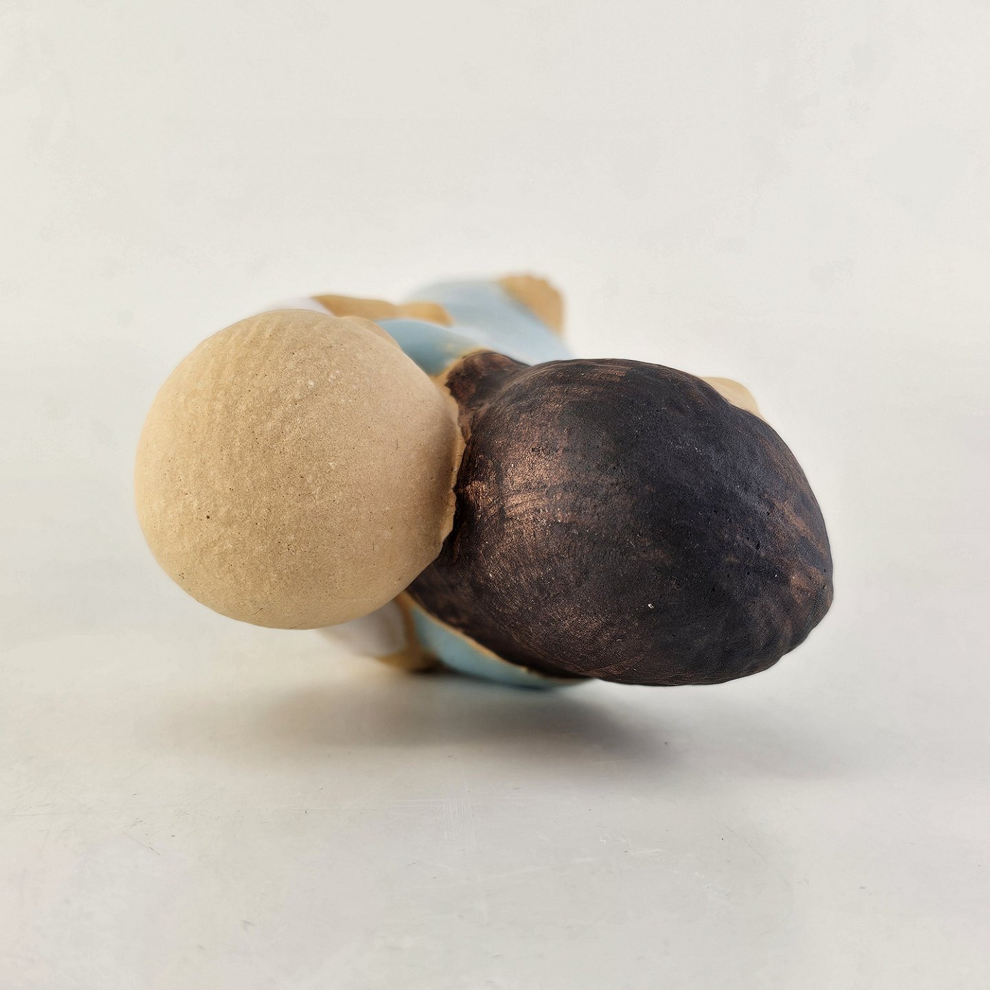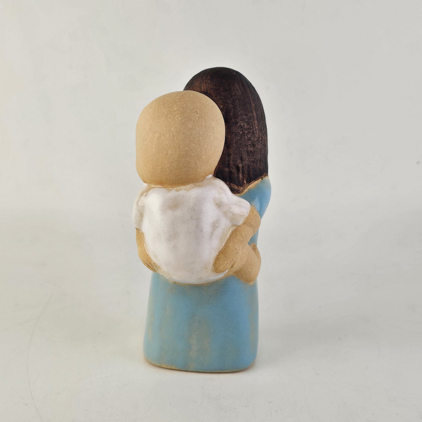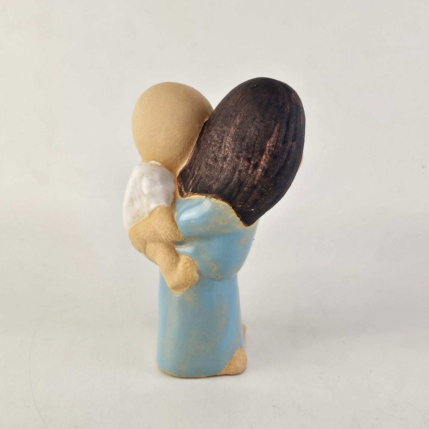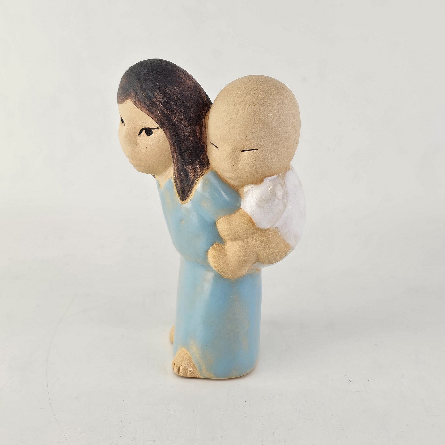 Text zugänglich auf Dänische: Figur i keramik med motiv af en pige med lys hud og brunt hår, som har et barn på ryggen.