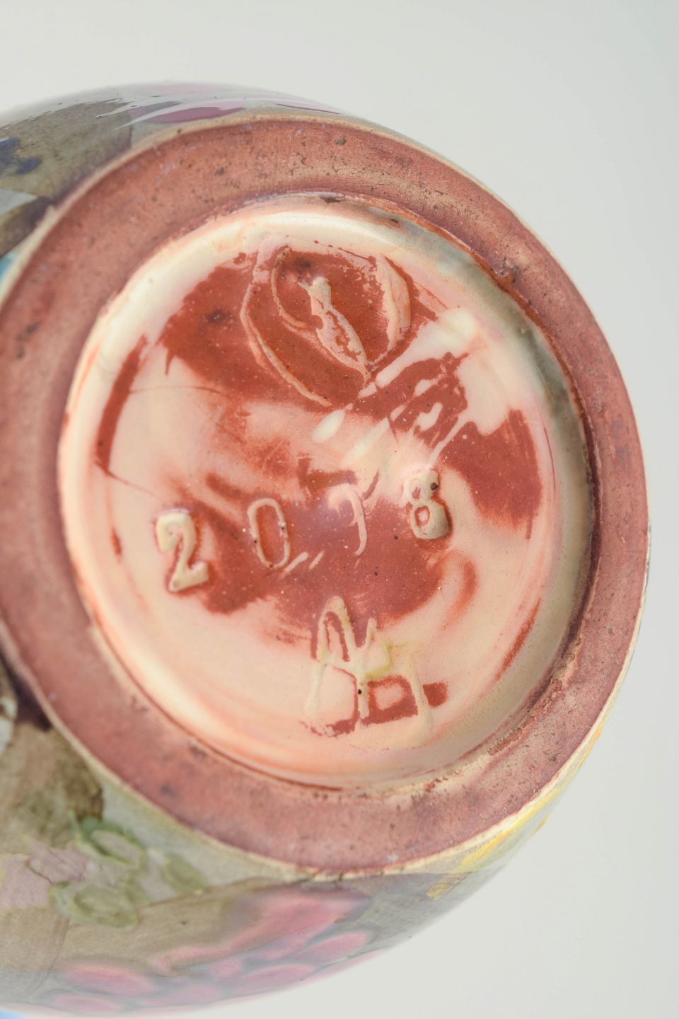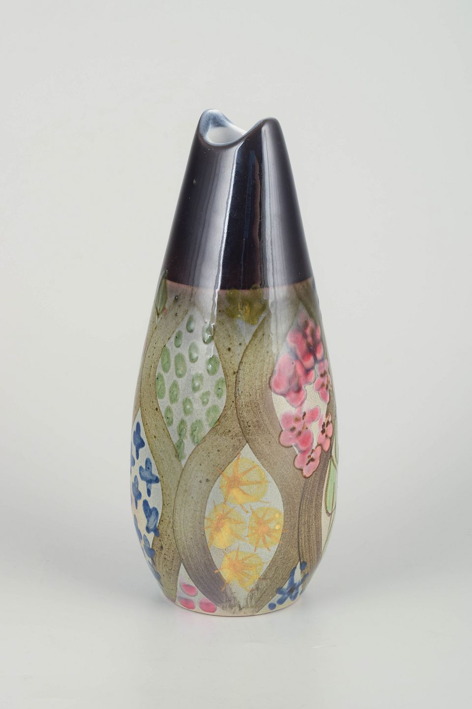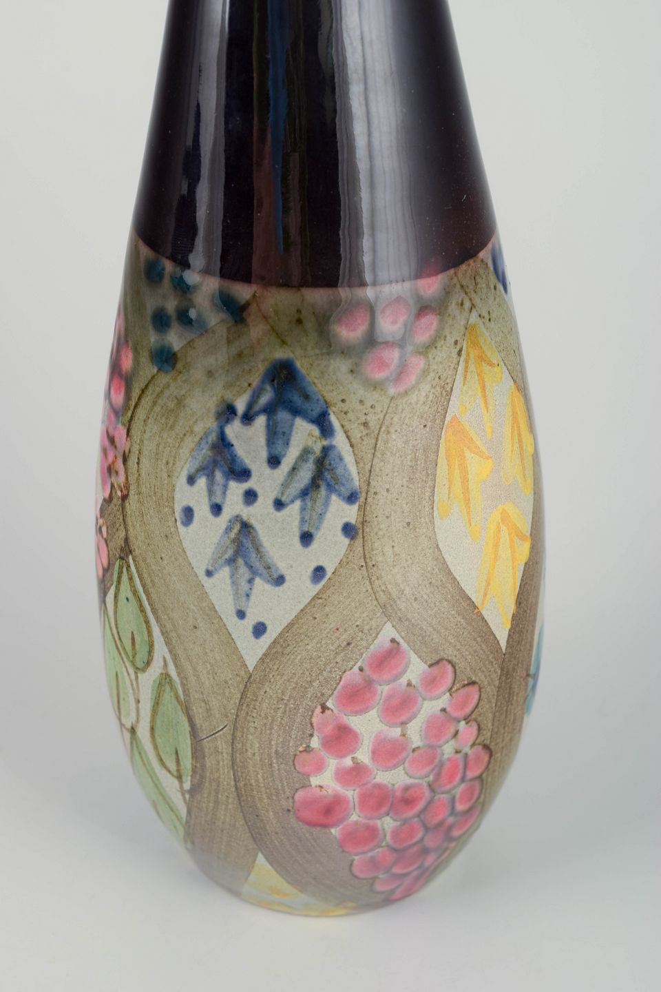 Hånddekoreret stentøjsvase med karakteristisk organisk form og farverig blomsterdekoration i blå, rosa, gul og grøn — fra serien “Mimosa”, designet af Ingrid Atterberg for Upsala Ekeby i 1960’erne.